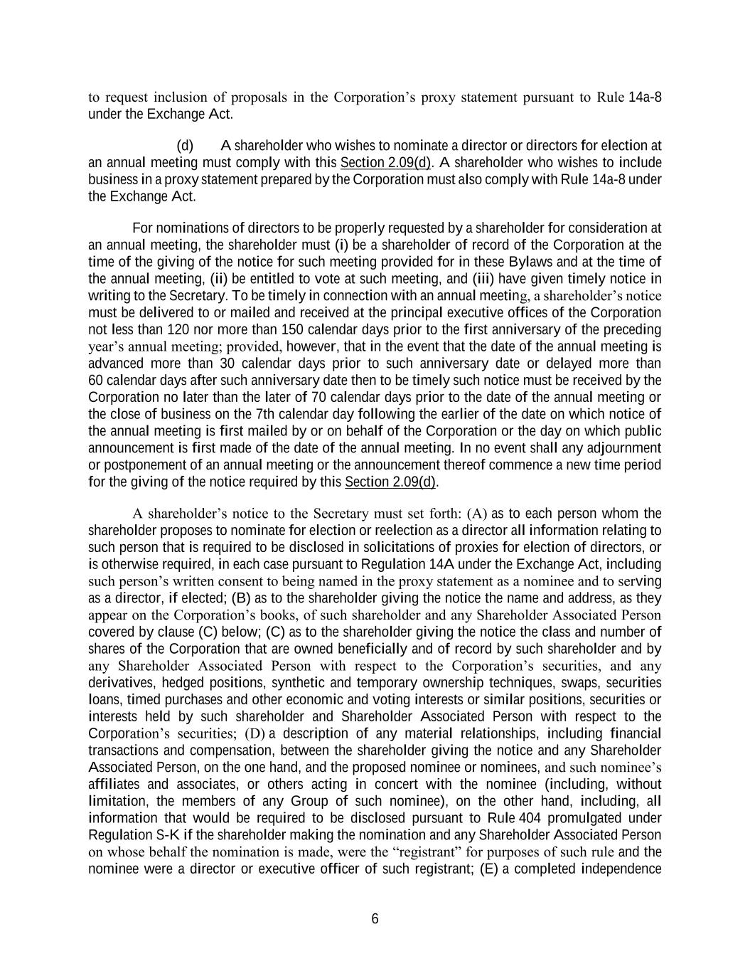6 to request inclusion of proposals in the Corporation’s proxy statement pursuant to Rule 14a-8 under the Exchange Act. (d) A shareholder who wishes to nominate a director or directors for election at an annual meeting must comply with this Section 2.09(d). A shareholder who wishes to include business in a proxy statement prepared by the Corporation must also comply with Rule 14a-8 under the Exchange Act. For nominations of directors to be properly requested by a shareholder for consideration at an annual meeting, the shareholder must (i) be a shareholder of record of the Corporation at the time of the giving of the notice for such meeting provided for in these Bylaws and at the time of the annual meeting, (ii) be entitled to vote at such meeting, and (iii) have given timely notice in writing to the Secretary. To be timely in connection with an annual meeting, a shareholder’s notice must be delivered to or mailed and received at the principal executive offices of the Corporation not less than 120 nor more than 150 calendar days prior to the first anniversary of the preceding year’s annual meeting; provided, however, that in the event that the date of the annual meeting is advanced more than 30 calendar days prior to such anniversary date or delayed more than 60 calendar days after such anniversary date then to be timely such notice must be received by the Corporation no later than the later of 70 calendar days prior to the date of the annual meeting or the close of business on the 7th calendar day following the earlier of the date on which notice of the annual meeting is first mailed by or on behalf of the Corporation or the day on which public announcement is first made of the date of the annual meeting. In no event shall any adjournment or postponement of an annual meeting or the announcement thereof commence a new time period for the giving of the notice required by this Section 2.09(d). A shareholder’s notice to the Secretary must set forth: (A) as to each person whom the shareholder proposes to nominate for election or reelection as a director all information relating to such person that is required to be disclosed in solicitations of proxies for election of directors, or is otherwise required, in each case pursuant to Regulation 14A under the Exchange Act, including such person’s written consent to being named in the proxy statement as a nominee and to serving as a director, if elected; (B) as to the shareholder giving the notice the name and address, as they appear on the Corporation’s books, of such shareholder and any Shareholder Associated Person covered by clause (C) below; (C) as to the shareholder giving the notice the class and number of shares of the Corporation that are owned beneficially and of record by such shareholder and by any Shareholder Associated Person with respect to the Corporation’s securities, and any derivatives, hedged positions, synthetic and temporary ownership techniques, swaps, securities loans, timed purchases and other economic and voting interests or similar positions, securities or interests held by such shareholder and Shareholder Associated Person with respect to the Corporation’s securities; (D) a description of any material relationships, including financial transactions and compensation, between the shareholder giving the notice and any Shareholder Associated Person, on the one hand, and the proposed nominee or nominees, and such nominee’s affiliates and associates, or others acting in concert with the nominee (including, without limitation, the members of any Group of such nominee), on the other hand, including, all information that would be required to be disclosed pursuant to Rule 404 promulgated under Regulation S-K if the shareholder making the nomination and any Shareholder Associated Person on whose behalf the nomination is made, were the “registrant” for purposes of such rule and the nominee were a director or executive officer of such registrant; (E) a completed independence