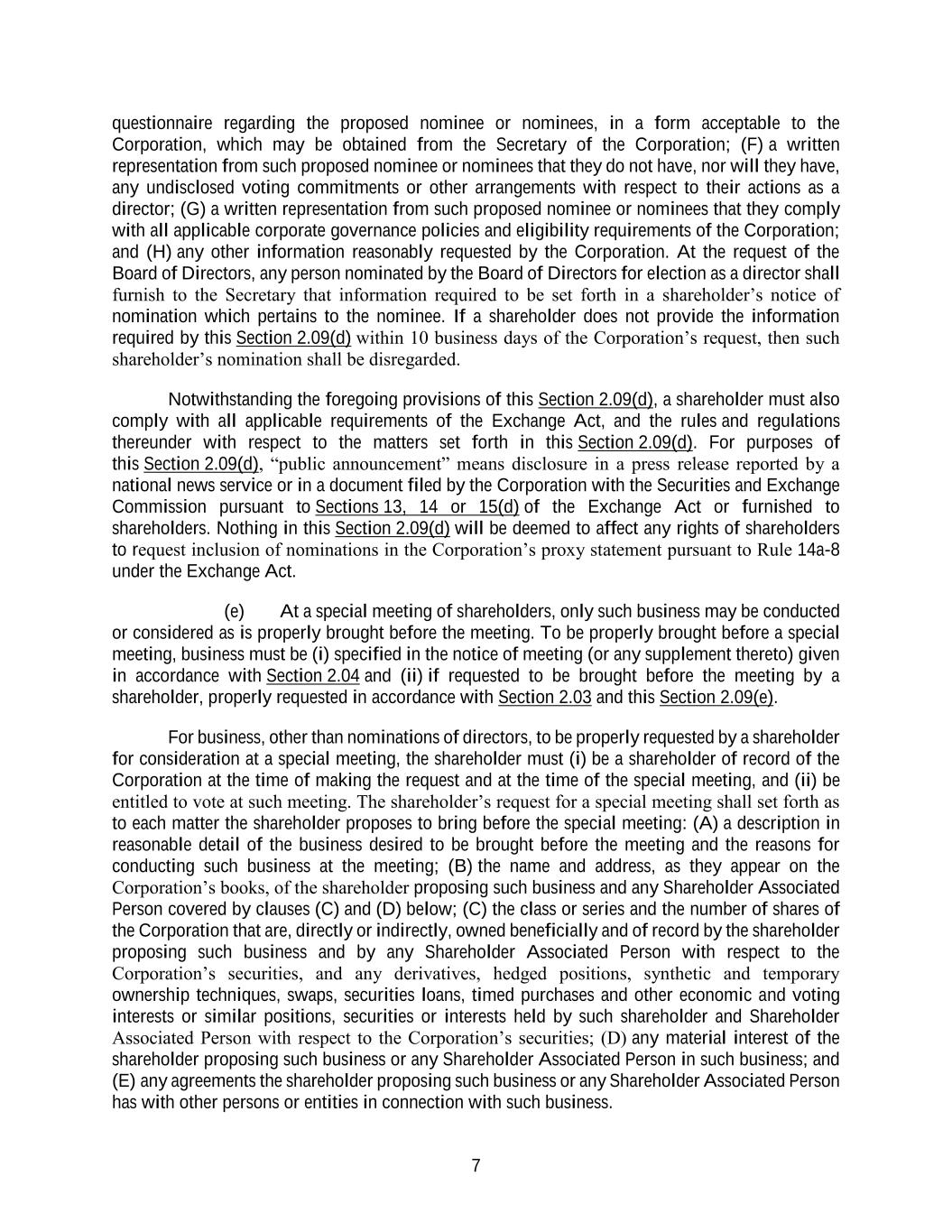 7 questionnaire regarding the proposed nominee or nominees, in a form acceptable to the Corporation, which may be obtained from the Secretary of the Corporation; (F) a written representation from such proposed nominee or nominees that they do not have, nor will they have, any undisclosed voting commitments or other arrangements with respect to their actions as a director; (G) a written representation from such proposed nominee or nominees that they comply with all applicable corporate governance policies and eligibility requirements of the Corporation; and (H) any other information reasonably requested by the Corporation. At the request of the Board of Directors, any person nominated by the Board of Directors for election as a director shall furnish to the Secretary that information required to be set forth in a shareholder’s notice of nomination which pertains to the nominee. If a shareholder does not provide the information required by this Section 2.09(d) within 10 business days of the Corporation’s request, then such shareholder’s nomination shall be disregarded. Notwithstanding the foregoing provisions of this Section 2.09(d), a shareholder must also comply with all applicable requirements of the Exchange Act, and the rules and regulations thereunder with respect to the matters set forth in this Section 2.09(d). For purposes of this Section 2.09(d), “public announcement” means disclosure in a press release reported by a national news service or in a document filed by the Corporation with the Securities and Exchange Commission pursuant to Sections 13, 14 or 15(d) of the Exchange Act or furnished to shareholders. Nothing in this Section 2.09(d) will be deemed to affect any rights of shareholders to request inclusion of nominations in the Corporation’s proxy statement pursuant to Rule 14a-8 under the Exchange Act. (e) At a special meeting of shareholders, only such business may be conducted or considered as is properly brought before the meeting. To be properly brought before a special meeting, business must be (i) specified in the notice of meeting (or any supplement thereto) given in accordance with Section 2.04 and (ii) if requested to be brought before the meeting by a shareholder, properly requested in accordance with Section 2.03 and this Section 2.09(e). For business, other than nominations of directors, to be properly requested by a shareholder for consideration at a special meeting, the shareholder must (i) be a shareholder of record of the Corporation at the time of making the request and at the time of the special meeting, and (ii) be entitled to vote at such meeting. The shareholder’s request for a special meeting shall set forth as to each matter the shareholder proposes to bring before the special meeting: (A) a description in reasonable detail of the business desired to be brought before the meeting and the reasons for conducting such business at the meeting; (B) the name and address, as they appear on the Corporation’s books, of the shareholder proposing such business and any Shareholder Associated Person covered by clauses (C) and (D) below; (C) the class or series and the number of shares of the Corporation that are, directly or indirectly, owned beneficially and of record by the shareholder proposing such business and by any Shareholder Associated Person with respect to the Corporation’s securities, and any derivatives, hedged positions, synthetic and temporary ownership techniques, swaps, securities loans, timed purchases and other economic and voting interests or similar positions, securities or interests held by such shareholder and Shareholder Associated Person with respect to the Corporation’s securities; (D) any material interest of the shareholder proposing such business or any Shareholder Associated Person in such business; and (E) any agreements the shareholder proposing such business or any Shareholder Associated Person has with other persons or entities in connection with such business.