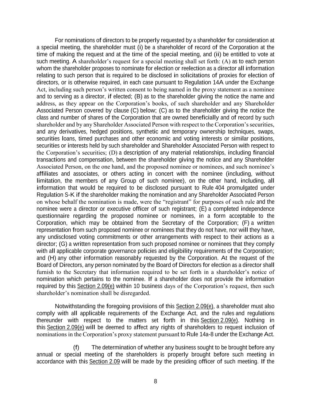 8 For nominations of directors to be properly requested by a shareholder for consideration at a special meeting, the shareholder must (i) be a shareholder of record of the Corporation at the time of making the request and at the time of the special meeting, and (ii) be entitled to vote at such meeting. A shareholder’s request for a special meeting shall set forth: (A) as to each person whom the shareholder proposes to nominate for election or reelection as a director all information relating to such person that is required to be disclosed in solicitations of proxies for election of directors, or is otherwise required, in each case pursuant to Regulation 14A under the Exchange Act, including such person’s written consent to being named in the proxy statement as a nominee and to serving as a director, if elected; (B) as to the shareholder giving the notice the name and address, as they appear on the Corporation’s books, of such shareholder and any Shareholder Associated Person covered by clause (C) below; (C) as to the shareholder giving the notice the class and number of shares of the Corporation that are owned beneficially and of record by such shareholder and by any Shareholder Associated Person with respect to the Corporation’s securities, and any derivatives, hedged positions, synthetic and temporary ownership techniques, swaps, securities loans, timed purchases and other economic and voting interests or similar positions, securities or interests held by such shareholder and Shareholder Associated Person with respect to the Corporation’s securities; (D) a description of any material relationships, including financial transactions and compensation, between the shareholder giving the notice and any Shareholder Associated Person, on the one hand, and the proposed nominee or nominees, and such nominee’s affiliates and associates, or others acting in concert with the nominee (including, without limitation, the members of any Group of such nominee), on the other hand, including, all information that would be required to be disclosed pursuant to Rule 404 promulgated under Regulation S-K if the shareholder making the nomination and any Shareholder Associated Person on whose behalf the nomination is made, were the “registrant” for purposes of such rule and the nominee were a director or executive officer of such registrant; (E) a completed independence questionnaire regarding the proposed nominee or nominees, in a form acceptable to the Corporation, which may be obtained from the Secretary of the Corporation; (F) a written representation from such proposed nominee or nominees that they do not have, nor will they have, any undisclosed voting commitments or other arrangements with respect to their actions as a director; (G) a written representation from such proposed nominee or nominees that they comply with all applicable corporate governance policies and eligibility requirements of the Corporation; and (H) any other information reasonably requested by the Corporation. At the request of the Board of Directors, any person nominated by the Board of Directors for election as a director shall furnish to the Secretary that information required to be set forth in a shareholder’s notice of nomination which pertains to the nominee. If a shareholder does not provide the information required by this Section 2.09(e) within 10 business days of the Corporation’s request, then such shareholder’s nomination shall be disregarded. Notwithstanding the foregoing provisions of this Section 2.09(e), a shareholder must also comply with all applicable requirements of the Exchange Act, and the rules and regulations thereunder with respect to the matters set forth in this Section 2.09(e). Nothing in this Section 2.09(e) will be deemed to affect any rights of shareholders to request inclusion of nominations in the Corporation’s proxy statement pursuant to Rule 14a-8 under the Exchange Act. (f) The determination of whether any business sought to be brought before any annual or special meeting of the shareholders is properly brought before such meeting in accordance with this Section 2.09 will be made by the presiding officer of such meeting. If the