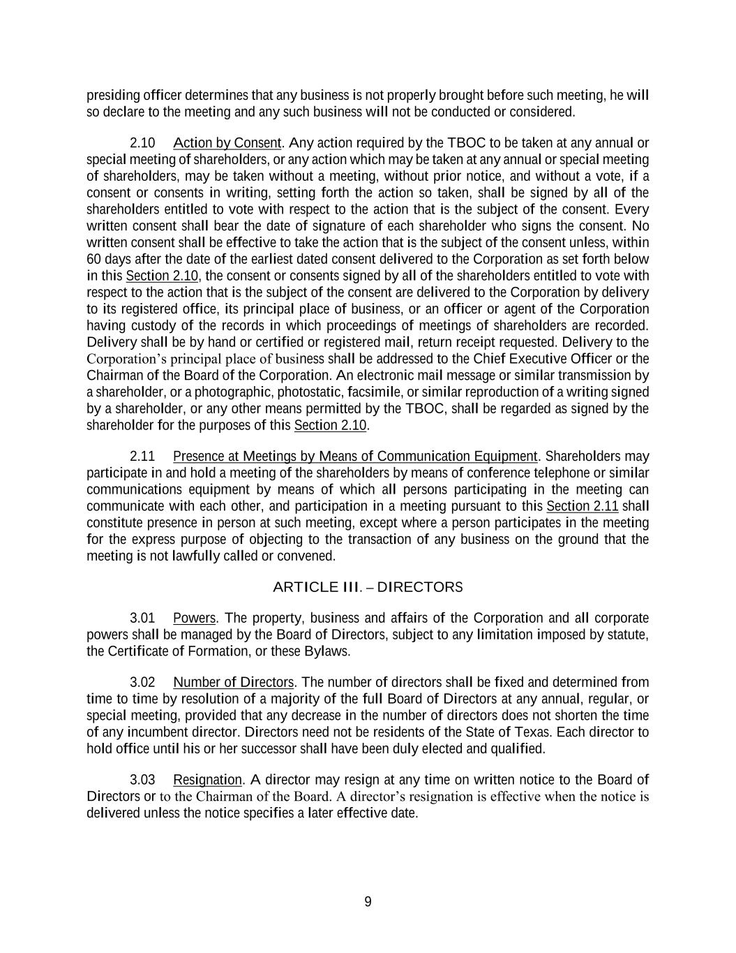 9 presiding officer determines that any business is not properly brought before such meeting, he will so declare to the meeting and any such business will not be conducted or considered. 2.10 Action by Consent. Any action required by the TBOC to be taken at any annual or special meeting of shareholders, or any action which may be taken at any annual or special meeting of shareholders, may be taken without a meeting, without prior notice, and without a vote, if a consent or consents in writing, setting forth the action so taken, shall be signed by all of the shareholders entitled to vote with respect to the action that is the subject of the consent. Every written consent shall bear the date of signature of each shareholder who signs the consent. No written consent shall be effective to take the action that is the subject of the consent unless, within 60 days after the date of the earliest dated consent delivered to the Corporation as set forth below in this Section 2.10, the consent or consents signed by all of the shareholders entitled to vote with respect to the action that is the subject of the consent are delivered to the Corporation by delivery to its registered office, its principal place of business, or an officer or agent of the Corporation having custody of the records in which proceedings of meetings of shareholders are recorded. Delivery shall be by hand or certified or registered mail, return receipt requested. Delivery to the Corporation’s principal place of business shall be addressed to the Chief Executive Officer or the Chairman of the Board of the Corporation. An electronic mail message or similar transmission by a shareholder, or a photographic, photostatic, facsimile, or similar reproduction of a writing signed by a shareholder, or any other means permitted by the TBOC, shall be regarded as signed by the shareholder for the purposes of this Section 2.10. 2.11 Presence at Meetings by Means of Communication Equipment. Shareholders may participate in and hold a meeting of the shareholders by means of conference telephone or similar communications equipment by means of which all persons participating in the meeting can communicate with each other, and participation in a meeting pursuant to this Section 2.11 shall constitute presence in person at such meeting, except where a person participates in the meeting for the express purpose of objecting to the transaction of any business on the ground that the meeting is not lawfully called or convened. ARTICLE III. – DIRECTORS 3.01 Powers. The property, business and affairs of the Corporation and all corporate powers shall be managed by the Board of Directors, subject to any limitation imposed by statute, the Certificate of Formation, or these Bylaws. 3.02 Number of Directors. The number of directors shall be fixed and determined from time to time by resolution of a majority of the full Board of Directors at any annual, regular, or special meeting, provided that any decrease in the number of directors does not shorten the time of any incumbent director. Directors need not be residents of the State of Texas. Each director to hold office until his or her successor shall have been duly elected and qualified. 3.03 Resignation. A director may resign at any time on written notice to the Board of Directors or to the Chairman of the Board. A director’s resignation is effective when the notice is delivered unless the notice specifies a later effective date.