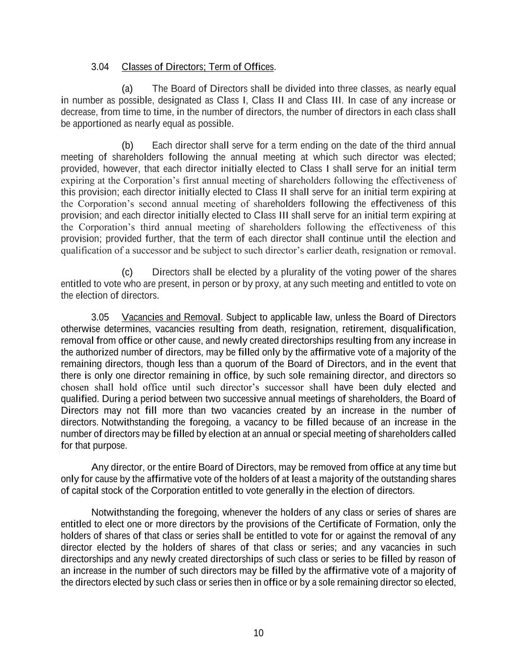 10 3.04 Classes of Directors; Term of Offices. (a) The Board of Directors shall be divided into three classes, as nearly equal in number as possible, designated as Class I, Class II and Class III. In case of any increase or decrease, from time to time, in the number of directors, the number of directors in each class shall be apportioned as nearly equal as possible. (b) Each director shall serve for a term ending on the date of the third annual meeting of shareholders following the annual meeting at which such director was elected; provided, however, that each director initially elected to Class I shall serve for an initial term expiring at the Corporation’s first annual meeting of shareholders following the effectiveness of this provision; each director initially elected to Class II shall serve for an initial term expiring at the Corporation’s second annual meeting of shareholders following the effectiveness of this provision; and each director initially elected to Class III shall serve for an initial term expiring at the Corporation’s third annual meeting of shareholders following the effectiveness of this provision; provided further, that the term of each director shall continue until the election and qualification of a successor and be subject to such director’s earlier death, resignation or removal. (c) Directors shall be elected by a plurality of the voting power of the shares entitled to vote who are present, in person or by proxy, at any such meeting and entitled to vote on the election of directors. 3.05 Vacancies and Removal. Subject to applicable law, unless the Board of Directors otherwise determines, vacancies resulting from death, resignation, retirement, disqualification, removal from office or other cause, and newly created directorships resulting from any increase in the authorized number of directors, may be filled only by the affirmative vote of a majority of the remaining directors, though less than a quorum of the Board of Directors, and in the event that there is only one director remaining in office, by such sole remaining director, and directors so chosen shall hold office until such director’s successor shall have been duly elected and qualified. During a period between two successive annual meetings of shareholders, the Board of Directors may not fill more than two vacancies created by an increase in the number of directors. Notwithstanding the foregoing, a vacancy to be filled because of an increase in the number of directors may be filled by election at an annual or special meeting of shareholders called for that purpose. Any director, or the entire Board of Directors, may be removed from office at any time but only for cause by the affirmative vote of the holders of at least a majority of the outstanding shares of capital stock of the Corporation entitled to vote generally in the election of directors. Notwithstanding the foregoing, whenever the holders of any class or series of shares are entitled to elect one or more directors by the provisions of the Certificate of Formation, only the holders of shares of that class or series shall be entitled to vote for or against the removal of any director elected by the holders of shares of that class or series; and any vacancies in such directorships and any newly created directorships of such class or series to be filled by reason of an increase in the number of such directors may be filled by the affirmative vote of a majority of the directors elected by such class or series then in office or by a sole remaining director so elected,