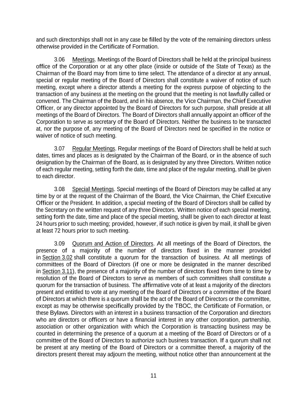 11 and such directorships shall not in any case be filled by the vote of the remaining directors unless otherwise provided in the Certificate of Formation. 3.06 Meetings. Meetings of the Board of Directors shall be held at the principal business office of the Corporation or at any other place (inside or outside of the State of Texas) as the Chairman of the Board may from time to time select. The attendance of a director at any annual, special or regular meeting of the Board of Directors shall constitute a waiver of notice of such meeting, except where a director attends a meeting for the express purpose of objecting to the transaction of any business at the meeting on the ground that the meeting is not lawfully called or convened. The Chairman of the Board, and in his absence, the Vice Chairman, the Chief Executive Officer, or any director appointed by the Board of Directors for such purpose, shall preside at all meetings of the Board of Directors. The Board of Directors shall annually appoint an officer of the Corporation to serve as secretary of the Board of Directors. Neither the business to be transacted at, nor the purpose of, any meeting of the Board of Directors need be specified in the notice or waiver of notice of such meeting. 3.07 Regular Meetings. Regular meetings of the Board of Directors shall be held at such dates, times and places as is designated by the Chairman of the Board, or in the absence of such designation by the Chairman of the Board, as is designated by any three Directors. Written notice of each regular meeting, setting forth the date, time and place of the regular meeting, shall be given to each director. 3.08 Special Meetings. Special meetings of the Board of Directors may be called at any time by or at the request of the Chairman of the Board, the Vice Chairman, the Chief Executive Officer or the President. In addition, a special meeting of the Board of Directors shall be called by the Secretary on the written request of any three Directors. Written notice of each special meeting, setting forth the date, time and place of the special meeting, shall be given to each director at least 24 hours prior to such meeting; provided, however, if such notice is given by mail, it shall be given at least 72 hours prior to such meeting. 3.09 Quorum and Action of Directors. At all meetings of the Board of Directors, the presence of a majority of the number of directors fixed in the manner provided in Section 3.02 shall constitute a quorum for the transaction of business. At all meetings of committees of the Board of Directors (if one or more be designated in the manner described in Section 3.11), the presence of a majority of the number of directors fixed from time to time by resolution of the Board of Directors to serve as members of such committees shall constitute a quorum for the transaction of business. The affirmative vote of at least a majority of the directors present and entitled to vote at any meeting of the Board of Directors or a committee of the Board of Directors at which there is a quorum shall be the act of the Board of Directors or the committee, except as may be otherwise specifically provided by the TBOC, the Certificate of Formation, or these Bylaws. Directors with an interest in a business transaction of the Corporation and directors who are directors or officers or have a financial interest in any other corporation, partnership, association or other organization with which the Corporation is transacting business may be counted in determining the presence of a quorum at a meeting of the Board of Directors or of a committee of the Board of Directors to authorize such business transaction. If a quorum shall not be present at any meeting of the Board of Directors or a committee thereof, a majority of the directors present thereat may adjourn the meeting, without notice other than announcement at the