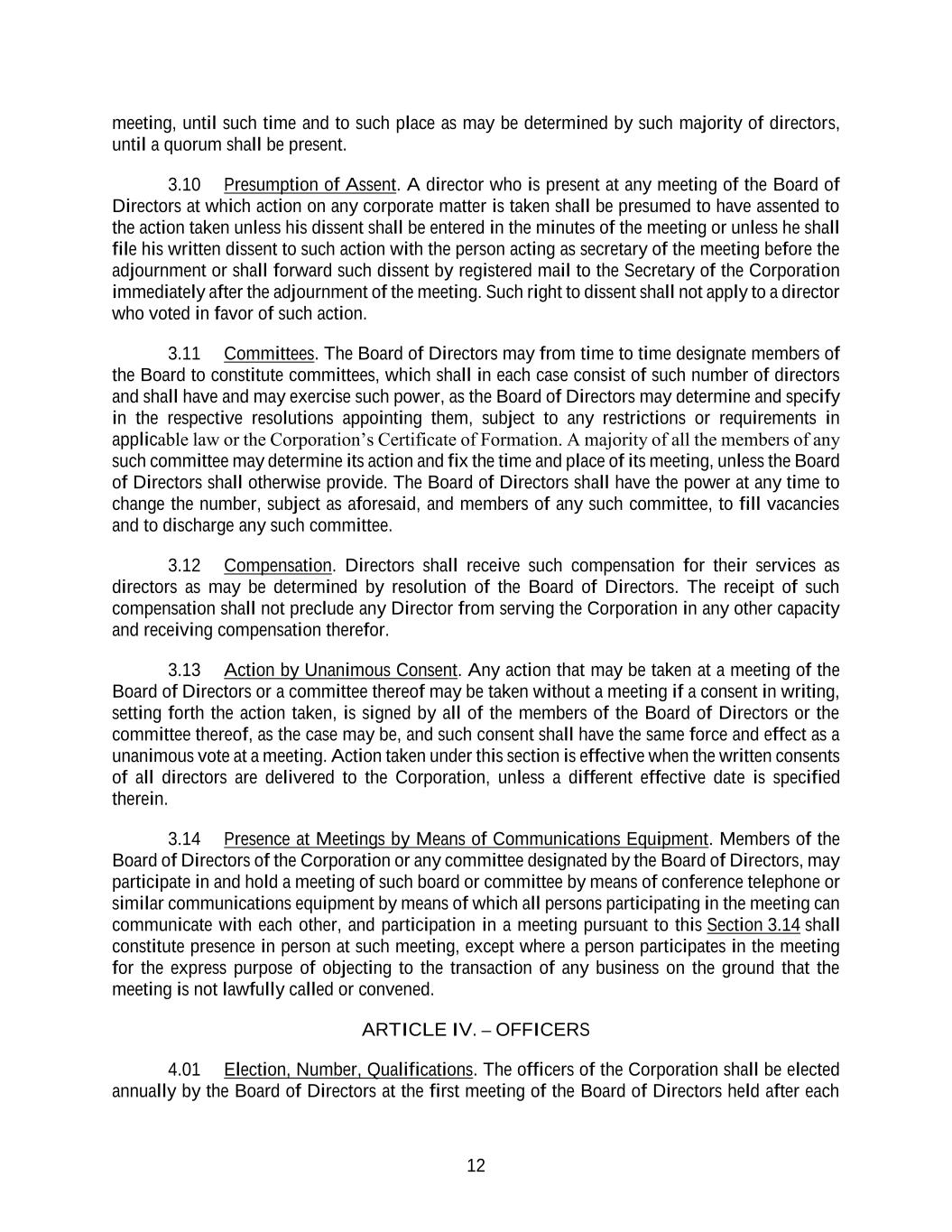 12 meeting, until such time and to such place as may be determined by such majority of directors, until a quorum shall be present. 3.10 Presumption of Assent. A director who is present at any meeting of the Board of Directors at which action on any corporate matter is taken shall be presumed to have assented to the action taken unless his dissent shall be entered in the minutes of the meeting or unless he shall file his written dissent to such action with the person acting as secretary of the meeting before the adjournment or shall forward such dissent by registered mail to the Secretary of the Corporation immediately after the adjournment of the meeting. Such right to dissent shall not apply to a director who voted in favor of such action. 3.11 Committees. The Board of Directors may from time to time designate members of the Board to constitute committees, which shall in each case consist of such number of directors and shall have and may exercise such power, as the Board of Directors may determine and specify in the respective resolutions appointing them, subject to any restrictions or requirements in applicable law or the Corporation’s Certificate of Formation. A majority of all the members of any such committee may determine its action and fix the time and place of its meeting, unless the Board of Directors shall otherwise provide. The Board of Directors shall have the power at any time to change the number, subject as aforesaid, and members of any such committee, to fill vacancies and to discharge any such committee. 3.12 Compensation. Directors shall receive such compensation for their services as directors as may be determined by resolution of the Board of Directors. The receipt of such compensation shall not preclude any Director from serving the Corporation in any other capacity and receiving compensation therefor. 3.13 Action by Unanimous Consent. Any action that may be taken at a meeting of the Board of Directors or a committee thereof may be taken without a meeting if a consent in writing, setting forth the action taken, is signed by all of the members of the Board of Directors or the committee thereof, as the case may be, and such consent shall have the same force and effect as a unanimous vote at a meeting. Action taken under this section is effective when the written consents of all directors are delivered to the Corporation, unless a different effective date is specified therein. 3.14 Presence at Meetings by Means of Communications Equipment. Members of the Board of Directors of the Corporation or any committee designated by the Board of Directors, may participate in and hold a meeting of such board or committee by means of conference telephone or similar communications equipment by means of which all persons participating in the meeting can communicate with each other, and participation in a meeting pursuant to this Section 3.14 shall constitute presence in person at such meeting, except where a person participates in the meeting for the express purpose of objecting to the transaction of any business on the ground that the meeting is not lawfully called or convened. ARTICLE IV. – OFFICERS 4.01 Election, Number, Qualifications. The officers of the Corporation shall be elected annually by the Board of Directors at the first meeting of the Board of Directors held after each