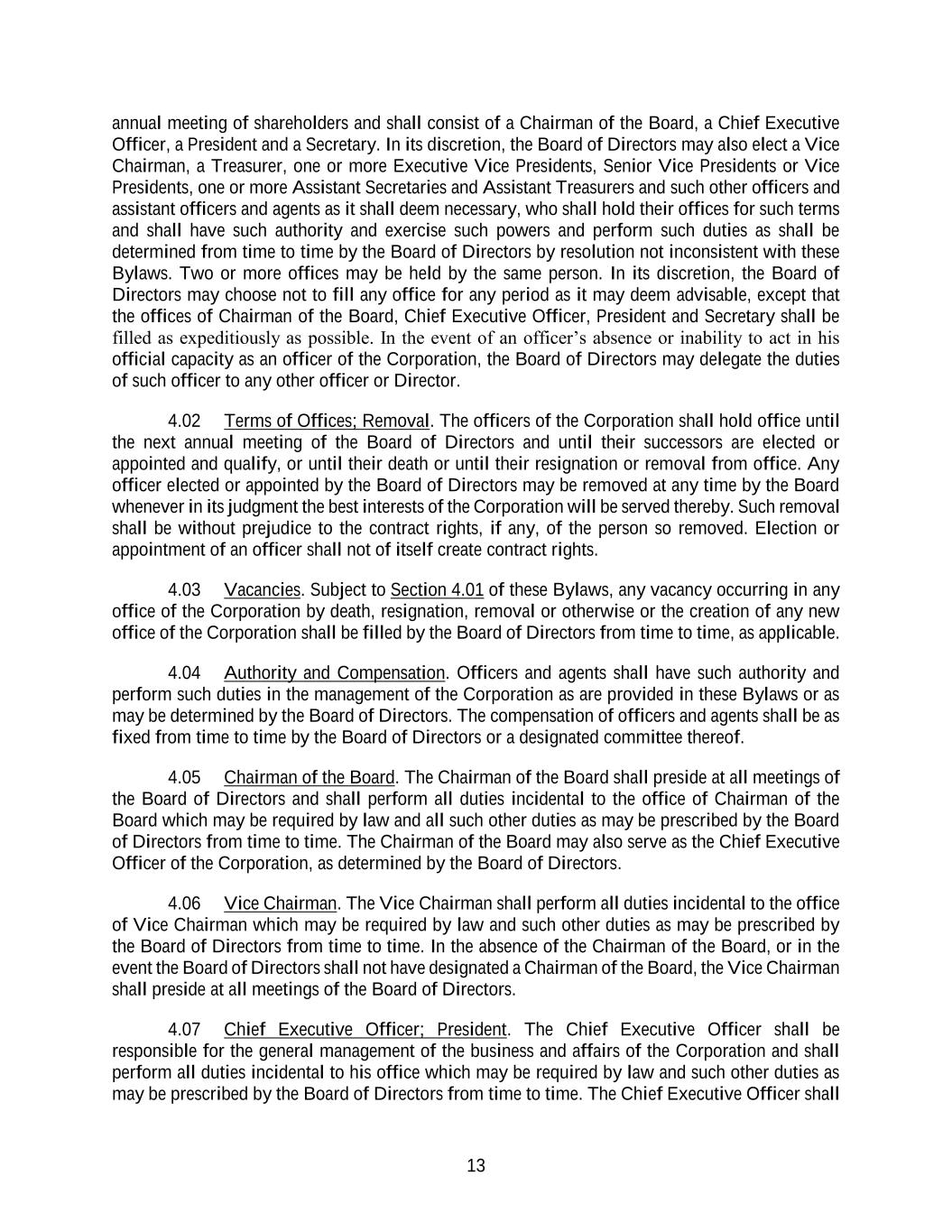13 annual meeting of shareholders and shall consist of a Chairman of the Board, a Chief Executive Officer, a President and a Secretary. In its discretion, the Board of Directors may also elect a Vice Chairman, a Treasurer, one or more Executive Vice Presidents, Senior Vice Presidents or Vice Presidents, one or more Assistant Secretaries and Assistant Treasurers and such other officers and assistant officers and agents as it shall deem necessary, who shall hold their offices for such terms and shall have such authority and exercise such powers and perform such duties as shall be determined from time to time by the Board of Directors by resolution not inconsistent with these Bylaws. Two or more offices may be held by the same person. In its discretion, the Board of Directors may choose not to fill any office for any period as it may deem advisable, except that the offices of Chairman of the Board, Chief Executive Officer, President and Secretary shall be filled as expeditiously as possible. In the event of an officer’s absence or inability to act in his official capacity as an officer of the Corporation, the Board of Directors may delegate the duties of such officer to any other officer or Director. 4.02 Terms of Offices; Removal. The officers of the Corporation shall hold office until the next annual meeting of the Board of Directors and until their successors are elected or appointed and qualify, or until their death or until their resignation or removal from office. Any officer elected or appointed by the Board of Directors may be removed at any time by the Board whenever in its judgment the best interests of the Corporation will be served thereby. Such removal shall be without prejudice to the contract rights, if any, of the person so removed. Election or appointment of an officer shall not of itself create contract rights. 4.03 Vacancies. Subject to Section 4.01 of these Bylaws, any vacancy occurring in any office of the Corporation by death, resignation, removal or otherwise or the creation of any new office of the Corporation shall be filled by the Board of Directors from time to time, as applicable. 4.04 Authority and Compensation. Officers and agents shall have such authority and perform such duties in the management of the Corporation as are provided in these Bylaws or as may be determined by the Board of Directors. The compensation of officers and agents shall be as fixed from time to time by the Board of Directors or a designated committee thereof. 4.05 Chairman of the Board. The Chairman of the Board shall preside at all meetings of the Board of Directors and shall perform all duties incidental to the office of Chairman of the Board which may be required by law and all such other duties as may be prescribed by the Board of Directors from time to time. The Chairman of the Board may also serve as the Chief Executive Officer of the Corporation, as determined by the Board of Directors. 4.06 Vice Chairman. The Vice Chairman shall perform all duties incidental to the office of Vice Chairman which may be required by law and such other duties as may be prescribed by the Board of Directors from time to time. In the absence of the Chairman of the Board, or in the event the Board of Directors shall not have designated a Chairman of the Board, the Vice Chairman shall preside at all meetings of the Board of Directors. 4.07 Chief Executive Officer; President. The Chief Executive Officer shall be responsible for the general management of the business and affairs of the Corporation and shall perform all duties incidental to his office which may be required by law and such other duties as may be prescribed by the Board of Directors from time to time. The Chief Executive Officer shall