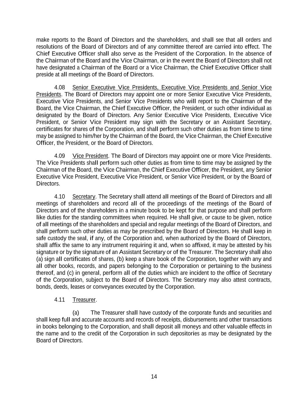14 make reports to the Board of Directors and the shareholders, and shall see that all orders and resolutions of the Board of Directors and of any committee thereof are carried into effect. The Chief Executive Officer shall also serve as the President of the Corporation. In the absence of the Chairman of the Board and the Vice Chairman, or in the event the Board of Directors shall not have designated a Chairman of the Board or a Vice Chairman, the Chief Executive Officer shall preside at all meetings of the Board of Directors. 4.08 Senior Executive Vice Presidents, Executive Vice Presidents and Senior Vice Presidents. The Board of Directors may appoint one or more Senior Executive Vice Presidents, Executive Vice Presidents, and Senior Vice Presidents who will report to the Chairman of the Board, the Vice Chairman, the Chief Executive Officer, the President, or such other individual as designated by the Board of Directors. Any Senior Executive Vice Presidents, Executive Vice President, or Senior Vice President may sign with the Secretary or an Assistant Secretary, certificates for shares of the Corporation, and shall perform such other duties as from time to time may be assigned to him/her by the Chairman of the Board, the Vice Chairman, the Chief Executive Officer, the President, or the Board of Directors. 4.09 Vice President. The Board of Directors may appoint one or more Vice Presidents. The Vice Presidents shall perform such other duties as from time to time may be assigned by the Chairman of the Board, the Vice Chairman, the Chief Executive Officer, the President, any Senior Executive Vice President, Executive Vice President, or Senior Vice President, or by the Board of Directors. 4.10 Secretary. The Secretary shall attend all meetings of the Board of Directors and all meetings of shareholders and record all of the proceedings of the meetings of the Board of Directors and of the shareholders in a minute book to be kept for that purpose and shall perform like duties for the standing committees when required. He shall give, or cause to be given, notice of all meetings of the shareholders and special and regular meetings of the Board of Directors, and shall perform such other duties as may be prescribed by the Board of Directors. He shall keep in safe custody the seal, if any, of the Corporation and, when authorized by the Board of Directors, shall affix the same to any instrument requiring it and, when so affixed, it may be attested by his signature or by the signature of an Assistant Secretary or of the Treasurer. The Secretary shall also (a) sign all certificates of shares, (b) keep a share book of the Corporation, together with any and all other books, records, and papers belonging to the Corporation or pertaining to the business thereof, and (c) in general, perform all of the duties which are incident to the office of Secretary of the Corporation, subject to the Board of Directors. The Secretary may also attest contracts, bonds, deeds, leases or conveyances executed by the Corporation. 4.11 Treasurer. (a) The Treasurer shall have custody of the corporate funds and securities and shall keep full and accurate accounts and records of receipts, disbursements and other transactions in books belonging to the Corporation, and shall deposit all moneys and other valuable effects in the name and to the credit of the Corporation in such depositories as may be designated by the Board of Directors.