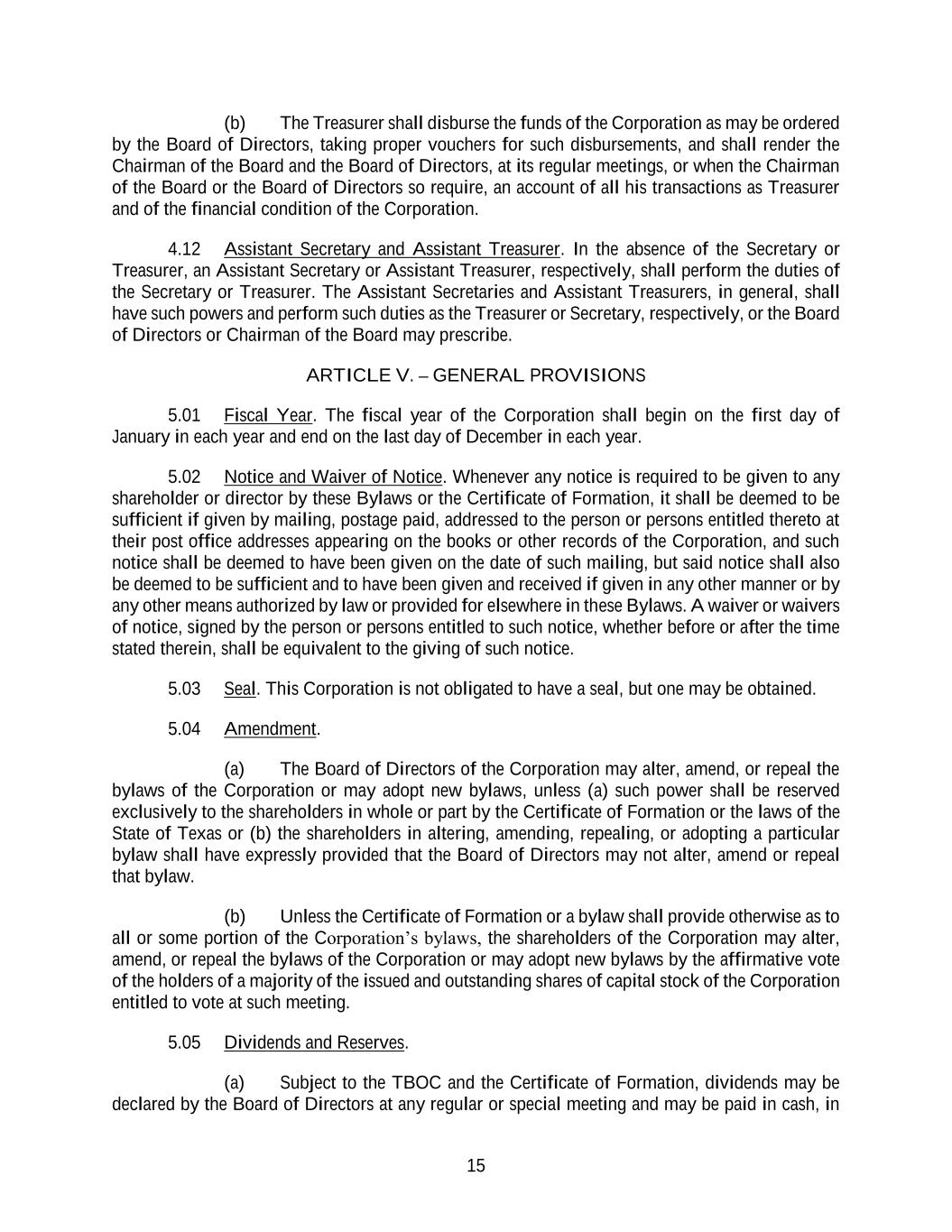15 (b) The Treasurer shall disburse the funds of the Corporation as may be ordered by the Board of Directors, taking proper vouchers for such disbursements, and shall render the Chairman of the Board and the Board of Directors, at its regular meetings, or when the Chairman of the Board or the Board of Directors so require, an account of all his transactions as Treasurer and of the financial condition of the Corporation. 4.12 Assistant Secretary and Assistant Treasurer. In the absence of the Secretary or Treasurer, an Assistant Secretary or Assistant Treasurer, respectively, shall perform the duties of the Secretary or Treasurer. The Assistant Secretaries and Assistant Treasurers, in general, shall have such powers and perform such duties as the Treasurer or Secretary, respectively, or the Board of Directors or Chairman of the Board may prescribe. ARTICLE V. – GENERAL PROVISIONS 5.01 Fiscal Year. The fiscal year of the Corporation shall begin on the first day of January in each year and end on the last day of December in each year. 5.02 Notice and Waiver of Notice. Whenever any notice is required to be given to any shareholder or director by these Bylaws or the Certificate of Formation, it shall be deemed to be sufficient if given by mailing, postage paid, addressed to the person or persons entitled thereto at their post office addresses appearing on the books or other records of the Corporation, and such notice shall be deemed to have been given on the date of such mailing, but said notice shall also be deemed to be sufficient and to have been given and received if given in any other manner or by any other means authorized by law or provided for elsewhere in these Bylaws. A waiver or waivers of notice, signed by the person or persons entitled to such notice, whether before or after the time stated therein, shall be equivalent to the giving of such notice. 5.03 Seal. This Corporation is not obligated to have a seal, but one may be obtained. 5.04 Amendment. (a) The Board of Directors of the Corporation may alter, amend, or repeal the bylaws of the Corporation or may adopt new bylaws, unless (a) such power shall be reserved exclusively to the shareholders in whole or part by the Certificate of Formation or the laws of the State of Texas or (b) the shareholders in altering, amending, repealing, or adopting a particular bylaw shall have expressly provided that the Board of Directors may not alter, amend or repeal that bylaw. (b) Unless the Certificate of Formation or a bylaw shall provide otherwise as to all or some portion of the Corporation’s bylaws, the shareholders of the Corporation may alter, amend, or repeal the bylaws of the Corporation or may adopt new bylaws by the affirmative vote of the holders of a majority of the issued and outstanding shares of capital stock of the Corporation entitled to vote at such meeting. 5.05 Dividends and Reserves. (a) Subject to the TBOC and the Certificate of Formation, dividends may be declared by the Board of Directors at any regular or special meeting and may be paid in cash, in