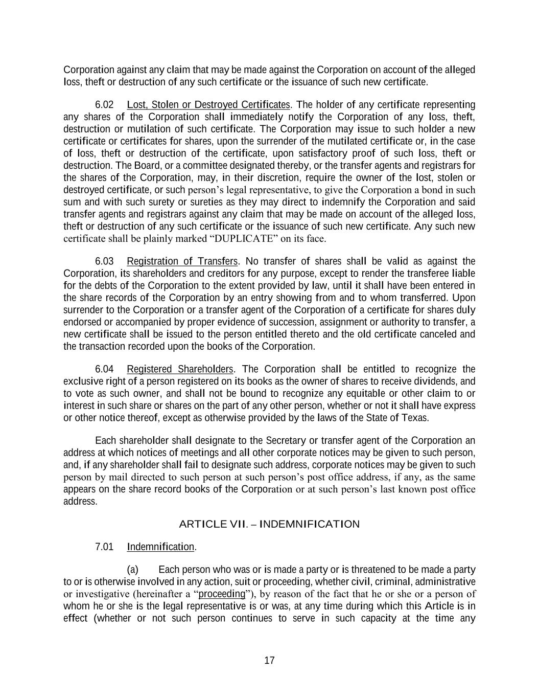 17 Corporation against any claim that may be made against the Corporation on account of the alleged loss, theft or destruction of any such certificate or the issuance of such new certificate. 6.02 Lost, Stolen or Destroyed Certificates. The holder of any certificate representing any shares of the Corporation shall immediately notify the Corporation of any loss, theft, destruction or mutilation of such certificate. The Corporation may issue to such holder a new certificate or certificates for shares, upon the surrender of the mutilated certificate or, in the case of loss, theft or destruction of the certificate, upon satisfactory proof of such loss, theft or destruction. The Board, or a committee designated thereby, or the transfer agents and registrars for the shares of the Corporation, may, in their discretion, require the owner of the lost, stolen or destroyed certificate, or such person’s legal representative, to give the Corporation a bond in such sum and with such surety or sureties as they may direct to indemnify the Corporation and said transfer agents and registrars against any claim that may be made on account of the alleged loss, theft or destruction of any such certificate or the issuance of such new certificate. Any such new certificate shall be plainly marked “DUPLICATE” on its face. 6.03 Registration of Transfers. No transfer of shares shall be valid as against the Corporation, its shareholders and creditors for any purpose, except to render the transferee liable for the debts of the Corporation to the extent provided by law, until it shall have been entered in the share records of the Corporation by an entry showing from and to whom transferred. Upon surrender to the Corporation or a transfer agent of the Corporation of a certificate for shares duly endorsed or accompanied by proper evidence of succession, assignment or authority to transfer, a new certificate shall be issued to the person entitled thereto and the old certificate canceled and the transaction recorded upon the books of the Corporation. 6.04 Registered Shareholders. The Corporation shall be entitled to recognize the exclusive right of a person registered on its books as the owner of shares to receive dividends, and to vote as such owner, and shall not be bound to recognize any equitable or other claim to or interest in such share or shares on the part of any other person, whether or not it shall have express or other notice thereof, except as otherwise provided by the laws of the State of Texas. Each shareholder shall designate to the Secretary or transfer agent of the Corporation an address at which notices of meetings and all other corporate notices may be given to such person, and, if any shareholder shall fail to designate such address, corporate notices may be given to such person by mail directed to such person at such person’s post office address, if any, as the same appears on the share record books of the Corporation or at such person’s last known post office address. ARTICLE VII. – INDEMNIFICATION 7.01 Indemnification. (a) Each person who was or is made a party or is threatened to be made a party to or is otherwise involved in any action, suit or proceeding, whether civil, criminal, administrative or investigative (hereinafter a “proceeding”), by reason of the fact that he or she or a person of whom he or she is the legal representative is or was, at any time during which this Article is in effect (whether or not such person continues to serve in such capacity at the time any
