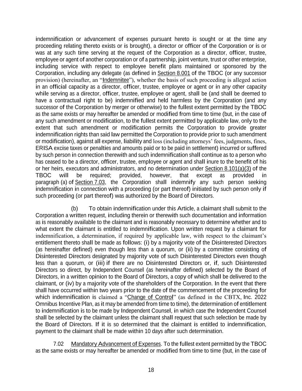 18 indemnification or advancement of expenses pursuant hereto is sought or at the time any proceeding relating thereto exists or is brought), a director or officer of the Corporation or is or was at any such time serving at the request of the Corporation as a director, officer, trustee, employee or agent of another corporation or of a partnership, joint venture, trust or other enterprise, including service with respect to employee benefit plans maintained or sponsored by the Corporation, including any delegate (as defined in Section 8.001 of the TBOC (or any successor provision) (hereinafter, an “Indemnitee”), whether the basis of such proceeding is alleged action in an official capacity as a director, officer, trustee, employee or agent or in any other capacity while serving as a director, officer, trustee, employee or agent, shall be (and shall be deemed to have a contractual right to be) indemnified and held harmless by the Corporation (and any successor of the Corporation by merger or otherwise) to the fullest extent permitted by the TBOC as the same exists or may hereafter be amended or modified from time to time (but, in the case of any such amendment or modification, to the fullest extent permitted by applicable law, only to the extent that such amendment or modification permits the Corporation to provide greater indemnification rights than said law permitted the Corporation to provide prior to such amendment or modification), against all expense, liability and loss (including attorneys’ fees, judgments, fines, ERISA excise taxes or penalties and amounts paid or to be paid in settlement) incurred or suffered by such person in connection therewith and such indemnification shall continue as to a person who has ceased to be a director, officer, trustee, employee or agent and shall inure to the benefit of his or her heirs, executors and administrators, and no determination under Section 8.101(a)(3) of the TBOC will be required; provided, however, that except as provided in paragraph (a) of Section 7.03, the Corporation shall indemnify any such person seeking indemnification in connection with a proceeding (or part thereof) initiated by such person only if such proceeding (or part thereof) was authorized by the Board of Directors. (b) To obtain indemnification under this Article, a claimant shall submit to the Corporation a written request, including therein or therewith such documentation and information as is reasonably available to the claimant and is reasonably necessary to determine whether and to what extent the claimant is entitled to indemnification. Upon written request by a claimant for indemnification, a determination, if required by applicable law, with respect to the claimant’s entitlement thereto shall be made as follows: (i) by a majority vote of the Disinterested Directors (as hereinafter defined) even though less than a quorum, or (ii) by a committee consisting of Disinterested Directors designated by majority vote of such Disinterested Directors even though less than a quorum, or (iii) if there are no Disinterested Directors or, if, such Disinterested Directors so direct, by Independent Counsel (as hereinafter defined) selected by the Board of Directors, in a written opinion to the Board of Directors, a copy of which shall be delivered to the claimant, or (iv) by a majority vote of the shareholders of the Corporation. In the event that there shall have occurred within two years prior to the date of the commencement of the proceeding for which indemnification is claimed a “Change of Control” (as defined in the CBTX, Inc. 2022 Omnibus Incentive Plan, as it may be amended from time to time), the determination of entitlement to indemnification is to be made by Independent Counsel, in which case the Independent Counsel shall be selected by the claimant unless the claimant shall request that such selection be made by the Board of Directors. If it is so determined that the claimant is entitled to indemnification, payment to the claimant shall be made within 10 days after such determination. 7.02 Mandatory Advancement of Expenses. To the fullest extent permitted by the TBOC as the same exists or may hereafter be amended or modified from time to time (but, in the case of