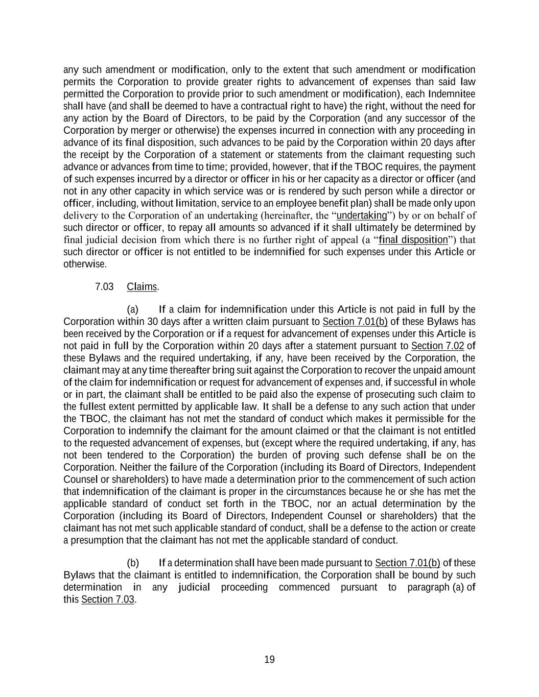 19 any such amendment or modification, only to the extent that such amendment or modification permits the Corporation to provide greater rights to advancement of expenses than said law permitted the Corporation to provide prior to such amendment or modification), each Indemnitee shall have (and shall be deemed to have a contractual right to have) the right, without the need for any action by the Board of Directors, to be paid by the Corporation (and any successor of the Corporation by merger or otherwise) the expenses incurred in connection with any proceeding in advance of its final disposition, such advances to be paid by the Corporation within 20 days after the receipt by the Corporation of a statement or statements from the claimant requesting such advance or advances from time to time; provided, however, that if the TBOC requires, the payment of such expenses incurred by a director or officer in his or her capacity as a director or officer (and not in any other capacity in which service was or is rendered by such person while a director or officer, including, without limitation, service to an employee benefit plan) shall be made only upon delivery to the Corporation of an undertaking (hereinafter, the “undertaking”) by or on behalf of such director or officer, to repay all amounts so advanced if it shall ultimately be determined by final judicial decision from which there is no further right of appeal (a “final disposition”) that such director or officer is not entitled to be indemnified for such expenses under this Article or otherwise. 7.03 Claims. (a) If a claim for indemnification under this Article is not paid in full by the Corporation within 30 days after a written claim pursuant to Section 7.01(b) of these Bylaws has been received by the Corporation or if a request for advancement of expenses under this Article is not paid in full by the Corporation within 20 days after a statement pursuant to Section 7.02 of these Bylaws and the required undertaking, if any, have been received by the Corporation, the claimant may at any time thereafter bring suit against the Corporation to recover the unpaid amount of the claim for indemnification or request for advancement of expenses and, if successful in whole or in part, the claimant shall be entitled to be paid also the expense of prosecuting such claim to the fullest extent permitted by applicable law. It shall be a defense to any such action that under the TBOC, the claimant has not met the standard of conduct which makes it permissible for the Corporation to indemnify the claimant for the amount claimed or that the claimant is not entitled to the requested advancement of expenses, but (except where the required undertaking, if any, has not been tendered to the Corporation) the burden of proving such defense shall be on the Corporation. Neither the failure of the Corporation (including its Board of Directors, Independent Counsel or shareholders) to have made a determination prior to the commencement of such action that indemnification of the claimant is proper in the circumstances because he or she has met the applicable standard of conduct set forth in the TBOC, nor an actual determination by the Corporation (including its Board of Directors, Independent Counsel or shareholders) that the claimant has not met such applicable standard of conduct, shall be a defense to the action or create a presumption that the claimant has not met the applicable standard of conduct. (b) If a determination shall have been made pursuant to Section 7.01(b) of these Bylaws that the claimant is entitled to indemnification, the Corporation shall be bound by such determination in any judicial proceeding commenced pursuant to paragraph (a) of this Section 7.03.