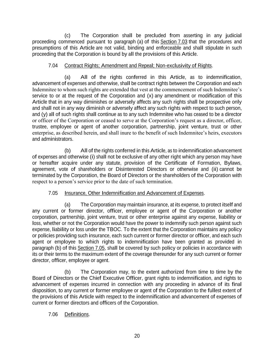 20 (c) The Corporation shall be precluded from asserting in any judicial proceeding commenced pursuant to paragraph (a) of this Section 7.03 that the procedures and presumptions of this Article are not valid, binding and enforceable and shall stipulate in such proceeding that the Corporation is bound by all the provisions of this Article. 7.04 Contract Rights; Amendment and Repeal; Non-exclusivity of Rights. (a) All of the rights conferred in this Article, as to indemnification, advancement of expenses and otherwise, shall be contract rights between the Corporation and each Indemnitee to whom such rights are extended that vest at the commencement of such Indemnitee’s service to or at the request of the Corporation and (x) any amendment or modification of this Article that in any way diminishes or adversely affects any such rights shall be prospective only and shall not in any way diminish or adversely affect any such rights with respect to such person, and (y) all of such rights shall continue as to any such Indemnitee who has ceased to be a director or officer of the Corporation or ceased to serve at the Corporation’s request as a director, officer, trustee, employee or agent of another corporation, partnership, joint venture, trust or other enterprise, as described herein, and shall inure to the benefit of such Indemnitee’s heirs, executors and administrators. (b) All of the rights conferred in this Article, as to indemnification advancement of expenses and otherwise (i) shall not be exclusive of any other right which any person may have or hereafter acquire under any statute, provision of the Certificate of Formation, Bylaws, agreement, vote of shareholders or Disinterested Directors or otherwise and (ii) cannot be terminated by the Corporation, the Board of Directors or the shareholders of the Corporation with respect to a person’s service prior to the date of such termination. 7.05 Insurance, Other Indemnification and Advancement of Expenses. (a) The Corporation may maintain insurance, at its expense, to protect itself and any current or former director, officer, employee or agent of the Corporation or another corporation, partnership, joint venture, trust or other enterprise against any expense, liability or loss, whether or not the Corporation would have the power to indemnify such person against such expense, liability or loss under the TBOC. To the extent that the Corporation maintains any policy or policies providing such insurance, each such current or former director or officer, and each such agent or employee to which rights to indemnification have been granted as provided in paragraph (b) of this Section 7.05, shall be covered by such policy or policies in accordance with its or their terms to the maximum extent of the coverage thereunder for any such current or former director, officer, employee or agent. (b) The Corporation may, to the extent authorized from time to time by the Board of Directors or the Chief Executive Officer, grant rights to indemnification, and rights to advancement of expenses incurred in connection with any proceeding in advance of its final disposition, to any current or former employee or agent of the Corporation to the fullest extent of the provisions of this Article with respect to the indemnification and advancement of expenses of current or former directors and officers of the Corporation. 7.06 Definitions.