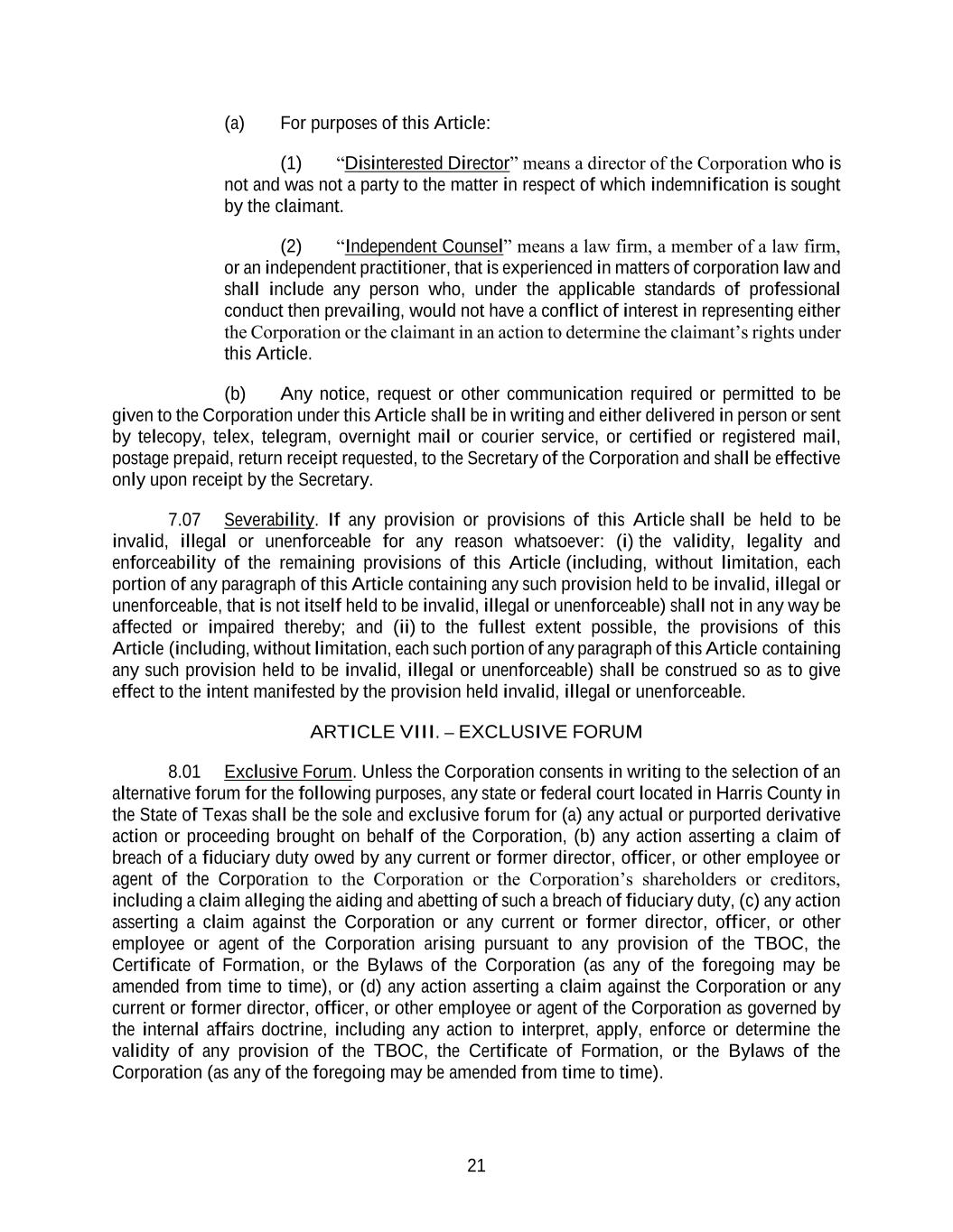 21 (a) For purposes of this Article: (1) “Disinterested Director” means a director of the Corporation who is not and was not a party to the matter in respect of which indemnification is sought by the claimant. (2) “Independent Counsel” means a law firm, a member of a law firm, or an independent practitioner, that is experienced in matters of corporation law and shall include any person who, under the applicable standards of professional conduct then prevailing, would not have a conflict of interest in representing either the Corporation or the claimant in an action to determine the claimant’s rights under this Article. (b) Any notice, request or other communication required or permitted to be given to the Corporation under this Article shall be in writing and either delivered in person or sent by telecopy, telex, telegram, overnight mail or courier service, or certified or registered mail, postage prepaid, return receipt requested, to the Secretary of the Corporation and shall be effective only upon receipt by the Secretary. 7.07 Severability. If any provision or provisions of this Article shall be held to be invalid, illegal or unenforceable for any reason whatsoever: (i) the validity, legality and enforceability of the remaining provisions of this Article (including, without limitation, each portion of any paragraph of this Article containing any such provision held to be invalid, illegal or unenforceable, that is not itself held to be invalid, illegal or unenforceable) shall not in any way be affected or impaired thereby; and (ii) to the fullest extent possible, the provisions of this Article (including, without limitation, each such portion of any paragraph of this Article containing any such provision held to be invalid, illegal or unenforceable) shall be construed so as to give effect to the intent manifested by the provision held invalid, illegal or unenforceable. ARTICLE VIII. – EXCLUSIVE FORUM 8.01 Exclusive Forum. Unless the Corporation consents in writing to the selection of an alternative forum for the following purposes, any state or federal court located in Harris County in the State of Texas shall be the sole and exclusive forum for (a) any actual or purported derivative action or proceeding brought on behalf of the Corporation, (b) any action asserting a claim of breach of a fiduciary duty owed by any current or former director, officer, or other employee or agent of the Corporation to the Corporation or the Corporation’s shareholders or creditors, including a claim alleging the aiding and abetting of such a breach of fiduciary duty, (c) any action asserting a claim against the Corporation or any current or former director, officer, or other employee or agent of the Corporation arising pursuant to any provision of the TBOC, the Certificate of Formation, or the Bylaws of the Corporation (as any of the foregoing may be amended from time to time), or (d) any action asserting a claim against the Corporation or any current or former director, officer, or other employee or agent of the Corporation as governed by the internal affairs doctrine, including any action to interpret, apply, enforce or determine the validity of any provision of the TBOC, the Certificate of Formation, or the Bylaws of the Corporation (as any of the foregoing may be amended from time to time).