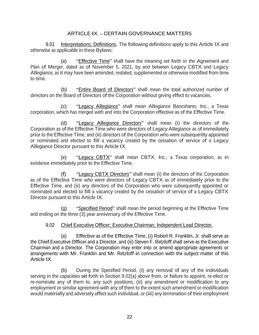 22 ARTICLE IX. – CERTAIN GOVERNANCE MATTERS 9.01 Interpretations; Definitions. The following definitions apply to this Article IX and otherwise as applicable in these Bylaws: (a) “Effective Time” shall have the meaning set forth in the Agreement and Plan of Merger, dated as of November 5, 2021, by and between Legacy CBTX and Legacy Allegiance, as it may have been amended, restated, supplemented or otherwise modified from time to time. (b) “Entire Board of Directors” shall mean the total authorized number of directors on the Board of Directors of the Corporation without giving effect to vacancies. (c) “Legacy Allegiance” shall mean Allegiance Bancshares, Inc., a Texas corporation, which has merged with and into the Corporation effective as of the Effective Time. (d) “Legacy Allegiance Directors” shall mean (i) the directors of the Corporation as of the Effective Time who were directors of Legacy Allegiance as of immediately prior to the Effective Time, and (ii) directors of the Corporation who were subsequently appointed or nominated and elected to fill a vacancy created by the cessation of service of a Legacy Allegiance Director pursuant to this Article IX. (e) “Legacy CBTX” shall mean CBTX, Inc., a Texas corporation, as in existence immediately prior to the Effective Time. (f) “Legacy CBTX Directors” shall mean (i) the directors of the Corporation as of the Effective Time who were directors of Legacy CBTX as of immediately prior to the Effective Time, and (ii) any directors of the Corporation who were subsequently appointed or nominated and elected to fill a vacancy created by the cessation of service of a Legacy CBTX Director pursuant to this Article IX. (g) “Specified Period” shall mean the period beginning at the Effective Time and ending on the three (3) year anniversary of the Effective Time. 9.02 Chief Executive Officer; Executive Chairman; Independent Lead Director. (a) Effective as of the Effective Time, (i) Robert R. Franklin, Jr. shall serve as the Chief Executive Officer and a Director, and (ii) Steven F. Retzloff shall serve as the Executive Chairman and a Director. The Corporation may enter into or amend appropriate agreements or arrangements with Mr. Franklin and Mr. Retzloff in connection with the subject matter of this Article IX. (b) During the Specified Period, (i) any removal of any of the individuals serving in the capacities set forth in Section 9.02(a) above from, or failure to appoint, re-elect or re-nominate any of them to, any such positions, (ii) any amendment or modification to any employment or similar agreement with any of them to the extent such amendment or modification would materially and adversely affect such individual, or (iii) any termination of their employment