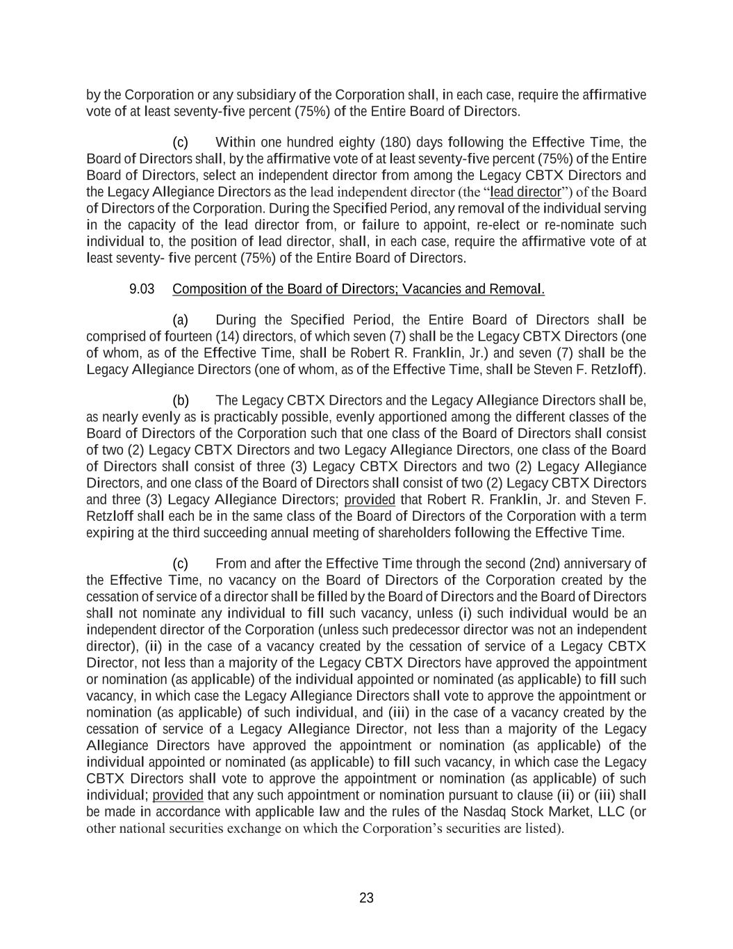 23 by the Corporation or any subsidiary of the Corporation shall, in each case, require the affirmative vote of at least seventy-five percent (75%) of the Entire Board of Directors. (c) Within one hundred eighty (180) days following the Effective Time, the Board of Directors shall, by the affirmative vote of at least seventy-five percent (75%) of the Entire Board of Directors, select an independent director from among the Legacy CBTX Directors and the Legacy Allegiance Directors as the lead independent director (the “lead director”) of the Board of Directors of the Corporation. During the Specified Period, any removal of the individual serving in the capacity of the lead director from, or failure to appoint, re-elect or re-nominate such individual to, the position of lead director, shall, in each case, require the affirmative vote of at least seventy- five percent (75%) of the Entire Board of Directors. 9.03 Composition of the Board of Directors; Vacancies and Removal. (a) During the Specified Period, the Entire Board of Directors shall be comprised of fourteen (14) directors, of which seven (7) shall be the Legacy CBTX Directors (one of whom, as of the Effective Time, shall be Robert R. Franklin, Jr.) and seven (7) shall be the Legacy Allegiance Directors (one of whom, as of the Effective Time, shall be Steven F. Retzloff). (b) The Legacy CBTX Directors and the Legacy Allegiance Directors shall be, as nearly evenly as is practicably possible, evenly apportioned among the different classes of the Board of Directors of the Corporation such that one class of the Board of Directors shall consist of two (2) Legacy CBTX Directors and two Legacy Allegiance Directors, one class of the Board of Directors shall consist of three (3) Legacy CBTX Directors and two (2) Legacy Allegiance Directors, and one class of the Board of Directors shall consist of two (2) Legacy CBTX Directors and three (3) Legacy Allegiance Directors; provided that Robert R. Franklin, Jr. and Steven F. Retzloff shall each be in the same class of the Board of Directors of the Corporation with a term expiring at the third succeeding annual meeting of shareholders following the Effective Time. (c) From and after the Effective Time through the second (2nd) anniversary of the Effective Time, no vacancy on the Board of Directors of the Corporation created by the cessation of service of a director shall be filled by the Board of Directors and the Board of Directors shall not nominate any individual to fill such vacancy, unless (i) such individual would be an independent director of the Corporation (unless such predecessor director was not an independent director), (ii) in the case of a vacancy created by the cessation of service of a Legacy CBTX Director, not less than a majority of the Legacy CBTX Directors have approved the appointment or nomination (as applicable) of the individual appointed or nominated (as applicable) to fill such vacancy, in which case the Legacy Allegiance Directors shall vote to approve the appointment or nomination (as applicable) of such individual, and (iii) in the case of a vacancy created by the cessation of service of a Legacy Allegiance Director, not less than a majority of the Legacy Allegiance Directors have approved the appointment or nomination (as applicable) of the individual appointed or nominated (as applicable) to fill such vacancy, in which case the Legacy CBTX Directors shall vote to approve the appointment or nomination (as applicable) of such individual; provided that any such appointment or nomination pursuant to clause (ii) or (iii) shall be made in accordance with applicable law and the rules of the Nasdaq Stock Market, LLC (or other national securities exchange on which the Corporation’s securities are listed).