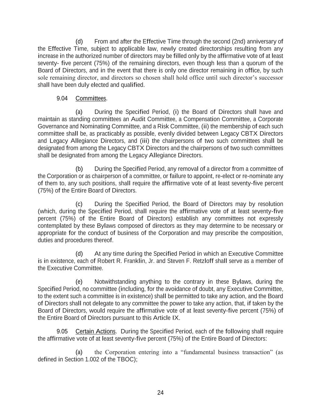 24 (d) From and after the Effective Time through the second (2nd) anniversary of the Effective Time, subject to applicable law, newly created directorships resulting from any increase in the authorized number of directors may be filled only by the affirmative vote of at least seventy- five percent (75%) of the remaining directors, even though less than a quorum of the Board of Directors, and in the event that there is only one director remaining in office, by such sole remaining director, and directors so chosen shall hold office until such director’s successor shall have been duly elected and qualified. 9.04 Committees. (a) During the Specified Period, (i) the Board of Directors shall have and maintain as standing committees an Audit Committee, a Compensation Committee, a Corporate Governance and Nominating Committee, and a Risk Committee, (ii) the membership of each such committee shall be, as practicably as possible, evenly divided between Legacy CBTX Directors and Legacy Allegiance Directors, and (iii) the chairpersons of two such committees shall be designated from among the Legacy CBTX Directors and the chairpersons of two such committees shall be designated from among the Legacy Allegiance Directors. (b) During the Specified Period, any removal of a director from a committee of the Corporation or as chairperson of a committee, or failure to appoint, re-elect or re-nominate any of them to, any such positions, shall require the affirmative vote of at least seventy-five percent (75%) of the Entire Board of Directors. (c) During the Specified Period, the Board of Directors may by resolution (which, during the Specified Period, shall require the affirmative vote of at least seventy-five percent (75%) of the Entire Board of Directors) establish any committees not expressly contemplated by these Bylaws composed of directors as they may determine to be necessary or appropriate for the conduct of business of the Corporation and may prescribe the composition, duties and procedures thereof. (d) At any time during the Specified Period in which an Executive Committee is in existence, each of Robert R. Franklin, Jr. and Steven F. Retzloff shall serve as a member of the Executive Committee. (e) Notwithstanding anything to the contrary in these Bylaws, during the Specified Period, no committee (including, for the avoidance of doubt, any Executive Committee, to the extent such a committee is in existence) shall be permitted to take any action, and the Board of Directors shall not delegate to any committee the power to take any action, that, if taken by the Board of Directors, would require the affirmative vote of at least seventy-five percent (75%) of the Entire Board of Directors pursuant to this Article IX. 9.05 Certain Actions. During the Specified Period, each of the following shall require the affirmative vote of at least seventy-five percent (75%) of the Entire Board of Directors: (a) the Corporation entering into a “fundamental business transaction” (as defined in Section 1.002 of the TBOC);