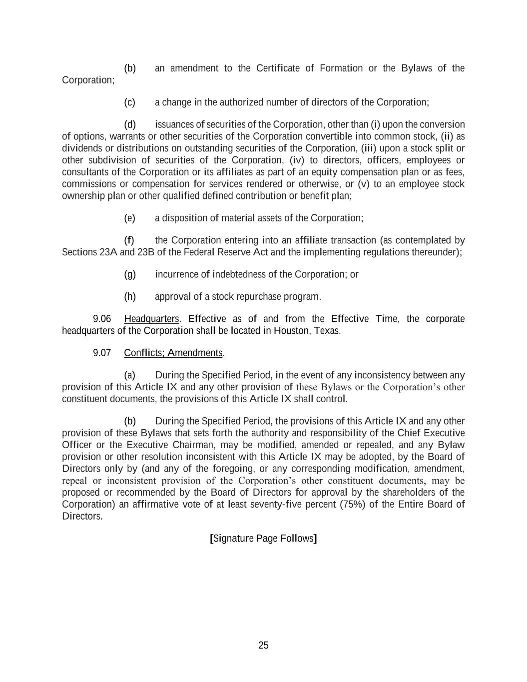 25 (b) an amendment to the Certificate of Formation or the Bylaws of the Corporation; (c) a change in the authorized number of directors of the Corporation; (d) issuances of securities of the Corporation, other than (i) upon the conversion of options, warrants or other securities of the Corporation convertible into common stock, (ii) as dividends or distributions on outstanding securities of the Corporation, (iii) upon a stock split or other subdivision of securities of the Corporation, (iv) to directors, officers, employees or consultants of the Corporation or its affiliates as part of an equity compensation plan or as fees, commissions or compensation for services rendered or otherwise, or (v) to an employee stock ownership plan or other qualified defined contribution or benefit plan; (e) a disposition of material assets of the Corporation; (f) the Corporation entering into an affiliate transaction (as contemplated by Sections 23A and 23B of the Federal Reserve Act and the implementing regulations thereunder); (g) incurrence of indebtedness of the Corporation; or (h) approval of a stock repurchase program. 9.06 Headquarters. Effective as of and from the Effective Time, the corporate headquarters of the Corporation shall be located in Houston, Texas. 9.07 Conflicts; Amendments. (a) During the Specified Period, in the event of any inconsistency between any provision of this Article IX and any other provision of these Bylaws or the Corporation’s other constituent documents, the provisions of this Article IX shall control. (b) During the Specified Period, the provisions of this Article IX and any other provision of these Bylaws that sets forth the authority and responsibility of the Chief Executive Officer or the Executive Chairman, may be modified, amended or repealed, and any Bylaw provision or other resolution inconsistent with this Article IX may be adopted, by the Board of Directors only by (and any of the foregoing, or any corresponding modification, amendment, repeal or inconsistent provision of the Corporation’s other constituent documents, may be proposed or recommended by the Board of Directors for approval by the shareholders of the Corporation) an affirmative vote of at least seventy-five percent (75%) of the Entire Board of Directors. [Signature Page Follows]
