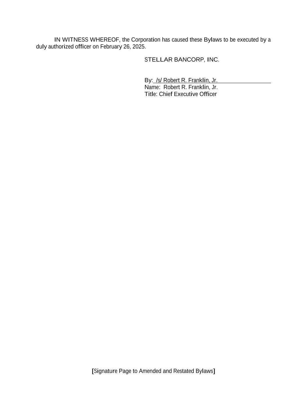 [Signature Page to Amended and Restated Bylaws] IN WITNESS WHEREOF, the Corporation has caused these Bylaws to be executed by a duly authorized officer on February 26, 2025. STELLAR BANCORP, INC. By: /s/ Robert R. Franklin, Jr. Name: Robert R. Franklin, Jr. Title: Chief Executive Officer