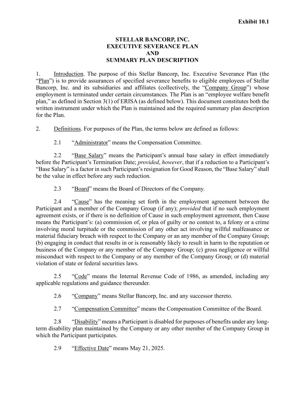 Exhibit 10.1 STELLAR BANCORP, INC. EXECUTIVE SEVERANCE PLAN AND SUMMARY PLAN DESCRIPTION 1. Introduction. The purpose of this Stellar Bancorp, Inc. Executive Severance Plan (the “Plan”) is to provide assurances of specified severance benefits to eligible employees of Stellar Bancorp, Inc. and its subsidiaries and affiliates (collectively, the “Company Group”) whose employment is terminated under certain circumstances. The Plan is an “employee welfare benefit plan,” as defined in Section 3(1) of ERISA (as defined below). This document constitutes both the written instrument under which the Plan is maintained and the required summary plan description for the Plan. 2. Definitions. For purposes of the Plan, the terms below are defined as follows: 2.1 “Administrator” means the Compensation Committee. 2.2 “Base Salary” means the Participant’s annual base salary in effect immediately before the Participant’s Termination Date; provided, however, that if a reduction to a Participant’s “Base Salary” is a factor in such Participant’s resignation for Good Reason, the “Base Salary” shall be the value in effect before any such reduction. 2.3 “Board” means the Board of Directors of the Company. 2.4 “Cause” has the meaning set forth in the employment agreement between the Participant and a member of the Company Group (if any); provided that if no such employment agreement exists, or if there is no definition of Cause in such employment agreement, then Cause means the Participant’s: (a) commission of, or plea of guilty or no contest to, a felony or a crime involving moral turpitude or the commission of any other act involving willful malfeasance or material fiduciary breach with respect to the Company or an any member of the Company Group; (b) engaging in conduct that results in or is reasonably likely to result in harm to the reputation or business of the Company or any member of the Company Group; (c) gross negligence or willful misconduct with respect to the Company or any member of the Company Group; or (d) material violation of state or federal securities laws. 2.5 “Code” means the Internal Revenue Code of 1986, as amended, including any applicable regulations and guidance thereunder. 2.6 “Company” means Stellar Bancorp, Inc. and any successor thereto. 2.7 “Compensation Committee” means the Compensation Committee of the Board. 2.8 “Disability” means a Participant is disabled for purposes of benefits under any long- term disability plan maintained by the Company or any other member of the Company Group in which the Participant participates. 2.9 “Effective Date” means May 21, 2025.