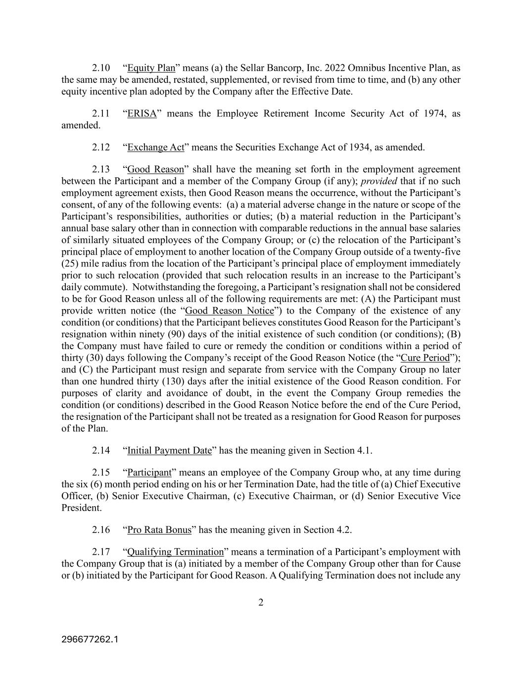 2 296677262.1 2.10 “Equity Plan” means (a) the Sellar Bancorp, Inc. 2022 Omnibus Incentive Plan, as the same may be amended, restated, supplemented, or revised from time to time, and (b) any other equity incentive plan adopted by the Company after the Effective Date. 2.11 “ERISA” means the Employee Retirement Income Security Act of 1974, as amended. 2.12 “Exchange Act” means the Securities Exchange Act of 1934, as amended. 2.13 “Good Reason” shall have the meaning set forth in the employment agreement between the Participant and a member of the Company Group (if any); provided that if no such employment agreement exists, then Good Reason means the occurrence, without the Participant’s consent, of any of the following events: (a) a material adverse change in the nature or scope of the Participant’s responsibilities, authorities or duties; (b) a material reduction in the Participant’s annual base salary other than in connection with comparable reductions in the annual base salaries of similarly situated employees of the Company Group; or (c) the relocation of the Participant’s principal place of employment to another location of the Company Group outside of a twenty-five (25) mile radius from the location of the Participant’s principal place of employment immediately prior to such relocation (provided that such relocation results in an increase to the Participant’s daily commute). Notwithstanding the foregoing, a Participant’s resignation shall not be considered to be for Good Reason unless all of the following requirements are met: (A) the Participant must provide written notice (the “Good Reason Notice”) to the Company of the existence of any condition (or conditions) that the Participant believes constitutes Good Reason for the Participant’s resignation within ninety (90) days of the initial existence of such condition (or conditions); (B) the Company must have failed to cure or remedy the condition or conditions within a period of thirty (30) days following the Company’s receipt of the Good Reason Notice (the “Cure Period”); and (C) the Participant must resign and separate from service with the Company Group no later than one hundred thirty (130) days after the initial existence of the Good Reason condition. For purposes of clarity and avoidance of doubt, in the event the Company Group remedies the condition (or conditions) described in the Good Reason Notice before the end of the Cure Period, the resignation of the Participant shall not be treated as a resignation for Good Reason for purposes of the Plan. 2.14 “Initial Payment Date” has the meaning given in Section 4.1. 2.15 “Participant” means an employee of the Company Group who, at any time during the six (6) month period ending on his or her Termination Date, had the title of (a) Chief Executive Officer, (b) Senior Executive Chairman, (c) Executive Chairman, or (d) Senior Executive Vice President. 2.16 “Pro Rata Bonus” has the meaning given in Section 4.2. 2.17 “Qualifying Termination” means a termination of a Participant’s employment with the Company Group that is (a) initiated by a member of the Company Group other than for Cause or (b) initiated by the Participant for Good Reason. A Qualifying Termination does not include any