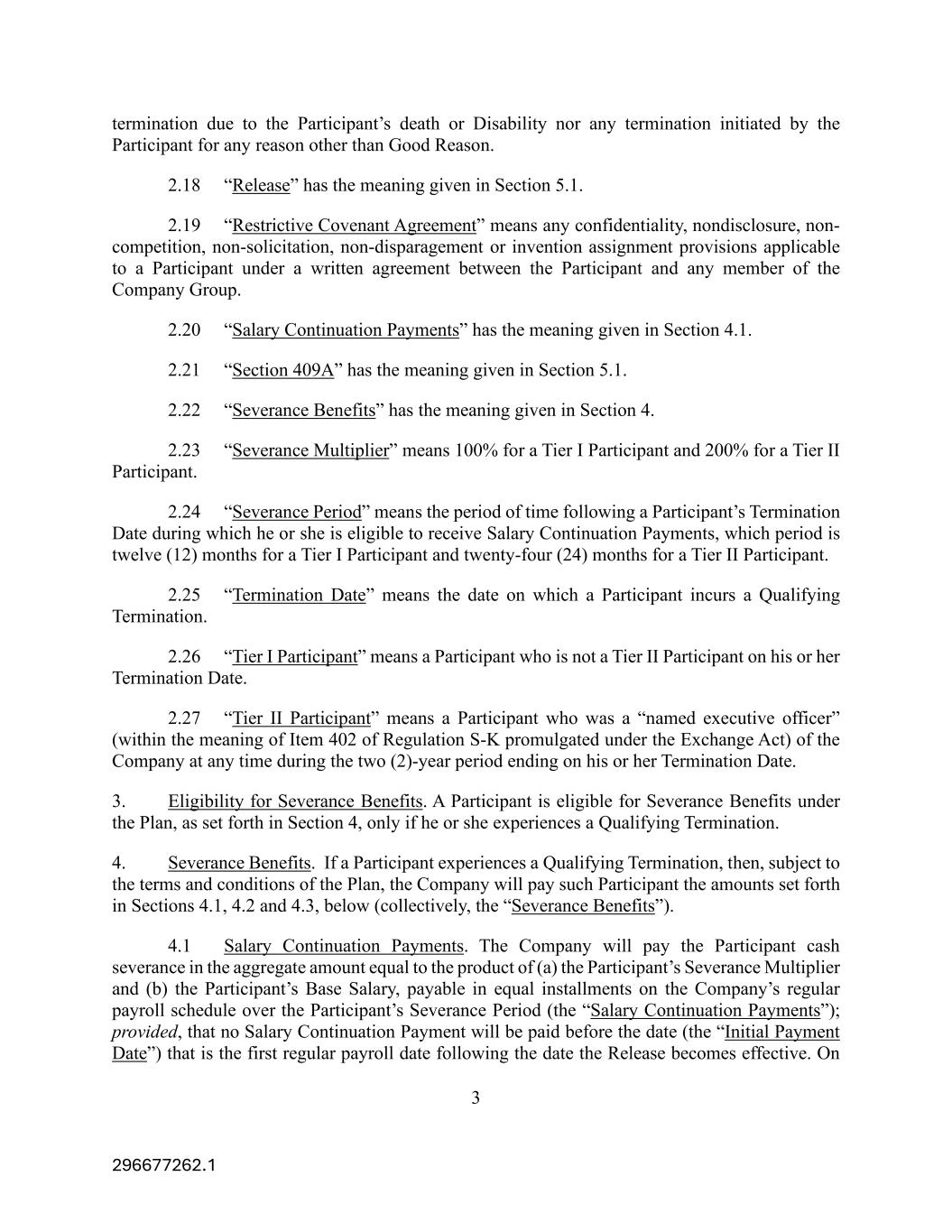 3 296677262.1 termination due to the Participant’s death or Disability nor any termination initiated by the Participant for any reason other than Good Reason. 2.18 “Release” has the meaning given in Section 5.1. 2.19 “Restrictive Covenant Agreement” means any confidentiality, nondisclosure, non- competition, non-solicitation, non-disparagement or invention assignment provisions applicable to a Participant under a written agreement between the Participant and any member of the Company Group. 2.20 “Salary Continuation Payments” has the meaning given in Section 4.1. 2.21 “Section 409A” has the meaning given in Section 5.1. 2.22 “Severance Benefits” has the meaning given in Section 4. 2.23 “Severance Multiplier” means 100% for a Tier I Participant and 200% for a Tier II Participant. 2.24 “Severance Period” means the period of time following a Participant’s Termination Date during which he or she is eligible to receive Salary Continuation Payments, which period is twelve (12) months for a Tier I Participant and twenty-four (24) months for a Tier II Participant. 2.25 “Termination Date” means the date on which a Participant incurs a Qualifying Termination. 2.26 “Tier I Participant” means a Participant who is not a Tier II Participant on his or her Termination Date. 2.27 “Tier II Participant” means a Participant who was a “named executive officer” (within the meaning of Item 402 of Regulation S-K promulgated under the Exchange Act) of the Company at any time during the two (2)-year period ending on his or her Termination Date. 3. Eligibility for Severance Benefits. A Participant is eligible for Severance Benefits under the Plan, as set forth in Section 4, only if he or she experiences a Qualifying Termination. 4. Severance Benefits. If a Participant experiences a Qualifying Termination, then, subject to the terms and conditions of the Plan, the Company will pay such Participant the amounts set forth in Sections 4.1, 4.2 and 4.3, below (collectively, the “Severance Benefits”). 4.1 Salary Continuation Payments. The Company will pay the Participant cash severance in the aggregate amount equal to the product of (a) the Participant’s Severance Multiplier and (b) the Participant’s Base Salary, payable in equal installments on the Company’s regular payroll schedule over the Participant’s Severance Period (the “Salary Continuation Payments”); provided, that no Salary Continuation Payment will be paid before the date (the “Initial Payment Date”) that is the first regular payroll date following the date the Release becomes effective. On
