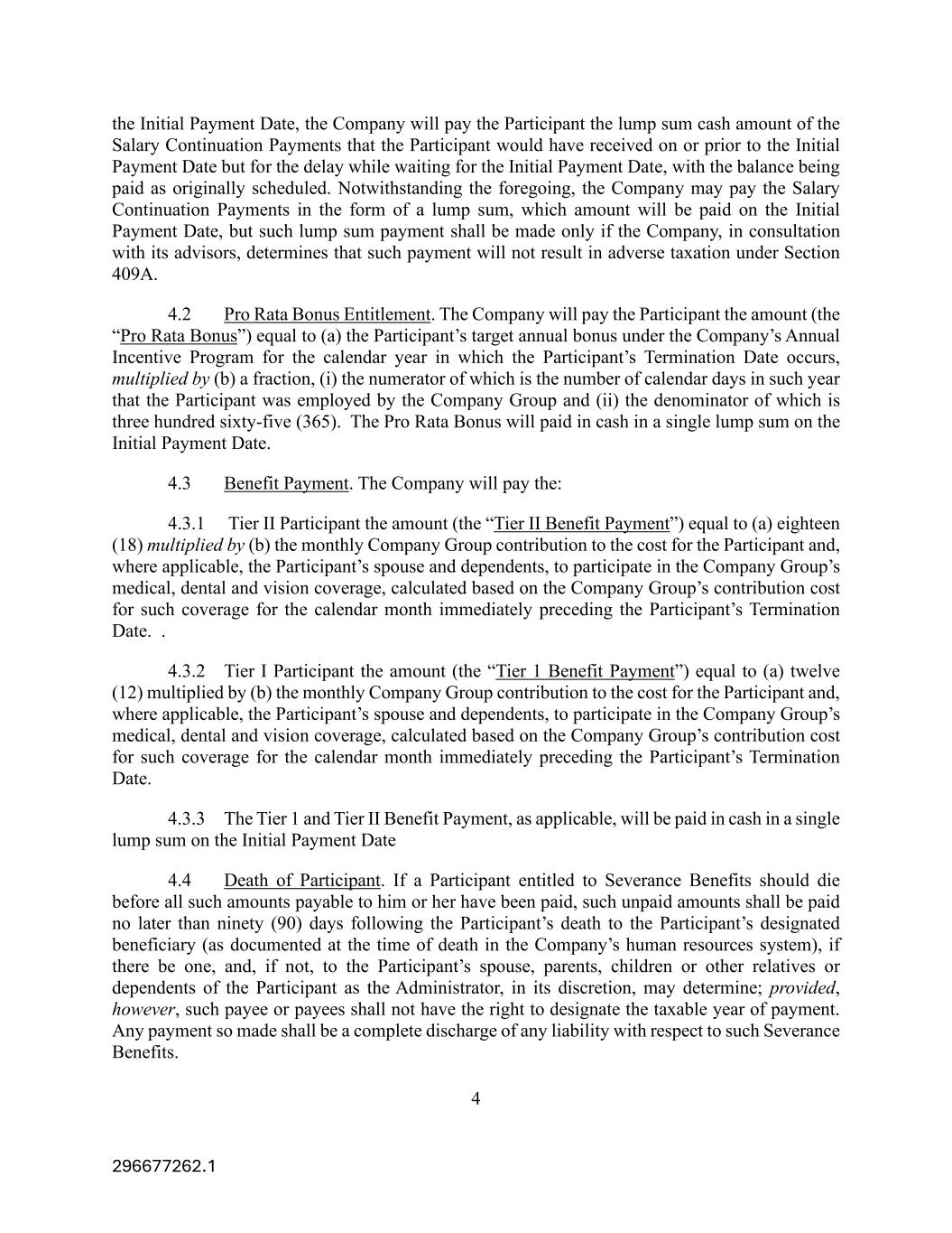 4 296677262.1 the Initial Payment Date, the Company will pay the Participant the lump sum cash amount of the Salary Continuation Payments that the Participant would have received on or prior to the Initial Payment Date but for the delay while waiting for the Initial Payment Date, with the balance being paid as originally scheduled. Notwithstanding the foregoing, the Company may pay the Salary Continuation Payments in the form of a lump sum, which amount will be paid on the Initial Payment Date, but such lump sum payment shall be made only if the Company, in consultation with its advisors, determines that such payment will not result in adverse taxation under Section 409A. 4.2 Pro Rata Bonus Entitlement. The Company will pay the Participant the amount (the “Pro Rata Bonus”) equal to (a) the Participant’s target annual bonus under the Company’s Annual Incentive Program for the calendar year in which the Participant’s Termination Date occurs, multiplied by (b) a fraction, (i) the numerator of which is the number of calendar days in such year that the Participant was employed by the Company Group and (ii) the denominator of which is three hundred sixty-five (365). The Pro Rata Bonus will paid in cash in a single lump sum on the Initial Payment Date. 4.3 Benefit Payment. The Company will pay the: 4.3.1 Tier II Participant the amount (the “Tier II Benefit Payment”) equal to (a) eighteen (18) multiplied by (b) the monthly Company Group contribution to the cost for the Participant and, where applicable, the Participant’s spouse and dependents, to participate in the Company Group’s medical, dental and vision coverage, calculated based on the Company Group’s contribution cost for such coverage for the calendar month immediately preceding the Participant’s Termination Date. . 4.3.2 Tier I Participant the amount (the “Tier 1 Benefit Payment”) equal to (a) twelve (12) multiplied by (b) the monthly Company Group contribution to the cost for the Participant and, where applicable, the Participant’s spouse and dependents, to participate in the Company Group’s medical, dental and vision coverage, calculated based on the Company Group’s contribution cost for such coverage for the calendar month immediately preceding the Participant’s Termination Date. 4.3.3 The Tier 1 and Tier II Benefit Payment, as applicable, will be paid in cash in a single lump sum on the Initial Payment Date 4.4 Death of Participant. If a Participant entitled to Severance Benefits should die before all such amounts payable to him or her have been paid, such unpaid amounts shall be paid no later than ninety (90) days following the Participant’s death to the Participant’s designated beneficiary (as documented at the time of death in the Company’s human resources system), if there be one, and, if not, to the Participant’s spouse, parents, children or other relatives or dependents of the Participant as the Administrator, in its discretion, may determine; provided, however, such payee or payees shall not have the right to designate the taxable year of payment. Any payment so made shall be a complete discharge of any liability with respect to such Severance Benefits.