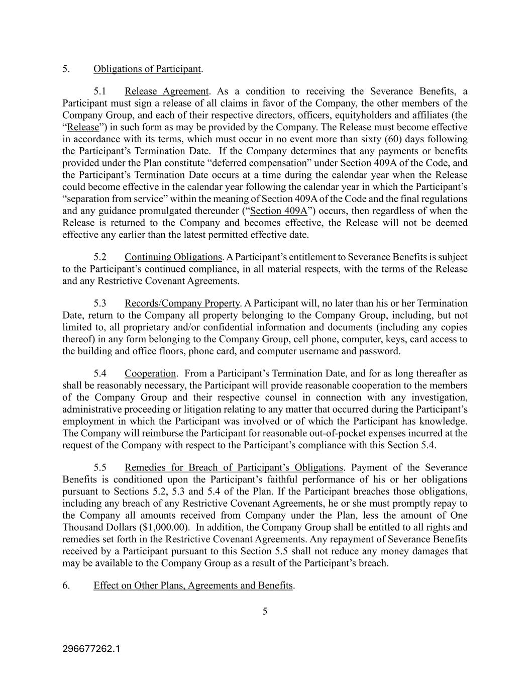5 296677262.1 5. Obligations of Participant. 5.1 Release Agreement. As a condition to receiving the Severance Benefits, a Participant must sign a release of all claims in favor of the Company, the other members of the Company Group, and each of their respective directors, officers, equityholders and affiliates (the “Release”) in such form as may be provided by the Company. The Release must become effective in accordance with its terms, which must occur in no event more than sixty (60) days following the Participant’s Termination Date. If the Company determines that any payments or benefits provided under the Plan constitute “deferred compensation” under Section 409A of the Code, and the Participant’s Termination Date occurs at a time during the calendar year when the Release could become effective in the calendar year following the calendar year in which the Participant’s “separation from service” within the meaning of Section 409A of the Code and the final regulations and any guidance promulgated thereunder (“Section 409A”) occurs, then regardless of when the Release is returned to the Company and becomes effective, the Release will not be deemed effective any earlier than the latest permitted effective date. 5.2 Continuing Obligations. A Participant’s entitlement to Severance Benefits is subject to the Participant’s continued compliance, in all material respects, with the terms of the Release and any Restrictive Covenant Agreements. 5.3 Records/Company Property. A Participant will, no later than his or her Termination Date, return to the Company all property belonging to the Company Group, including, but not limited to, all proprietary and/or confidential information and documents (including any copies thereof) in any form belonging to the Company Group, cell phone, computer, keys, card access to the building and office floors, phone card, and computer username and password. 5.4 Cooperation. From a Participant’s Termination Date, and for as long thereafter as shall be reasonably necessary, the Participant will provide reasonable cooperation to the members of the Company Group and their respective counsel in connection with any investigation, administrative proceeding or litigation relating to any matter that occurred during the Participant’s employment in which the Participant was involved or of which the Participant has knowledge. The Company will reimburse the Participant for reasonable out-of-pocket expenses incurred at the request of the Company with respect to the Participant’s compliance with this Section 5.4. 5.5 Remedies for Breach of Participant’s Obligations. Payment of the Severance Benefits is conditioned upon the Participant’s faithful performance of his or her obligations pursuant to Sections 5.2, 5.3 and 5.4 of the Plan. If the Participant breaches those obligations, including any breach of any Restrictive Covenant Agreements, he or she must promptly repay to the Company all amounts received from Company under the Plan, less the amount of One Thousand Dollars ($1,000.00). In addition, the Company Group shall be entitled to all rights and remedies set forth in the Restrictive Covenant Agreements. Any repayment of Severance Benefits received by a Participant pursuant to this Section 5.5 shall not reduce any money damages that may be available to the Company Group as a result of the Participant’s breach. 6. Effect on Other Plans, Agreements and Benefits.