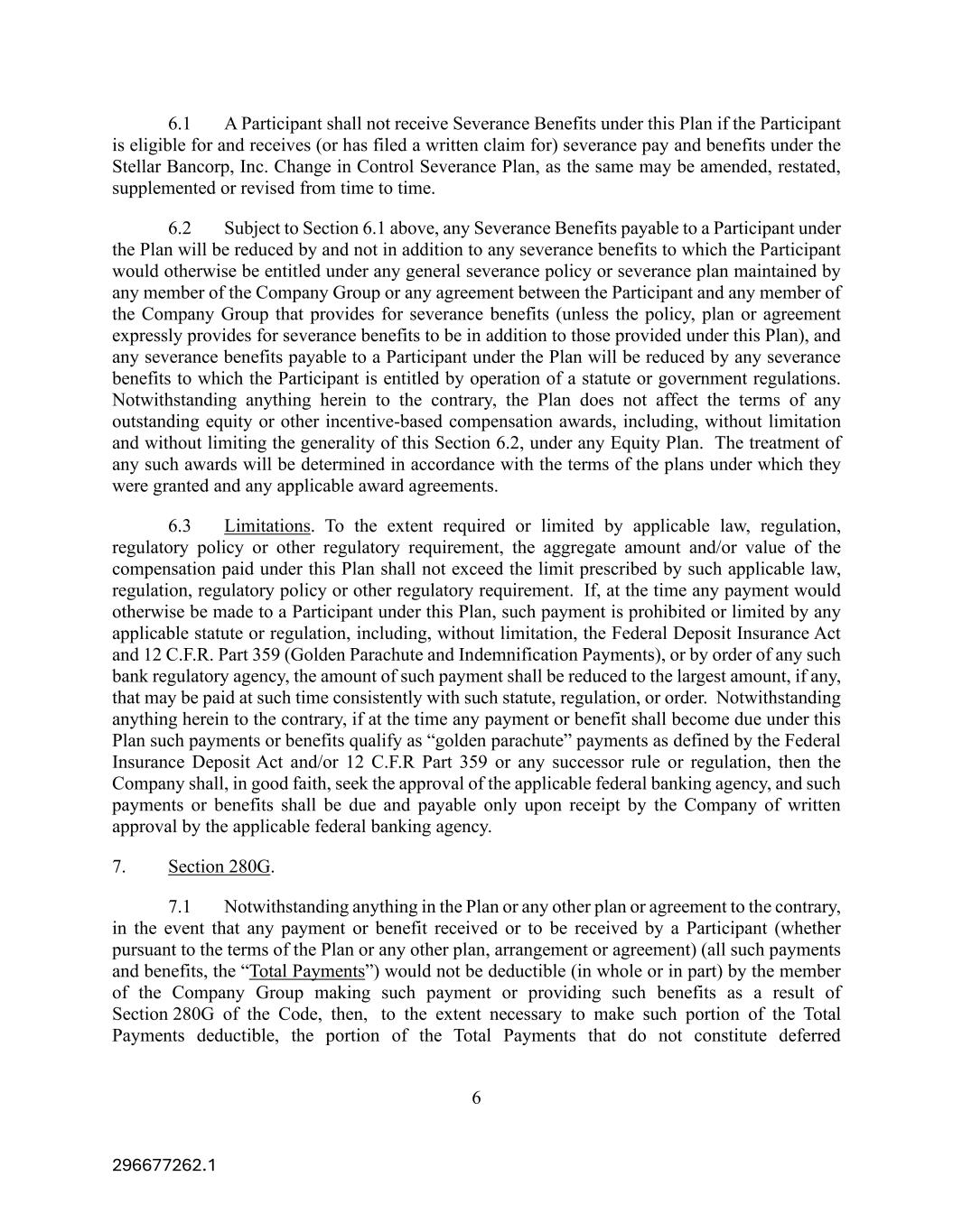 6 296677262.1 6.1 A Participant shall not receive Severance Benefits under this Plan if the Participant is eligible for and receives (or has filed a written claim for) severance pay and benefits under the Stellar Bancorp, Inc. Change in Control Severance Plan, as the same may be amended, restated, supplemented or revised from time to time. 6.2 Subject to Section 6.1 above, any Severance Benefits payable to a Participant under the Plan will be reduced by and not in addition to any severance benefits to which the Participant would otherwise be entitled under any general severance policy or severance plan maintained by any member of the Company Group or any agreement between the Participant and any member of the Company Group that provides for severance benefits (unless the policy, plan or agreement expressly provides for severance benefits to be in addition to those provided under this Plan), and any severance benefits payable to a Participant under the Plan will be reduced by any severance benefits to which the Participant is entitled by operation of a statute or government regulations. Notwithstanding anything herein to the contrary, the Plan does not affect the terms of any outstanding equity or other incentive-based compensation awards, including, without limitation and without limiting the generality of this Section 6.2, under any Equity Plan. The treatment of any such awards will be determined in accordance with the terms of the plans under which they were granted and any applicable award agreements. 6.3 Limitations. To the extent required or limited by applicable law, regulation, regulatory policy or other regulatory requirement, the aggregate amount and/or value of the compensation paid under this Plan shall not exceed the limit prescribed by such applicable law, regulation, regulatory policy or other regulatory requirement. If, at the time any payment would otherwise be made to a Participant under this Plan, such payment is prohibited or limited by any applicable statute or regulation, including, without limitation, the Federal Deposit Insurance Act and 12 C.F.R. Part 359 (Golden Parachute and Indemnification Payments), or by order of any such bank regulatory agency, the amount of such payment shall be reduced to the largest amount, if any, that may be paid at such time consistently with such statute, regulation, or order. Notwithstanding anything herein to the contrary, if at the time any payment or benefit shall become due under this Plan such payments or benefits qualify as “golden parachute” payments as defined by the Federal Insurance Deposit Act and/or 12 C.F.R Part 359 or any successor rule or regulation, then the Company shall, in good faith, seek the approval of the applicable federal banking agency, and such payments or benefits shall be due and payable only upon receipt by the Company of written approval by the applicable federal banking agency. 7. Section 280G. 7.1 Notwithstanding anything in the Plan or any other plan or agreement to the contrary, in the event that any payment or benefit received or to be received by a Participant (whether pursuant to the terms of the Plan or any other plan, arrangement or agreement) (all such payments and benefits, the “Total Payments”) would not be deductible (in whole or in part) by the member of the Company Group making such payment or providing such benefits as a result of Section 280G of the Code, then, to the extent necessary to make such portion of the Total Payments deductible, the portion of the Total Payments that do not constitute deferred