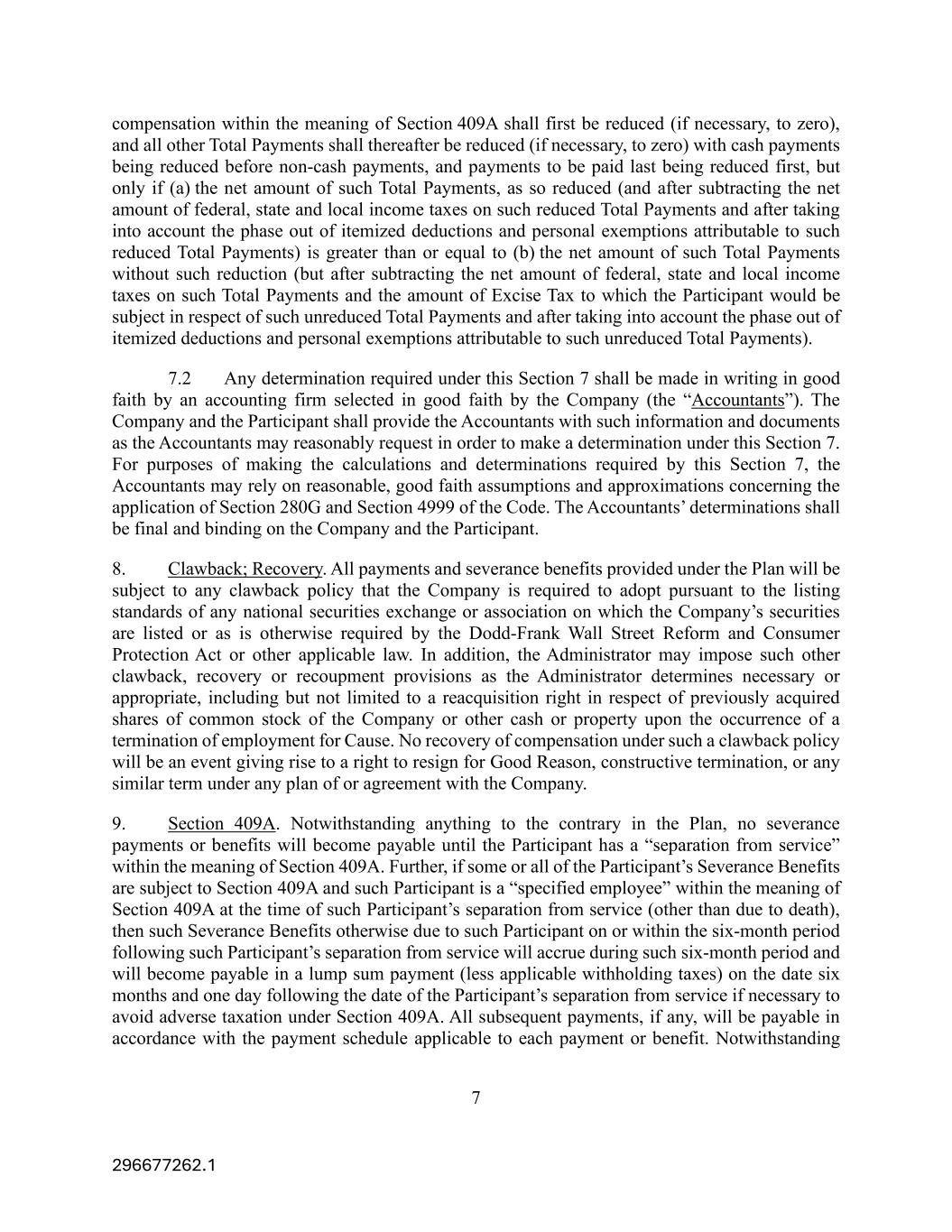 7 296677262.1 compensation within the meaning of Section 409A shall first be reduced (if necessary, to zero), and all other Total Payments shall thereafter be reduced (if necessary, to zero) with cash payments being reduced before non-cash payments, and payments to be paid last being reduced first, but only if (a) the net amount of such Total Payments, as so reduced (and after subtracting the net amount of federal, state and local income taxes on such reduced Total Payments and after taking into account the phase out of itemized deductions and personal exemptions attributable to such reduced Total Payments) is greater than or equal to (b) the net amount of such Total Payments without such reduction (but after subtracting the net amount of federal, state and local income taxes on such Total Payments and the amount of Excise Tax to which the Participant would be subject in respect of such unreduced Total Payments and after taking into account the phase out of itemized deductions and personal exemptions attributable to such unreduced Total Payments). 7.2 Any determination required under this Section 7 shall be made in writing in good faith by an accounting firm selected in good faith by the Company (the “Accountants”). The Company and the Participant shall provide the Accountants with such information and documents as the Accountants may reasonably request in order to make a determination under this Section 7. For purposes of making the calculations and determinations required by this Section 7, the Accountants may rely on reasonable, good faith assumptions and approximations concerning the application of Section 280G and Section 4999 of the Code. The Accountants’ determinations shall be final and binding on the Company and the Participant. 8. Clawback; Recovery. All payments and severance benefits provided under the Plan will be subject to any clawback policy that the Company is required to adopt pursuant to the listing standards of any national securities exchange or association on which the Company’s securities are listed or as is otherwise required by the Dodd-Frank Wall Street Reform and Consumer Protection Act or other applicable law. In addition, the Administrator may impose such other clawback, recovery or recoupment provisions as the Administrator determines necessary or appropriate, including but not limited to a reacquisition right in respect of previously acquired shares of common stock of the Company or other cash or property upon the occurrence of a termination of employment for Cause. No recovery of compensation under such a clawback policy will be an event giving rise to a right to resign for Good Reason, constructive termination, or any similar term under any plan of or agreement with the Company. 9. Section 409A. Notwithstanding anything to the contrary in the Plan, no severance payments or benefits will become payable until the Participant has a “separation from service” within the meaning of Section 409A. Further, if some or all of the Participant’s Severance Benefits are subject to Section 409A and such Participant is a “specified employee” within the meaning of Section 409A at the time of such Participant’s separation from service (other than due to death), then such Severance Benefits otherwise due to such Participant on or within the six-month period following such Participant’s separation from service will accrue during such six-month period and will become payable in a lump sum payment (less applicable withholding taxes) on the date six months and one day following the date of the Participant’s separation from service if necessary to avoid adverse taxation under Section 409A. All subsequent payments, if any, will be payable in accordance with the payment schedule applicable to each payment or benefit. Notwithstanding