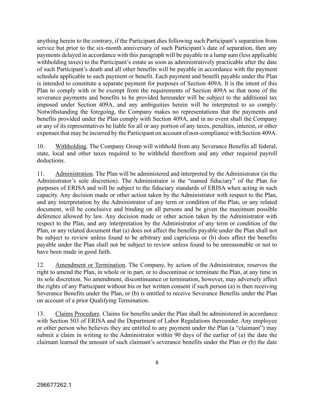 8 296677262.1 anything herein to the contrary, if the Participant dies following such Participant’s separation from service but prior to the six-month anniversary of such Participant’s date of separation, then any payments delayed in accordance with this paragraph will be payable in a lump sum (less applicable withholding taxes) to the Participant’s estate as soon as administratively practicable after the date of such Participant’s death and all other benefits will be payable in accordance with the payment schedule applicable to each payment or benefit. Each payment and benefit payable under the Plan is intended to constitute a separate payment for purposes of Section 409A. It is the intent of this Plan to comply with or be exempt from the requirements of Section 409A so that none of the severance payments and benefits to be provided hereunder will be subject to the additional tax imposed under Section 409A, and any ambiguities herein will be interpreted to so comply. Notwithstanding the foregoing, the Company makes no representations that the payments and benefits provided under the Plan comply with Section 409A, and in no event shall the Company or any of its representatives be liable for all or any portion of any taxes, penalties, interest, or other expenses that may be incurred by the Participant on account of non-compliance with Section 409A. 10. Withholding. The Company Group will withhold from any Severance Benefits all federal, state, local and other taxes required to be withheld therefrom and any other required payroll deductions. 11. Administration. The Plan will be administered and interpreted by the Administrator (in the Administrator’s sole discretion). The Administrator is the “named fiduciary” of the Plan for purposes of ERISA and will be subject to the fiduciary standards of ERISA when acting in such capacity. Any decision made or other action taken by the Administrator with respect to the Plan, and any interpretation by the Administrator of any term or condition of the Plan, or any related document, will be conclusive and binding on all persons and be given the maximum possible deference allowed by law. Any decision made or other action taken by the Administrator with respect to the Plan, and any interpretation by the Administrator of any term or condition of the Plan, or any related document that (a) does not affect the benefits payable under the Plan shall not be subject to review unless found to be arbitrary and capricious or (b) does affect the benefits payable under the Plan shall not be subject to review unless found to be unreasonable or not to have been made in good faith. 12. Amendment or Termination. The Company, by action of the Administrator, reserves the right to amend the Plan, in whole or in part, or to discontinue or terminate the Plan, at any time in its sole discretion. No amendment, discontinuance or termination, however, may adversely affect the rights of any Participant without his or her written consent if such person (a) is then receiving Severance Benefits under the Plan, or (b) is entitled to receive Severance Benefits under the Plan on account of a prior Qualifying Termination. 13. Claims Procedure. Claims for benefits under the Plan shall be administered in accordance with Section 503 of ERISA and the Department of Labor Regulations thereunder. Any employee or other person who believes they are entitled to any payment under the Plan (a “claimant”) may submit a claim in writing to the Administrator within 90 days of the earlier of (a) the date the claimant learned the amount of such claimant’s severance benefits under the Plan or (b) the date