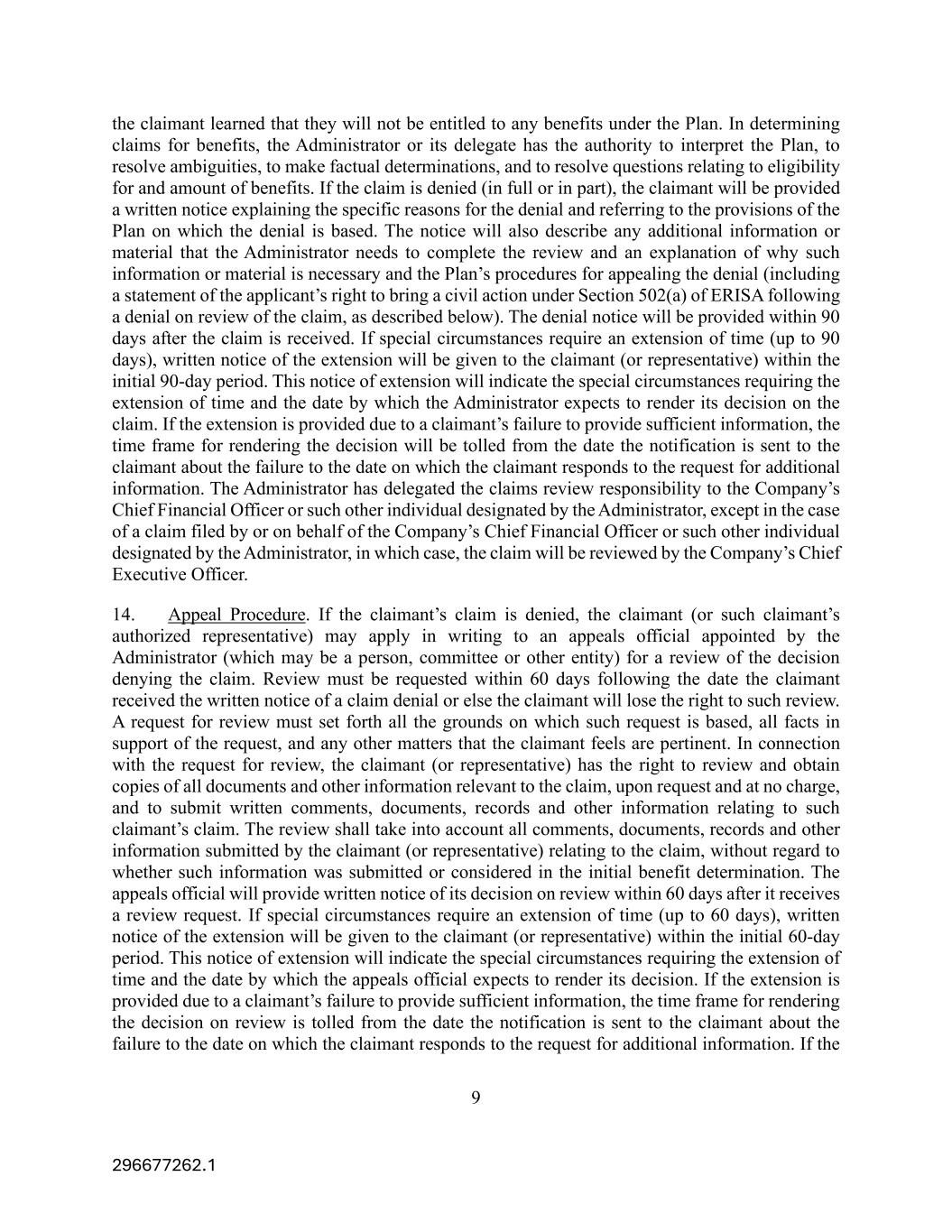 9 296677262.1 the claimant learned that they will not be entitled to any benefits under the Plan. In determining claims for benefits, the Administrator or its delegate has the authority to interpret the Plan, to resolve ambiguities, to make factual determinations, and to resolve questions relating to eligibility for and amount of benefits. If the claim is denied (in full or in part), the claimant will be provided a written notice explaining the specific reasons for the denial and referring to the provisions of the Plan on which the denial is based. The notice will also describe any additional information or material that the Administrator needs to complete the review and an explanation of why such information or material is necessary and the Plan’s procedures for appealing the denial (including a statement of the applicant’s right to bring a civil action under Section 502(a) of ERISA following a denial on review of the claim, as described below). The denial notice will be provided within 90 days after the claim is received. If special circumstances require an extension of time (up to 90 days), written notice of the extension will be given to the claimant (or representative) within the initial 90-day period. This notice of extension will indicate the special circumstances requiring the extension of time and the date by which the Administrator expects to render its decision on the claim. If the extension is provided due to a claimant’s failure to provide sufficient information, the time frame for rendering the decision will be tolled from the date the notification is sent to the claimant about the failure to the date on which the claimant responds to the request for additional information. The Administrator has delegated the claims review responsibility to the Company’s Chief Financial Officer or such other individual designated by the Administrator, except in the case of a claim filed by or on behalf of the Company’s Chief Financial Officer or such other individual designated by the Administrator, in which case, the claim will be reviewed by the Company’s Chief Executive Officer. 14. Appeal Procedure. If the claimant’s claim is denied, the claimant (or such claimant’s authorized representative) may apply in writing to an appeals official appointed by the Administrator (which may be a person, committee or other entity) for a review of the decision denying the claim. Review must be requested within 60 days following the date the claimant received the written notice of a claim denial or else the claimant will lose the right to such review. A request for review must set forth all the grounds on which such request is based, all facts in support of the request, and any other matters that the claimant feels are pertinent. In connection with the request for review, the claimant (or representative) has the right to review and obtain copies of all documents and other information relevant to the claim, upon request and at no charge, and to submit written comments, documents, records and other information relating to such claimant’s claim. The review shall take into account all comments, documents, records and other information submitted by the claimant (or representative) relating to the claim, without regard to whether such information was submitted or considered in the initial benefit determination. The appeals official will provide written notice of its decision on review within 60 days after it receives a review request. If special circumstances require an extension of time (up to 60 days), written notice of the extension will be given to the claimant (or representative) within the initial 60-day period. This notice of extension will indicate the special circumstances requiring the extension of time and the date by which the appeals official expects to render its decision. If the extension is provided due to a claimant’s failure to provide sufficient information, the time frame for rendering the decision on review is tolled from the date the notification is sent to the claimant about the failure to the date on which the claimant responds to the request for additional information. If the