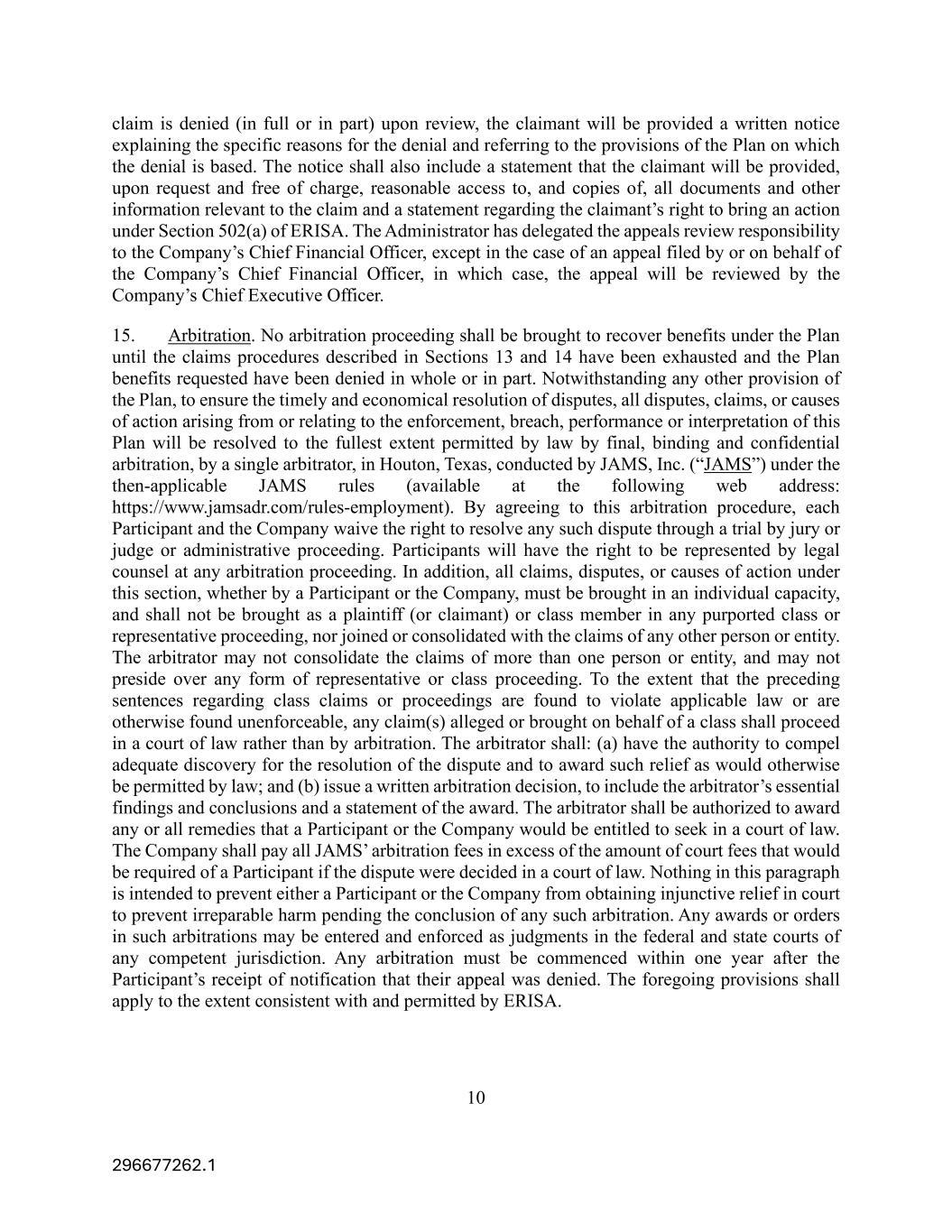 10 296677262.1 claim is denied (in full or in part) upon review, the claimant will be provided a written notice explaining the specific reasons for the denial and referring to the provisions of the Plan on which the denial is based. The notice shall also include a statement that the claimant will be provided, upon request and free of charge, reasonable access to, and copies of, all documents and other information relevant to the claim and a statement regarding the claimant’s right to bring an action under Section 502(a) of ERISA. The Administrator has delegated the appeals review responsibility to the Company’s Chief Financial Officer, except in the case of an appeal filed by or on behalf of the Company’s Chief Financial Officer, in which case, the appeal will be reviewed by the Company’s Chief Executive Officer. 15. Arbitration. No arbitration proceeding shall be brought to recover benefits under the Plan until the claims procedures described in Sections 13 and 14 have been exhausted and the Plan benefits requested have been denied in whole or in part. Notwithstanding any other provision of the Plan, to ensure the timely and economical resolution of disputes, all disputes, claims, or causes of action arising from or relating to the enforcement, breach, performance or interpretation of this Plan will be resolved to the fullest extent permitted by law by final, binding and confidential arbitration, by a single arbitrator, in Houton, Texas, conducted by JAMS, Inc. (“JAMS”) under the then-applicable JAMS rules (available at the following web address: https://www.jamsadr.com/rules-employment). By agreeing to this arbitration procedure, each Participant and the Company waive the right to resolve any such dispute through a trial by jury or judge or administrative proceeding. Participants will have the right to be represented by legal counsel at any arbitration proceeding. In addition, all claims, disputes, or causes of action under this section, whether by a Participant or the Company, must be brought in an individual capacity, and shall not be brought as a plaintiff (or claimant) or class member in any purported class or representative proceeding, nor joined or consolidated with the claims of any other person or entity. The arbitrator may not consolidate the claims of more than one person or entity, and may not preside over any form of representative or class proceeding. To the extent that the preceding sentences regarding class claims or proceedings are found to violate applicable law or are otherwise found unenforceable, any claim(s) alleged or brought on behalf of a class shall proceed in a court of law rather than by arbitration. The arbitrator shall: (a) have the authority to compel adequate discovery for the resolution of the dispute and to award such relief as would otherwise be permitted by law; and (b) issue a written arbitration decision, to include the arbitrator’s essential findings and conclusions and a statement of the award. The arbitrator shall be authorized to award any or all remedies that a Participant or the Company would be entitled to seek in a court of law. The Company shall pay all JAMS’ arbitration fees in excess of the amount of court fees that would be required of a Participant if the dispute were decided in a court of law. Nothing in this paragraph is intended to prevent either a Participant or the Company from obtaining injunctive relief in court to prevent irreparable harm pending the conclusion of any such arbitration. Any awards or orders in such arbitrations may be entered and enforced as judgments in the federal and state courts of any competent jurisdiction. Any arbitration must be commenced within one year after the Participant’s receipt of notification that their appeal was denied. The foregoing provisions shall apply to the extent consistent with and permitted by ERISA.