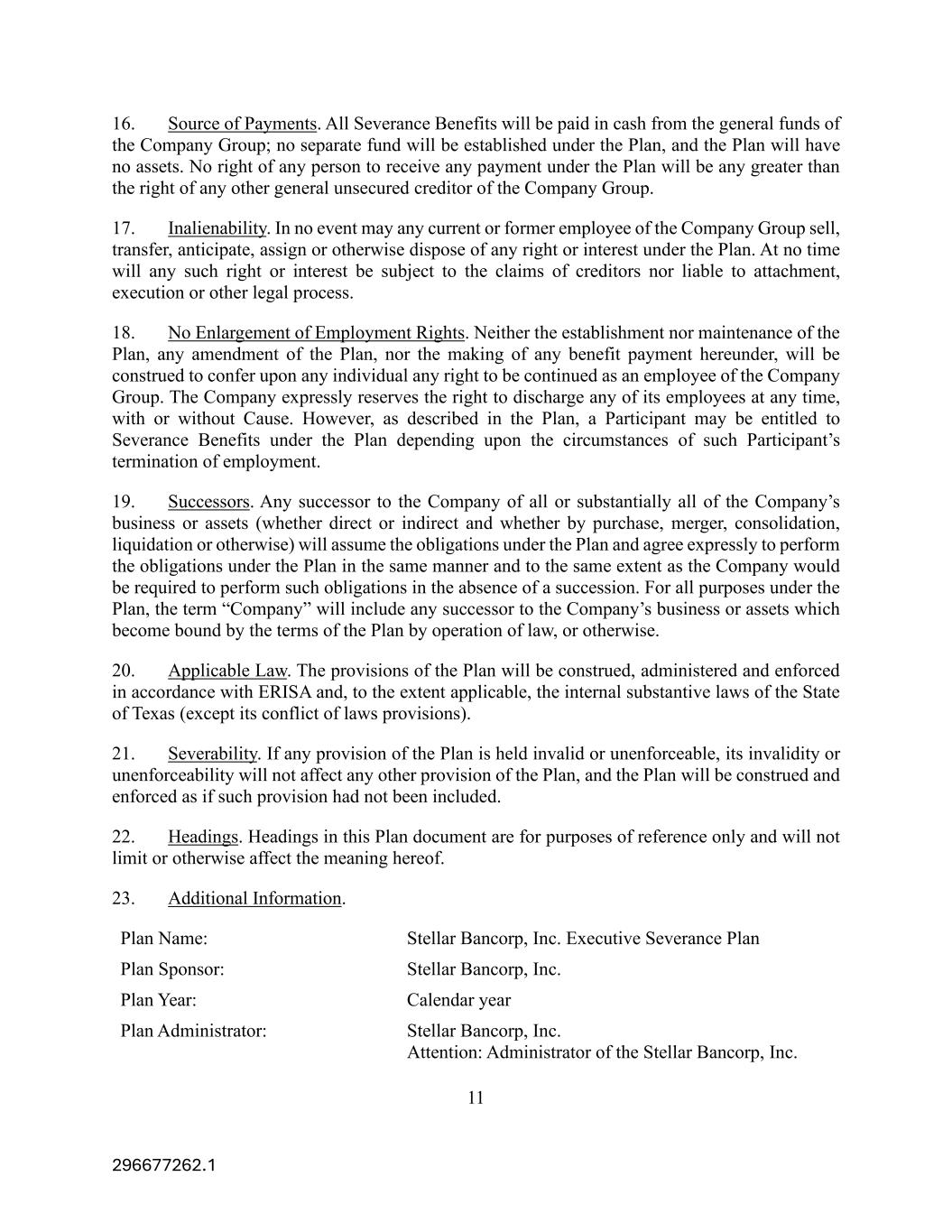 11 296677262.1 16. Source of Payments. All Severance Benefits will be paid in cash from the general funds of the Company Group; no separate fund will be established under the Plan, and the Plan will have no assets. No right of any person to receive any payment under the Plan will be any greater than the right of any other general unsecured creditor of the Company Group. 17. Inalienability. In no event may any current or former employee of the Company Group sell, transfer, anticipate, assign or otherwise dispose of any right or interest under the Plan. At no time will any such right or interest be subject to the claims of creditors nor liable to attachment, execution or other legal process. 18. No Enlargement of Employment Rights. Neither the establishment nor maintenance of the Plan, any amendment of the Plan, nor the making of any benefit payment hereunder, will be construed to confer upon any individual any right to be continued as an employee of the Company Group. The Company expressly reserves the right to discharge any of its employees at any time, with or without Cause. However, as described in the Plan, a Participant may be entitled to Severance Benefits under the Plan depending upon the circumstances of such Participant’s termination of employment. 19. Successors. Any successor to the Company of all or substantially all of the Company’s business or assets (whether direct or indirect and whether by purchase, merger, consolidation, liquidation or otherwise) will assume the obligations under the Plan and agree expressly to perform the obligations under the Plan in the same manner and to the same extent as the Company would be required to perform such obligations in the absence of a succession. For all purposes under the Plan, the term “Company” will include any successor to the Company’s business or assets which become bound by the terms of the Plan by operation of law, or otherwise. 20. Applicable Law. The provisions of the Plan will be construed, administered and enforced in accordance with ERISA and, to the extent applicable, the internal substantive laws of the State of Texas (except its conflict of laws provisions). 21. Severability. If any provision of the Plan is held invalid or unenforceable, its invalidity or unenforceability will not affect any other provision of the Plan, and the Plan will be construed and enforced as if such provision had not been included. 22. Headings. Headings in this Plan document are for purposes of reference only and will not limit or otherwise affect the meaning hereof. 23. Additional Information. Plan Name: Stellar Bancorp, Inc. Executive Severance Plan Plan Sponsor: Stellar Bancorp, Inc. Plan Year: Calendar year Plan Administrator: Stellar Bancorp, Inc. Attention: Administrator of the Stellar Bancorp, Inc.