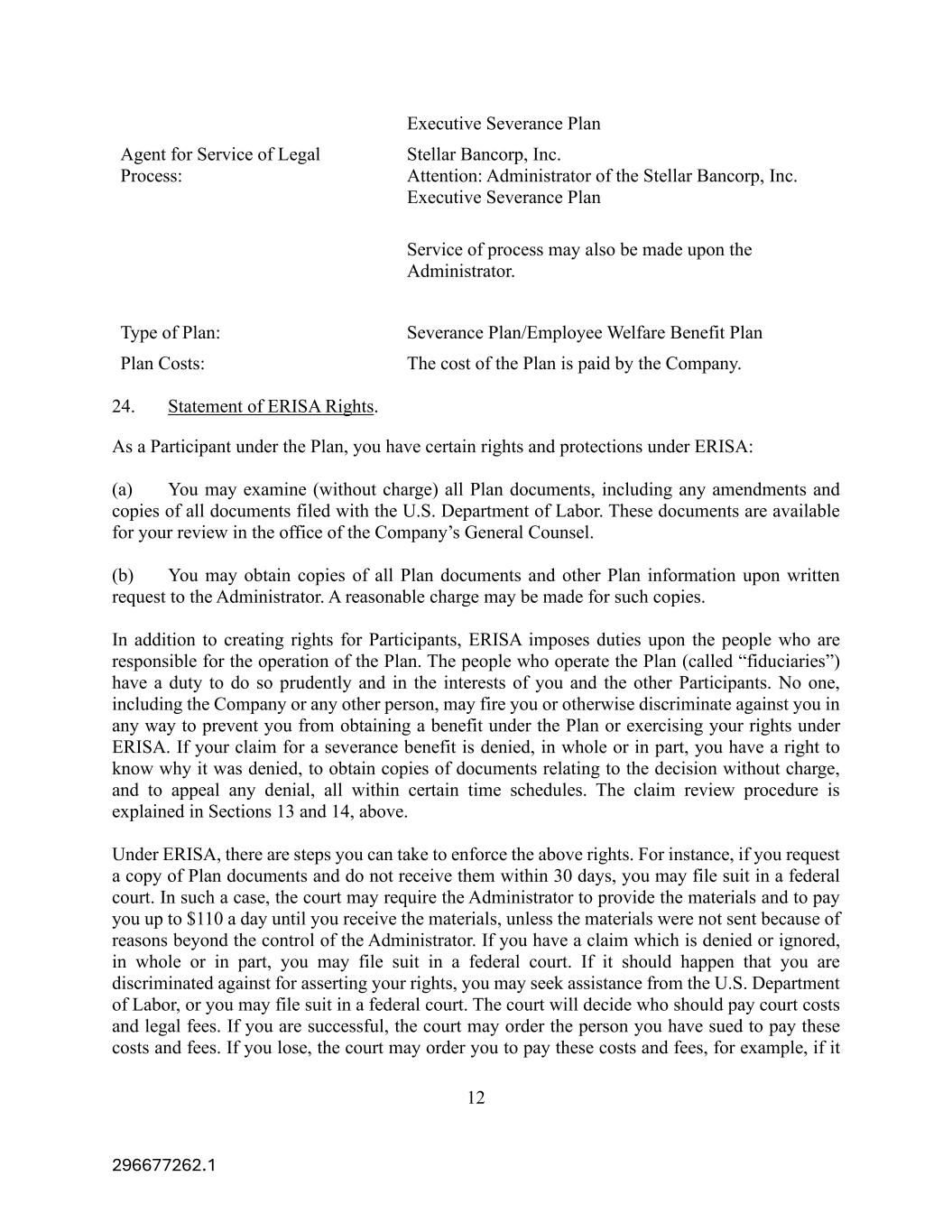 12 296677262.1 Executive Severance Plan Agent for Service of Legal Process: Stellar Bancorp, Inc. Attention: Administrator of the Stellar Bancorp, Inc. Executive Severance Plan Service of process may also be made upon the Administrator. Type of Plan: Severance Plan/Employee Welfare Benefit Plan Plan Costs: The cost of the Plan is paid by the Company. 24. Statement of ERISA Rights. As a Participant under the Plan, you have certain rights and protections under ERISA: (a) You may examine (without charge) all Plan documents, including any amendments and copies of all documents filed with the U.S. Department of Labor. These documents are available for your review in the office of the Company’s General Counsel. (b) You may obtain copies of all Plan documents and other Plan information upon written request to the Administrator. A reasonable charge may be made for such copies. In addition to creating rights for Participants, ERISA imposes duties upon the people who are responsible for the operation of the Plan. The people who operate the Plan (called “fiduciaries”) have a duty to do so prudently and in the interests of you and the other Participants. No one, including the Company or any other person, may fire you or otherwise discriminate against you in any way to prevent you from obtaining a benefit under the Plan or exercising your rights under ERISA. If your claim for a severance benefit is denied, in whole or in part, you have a right to know why it was denied, to obtain copies of documents relating to the decision without charge, and to appeal any denial, all within certain time schedules. The claim review procedure is explained in Sections 13 and 14, above. Under ERISA, there are steps you can take to enforce the above rights. For instance, if you request a copy of Plan documents and do not receive them within 30 days, you may file suit in a federal court. In such a case, the court may require the Administrator to provide the materials and to pay you up to $110 a day until you receive the materials, unless the materials were not sent because of reasons beyond the control of the Administrator. If you have a claim which is denied or ignored, in whole or in part, you may file suit in a federal court. If it should happen that you are discriminated against for asserting your rights, you may seek assistance from the U.S. Department of Labor, or you may file suit in a federal court. The court will decide who should pay court costs and legal fees. If you are successful, the court may order the person you have sued to pay these costs and fees. If you lose, the court may order you to pay these costs and fees, for example, if it