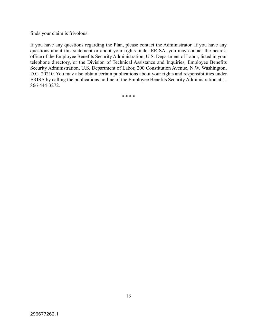 13 296677262.1 finds your claim is frivolous. If you have any questions regarding the Plan, please contact the Administrator. If you have any questions about this statement or about your rights under ERISA, you may contact the nearest office of the Employee Benefits Security Administration, U.S. Department of Labor, listed in your telephone directory, or the Division of Technical Assistance and Inquiries, Employee Benefits Security Administration, U.S. Department of Labor, 200 Constitution Avenue, N.W. Washington, D.C. 20210. You may also obtain certain publications about your rights and responsibilities under ERISA by calling the publications hotline of the Employee Benefits Security Administration at 1- 866-444-3272. * * * *