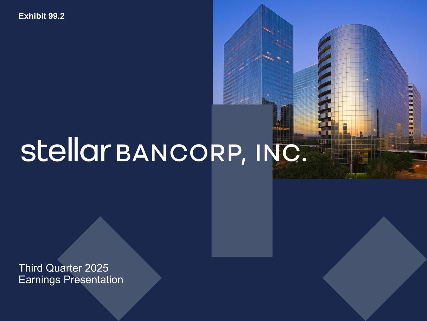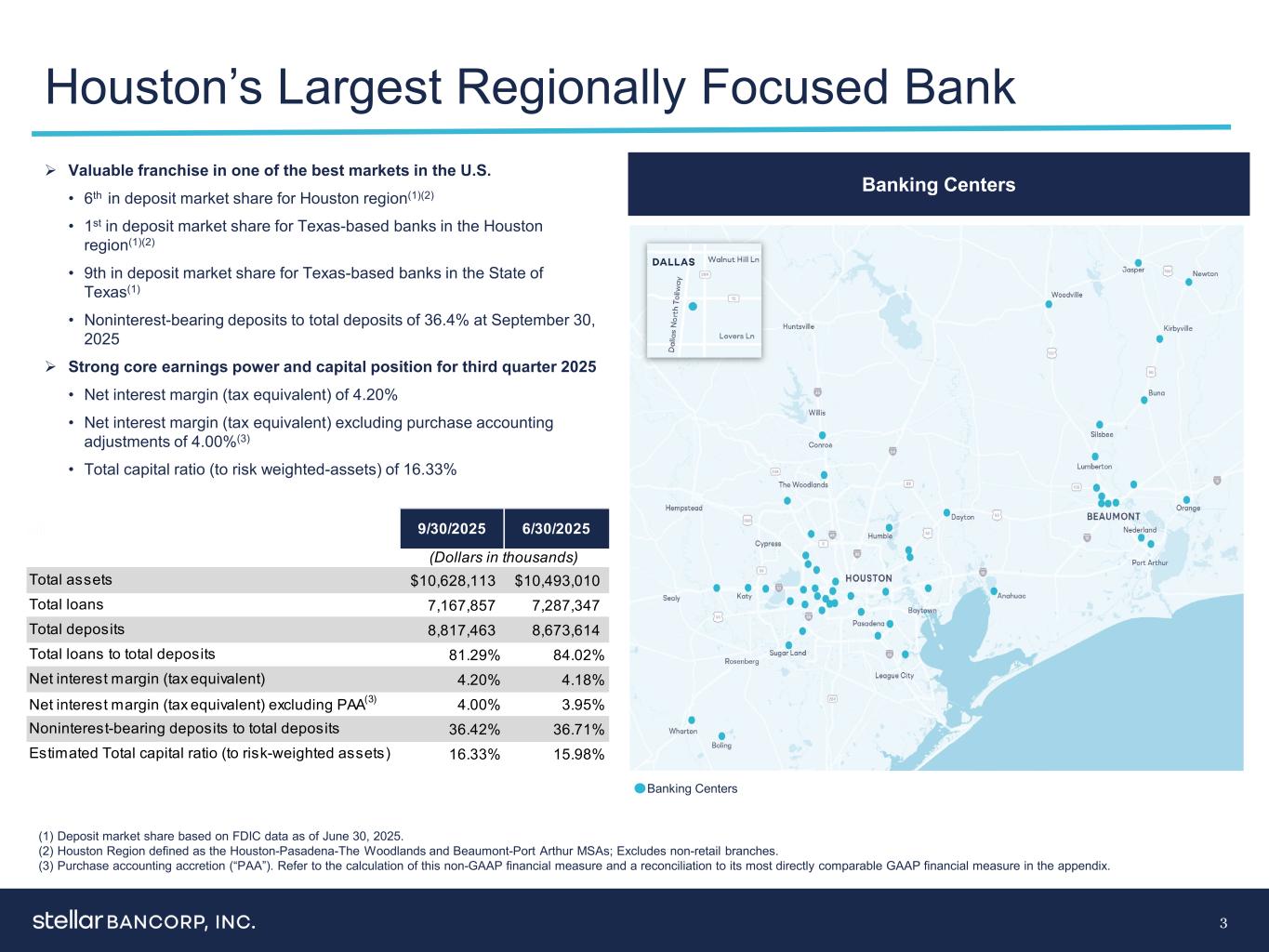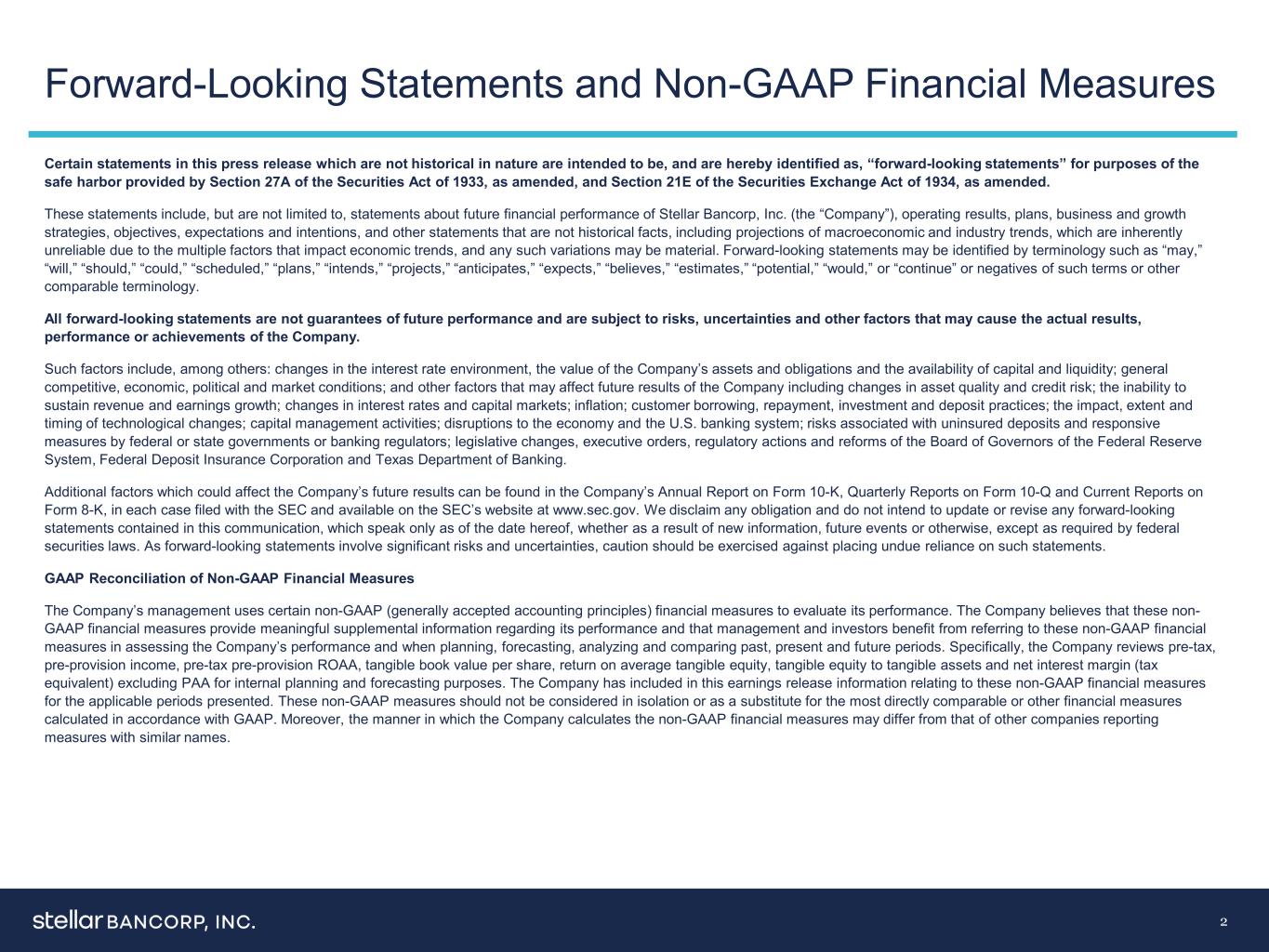 Forward-Looking Statements and Non-GAAP Financial Measures 2 Certain statements in this press release which are not historical in nature are intended to be, and are hereby identified as, “forward-looking statements” for purposes of the safe harbor provided by Section 27A of the Securities Act of 1933, as amended, and Section 21E of the Securities Exchange Act of 1934, as amended. These statements include, but are not limited to, statements about future financial performance of Stellar Bancorp, Inc. (the “Company”), operating results, plans, business and growth strategies, objectives, expectations and intentions, and other statements that are not historical facts, including projections of macroeconomic and industry trends, which are inherently unreliable due to the multiple factors that impact economic trends, and any such variations may be material. Forward-looking statements may be identified by terminology such as “may,” “will,” “should,” “could,” “scheduled,” “plans,” “intends,” “projects,” “anticipates,” “expects,” “believes,” “estimates,” “potential,” “would,” or “continue” or negatives of such terms or other comparable terminology. All forward-looking statements are not guarantees of future performance and are subject to risks, uncertainties and other factors that may cause the actual results, performance or achievements of the Company. Such factors include, among others: changes in the interest rate environment, the value of the Company’s assets and obligations and the availability of capital and liquidity; general competitive, economic, political and market conditions; and other factors that may affect future results of the Company including changes in asset quality and credit risk; the inability to sustain revenue and earnings growth; changes in interest rates and capital markets; inflation; customer borrowing, repayment, investment and deposit practices; the impact, extent and timing of technological changes; capital management activities; disruptions to the economy and the U.S. banking system; risks associated with uninsured deposits and responsive measures by federal or state governments or banking regulators; legislative changes, executive orders, regulatory actions and reforms of the Board of Governors of the Federal Reserve System, Federal Deposit Insurance Corporation and Texas Department of Banking. Additional factors which could affect the Company’s future results can be found in the Company’s Annual Report on Form 10-K, Quarterly Reports on Form 10-Q and Current Reports on Form 8-K, in each case filed with the SEC and available on the SEC’s website at www.sec.gov. We disclaim any obligation and do not intend to update or revise any forward-looking statements contained in this communication, which speak only as of the date hereof, whether as a result of new information, future events or otherwise, except as required by federal securities laws. As forward-looking statements involve significant risks and uncertainties, caution should be exercised against placing undue reliance on such statements. GAAP Reconciliation of Non-GAAP Financial Measures The Company’s management uses certain non-GAAP (generally accepted accounting principles) financial measures to evaluate its performance. The Company believes that these non- GAAP financial measures provide meaningful supplemental information regarding its performance and that management and investors benefit from referring to these non-GAAP financial measures in assessing the Company’s performance and when planning, forecasting, analyzing and comparing past, present and future periods. Specifically, the Company reviews pre-tax, pre-provision income, pre-tax pre-provision ROAA, tangible book value per share, return on average tangible equity, tangible equity to tangible assets and net interest margin (tax equivalent) excluding PAA for internal planning and forecasting purposes. The Company has included in this earnings release information relating to these non-GAAP financial measures for the applicable periods presented. These non-GAAP measures should not be considered in isolation or as a substitute for the most directly comparable or other financial measures calculated in accordance with GAAP. Moreover, the manner in which the Company calculates the non-GAAP financial measures may differ from that of other companies reporting measures with similar names.