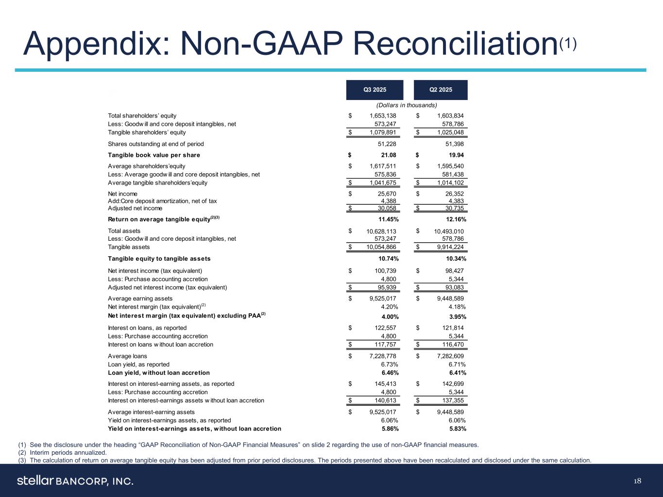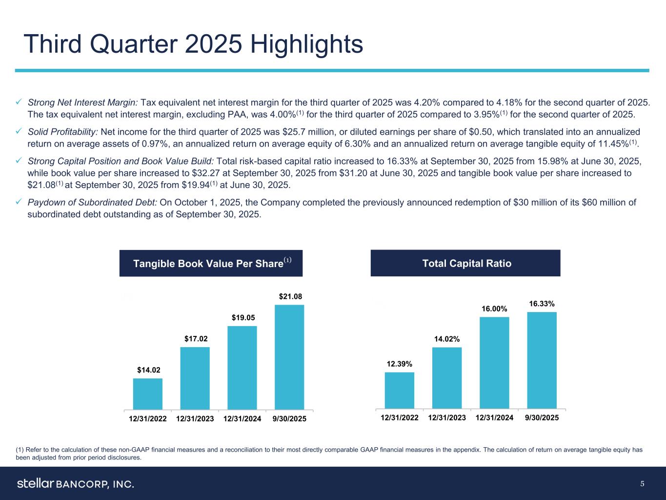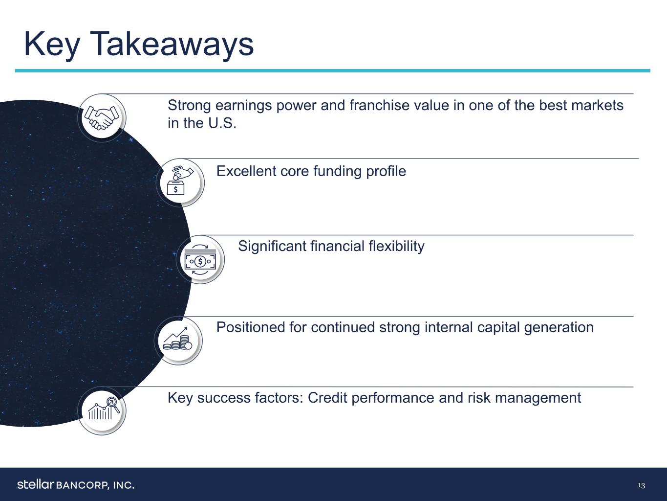 Forward-Looking Statements and Non-GAAP Financial Measures 2 Certain statements in this press release which are not historical in nature are intended to be, and are hereby identified as, “forward-looking statements” for purposes of the safe harbor provided by Section 27A of the Securities Act of 1933, as amended, and Section 21E of the Securities Exchange Act of 1934, as amended. These statements include, but are not limited to, statements about future financial performance of Stellar Bancorp, Inc. (the “Company”), operating results, plans, business and growth strategies, objectives, expectations and intentions, and other statements that are not historical facts, including projections of macroeconomic and industry trends, which are inherently unreliable due to the multiple factors that impact economic trends, and any such variations may be material. Forward-looking statements may be identified by terminology such as “may,” “will,” “should,” “could,” “scheduled,” “plans,” “intends,” “projects,” “anticipates,” “expects,” “believes,” “estimates,” “potential,” “would,” or “continue” or negatives of such terms or other comparable terminology. All forward-looking statements are not guarantees of future performance and are subject to risks, uncertainties and other factors that may cause the actual results, performance or achievements of the Company. Such factors include, among others: changes in the interest rate environment, the value of the Company’s assets and obligations and the availability of capital and liquidity; general competitive, economic, political and market conditions; and other factors that may affect future results of the Company including changes in asset quality and credit risk; the inability to sustain revenue and earnings growth; changes in interest rates and capital markets; inflation; customer borrowing, repayment, investment and deposit practices; the impact, extent and timing of technological changes; capital management activities; disruptions to the economy and the U.S. banking system; risks associated with uninsured deposits and responsive measures by federal or state governments or banking regulators; legislative changes, executive orders, regulatory actions and reforms of the Board of Governors of the Federal Reserve System, Federal Deposit Insurance Corporation and Texas Department of Banking. Additional factors which could affect the Company’s future results can be found in the Company’s Annual Report on Form 10-K, Quarterly Reports on Form 10-Q and Current Reports on Form 8-K, in each case filed with the SEC and available on the SEC’s website at www.sec.gov. We disclaim any obligation and do not intend to update or revise any forward-looking statements contained in this communication, which speak only as of the date hereof, whether as a result of new information, future events or otherwise, except as required by federal securities laws. As forward-looking statements involve significant risks and uncertainties, caution should be exercised against placing undue reliance on such statements. GAAP Reconciliation of Non-GAAP Financial Measures The Company’s management uses certain non-GAAP (generally accepted accounting principles) financial measures to evaluate its performance. The Company believes that these non- GAAP financial measures provide meaningful supplemental information regarding its performance and that management and investors benefit from referring to these non-GAAP financial measures in assessing the Company’s performance and when planning, forecasting, analyzing and comparing past, present and future periods. Specifically, the Company reviews pre-tax, pre-provision income, pre-tax pre-provision ROAA, tangible book value per share, return on average tangible equity, tangible equity to tangible assets and net interest margin (tax equivalent) excluding PAA for internal planning and forecasting purposes. The Company has included in this earnings release information relating to these non-GAAP financial measures for the applicable periods presented. These non-GAAP measures should not be considered in isolation or as a substitute for the most directly comparable or other financial measures calculated in accordance with GAAP. Moreover, the manner in which the Company calculates the non-GAAP financial measures may differ from that of other companies reporting measures with similar names.