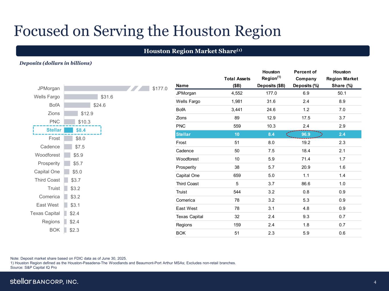 3 (1) Deposit market share based on FDIC data as of June 30, 2025. (2) Houston Region defined as the Houston-Pasadena-The Woodlands and Beaumont-Port Arthur MSAs; Excludes non-retail branches. (3) Purchase accounting accretion (“PAA”). Refer to the calculation of this non-GAAP financial measure and a reconciliation to its most directly comparable GAAP financial measure in the appendix. Houston’s Largest Regionally Focused Bank  Valuable franchise in one of the best markets in the U.S. • 6th in deposit market share for Houston region(1)(2) • 1st in deposit market share for Texas-based banks in the Houston region(1)(2) • 9th in deposit market share for Texas-based banks in the State of Texas(1) • Noninterest-bearing deposits to total deposits of 36.4% at September 30, 2025  Strong core earnings power and capital position for third quarter 2025 • Net interest margin (tax equivalent) of 4.20% • Net interest margin (tax equivalent) excluding purchase accounting adjustments of 4.00%(3) • Total capital ratio (to risk weighted-assets) of 16.33% Banking Centers Banking Centers 9/30/2025 6/30/2025 10,628,113$ 10,493,010$ 7,167,857 7,287,347 8,817,463 8,673,614 81.29% 84.02% 4.20% 4.18% 4.00% 3.95% 36.42% 36.71% 16.33% 15.98%Estimated Total capital ratio (to risk-weighted assets) Net interest margin (tax equivalent) Net interest margin (tax equivalent) excluding PAA(3) Noninterest-bearing deposits to total deposits (Dollars in thousands) Total assets Total loans Total deposits Total loans to total deposits