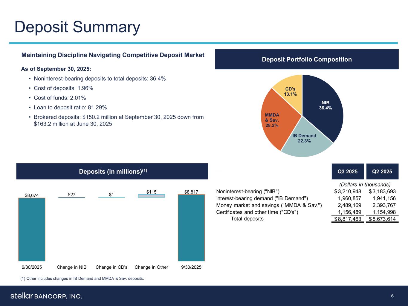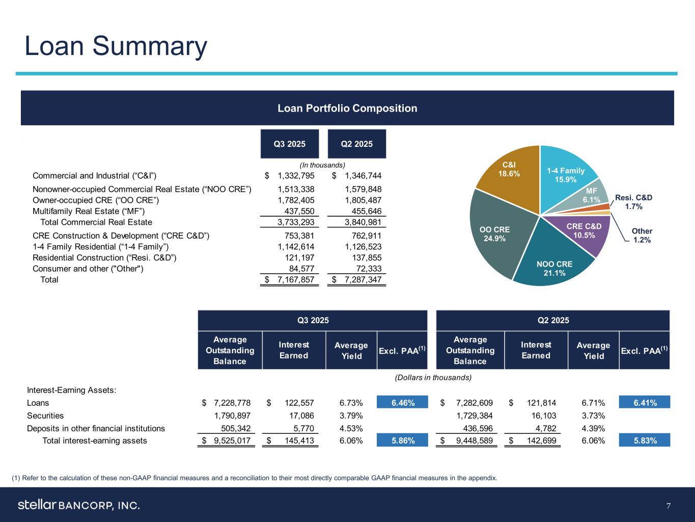 Deposit Summary 6 Deposit Portfolio Composition Deposits (in millions)(1) Maintaining Discipline Navigating Competitive Deposit Market As of September 30, 2025: • Noninterest-bearing deposits to total deposits: 36.4% • Cost of deposits: 1.96% • Cost of funds: 2.01% • Loan to deposit ratio: 81.29% • Brokered deposits: $150.2 million at September 30, 2025 down from $163.2 million at June 30, 2025 . (1) (1) Other includes changes in IB Demand and MMDA & Sav. deposits. Q3 2025 Q2 2025 Noninterest-bearing ("NIB") 3,210,948$ 3,183,693$ Interest-bearing demand ("IB Demand") 1,960,857 1,941,156 Money market and savings ("MMDA & Sav.") 2,489,169 2,393,767 Certificates and other time ("CD's") 1,156,489 1,154,998 Total deposits 8,817,463$ 8,673,614$ (Dollars in thousands) NIB 36.4% IB Demand 22.3% MMDA & Sav. 28.2% CD's 13.1% $8,674 $27 $1 $115 $8,817 6/30/2025 Change in NIB Change in CD's Change in Other 9/30/2025