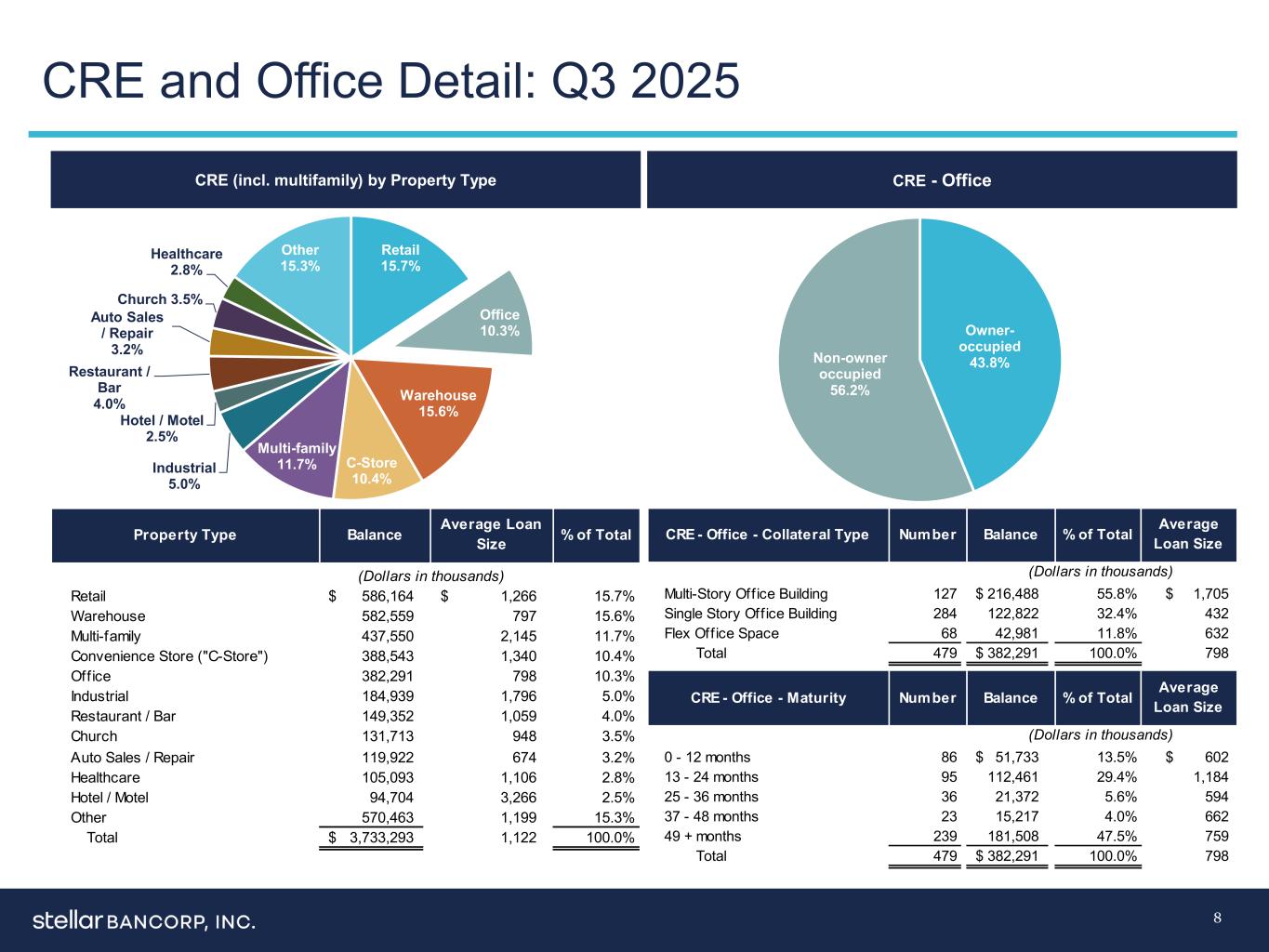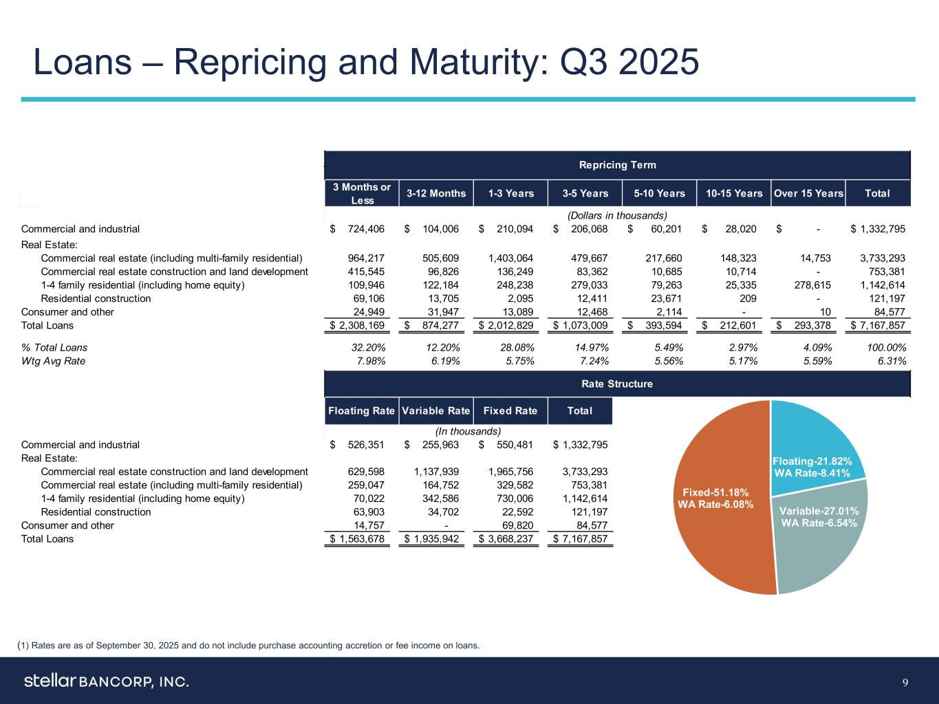 CRE and Office Detail: Q3 2025 8 (1) (1) CRE (incl. multifamily) by Property Type CRE - Office Retail 586,164$ 1,266$ 15.7% Warehouse 582,559 797 15.6% Multi-family 437,550 2,145 11.7% Convenience Store ("C-Store") 388,543 1,340 10.4% Office 382,291 798 10.3% Industrial 184,939 1,796 5.0% Restaurant / Bar 149,352 1,059 4.0% Church 131,713 948 3.5% Auto Sales / Repair 119,922 674 3.2% Healthcare 105,093 1,106 2.8% Hotel / Motel 94,704 3,266 2.5% Other 570,463 1,199 15.3% Total 3,733,293$ 1,122 100.0% (Dollars in thousands) Property Type Balance Average Loan Size % of Total Owner- occupied 43.8%Non-owner occupied 56.2% Retail 15.7% Office 10.3% Warehouse 15.6% C-Store 10.4% Multi-family 11.7%Industrial 5.0% Hotel / Motel 2.5% Restaurant / Bar 4.0% Auto Sales / Repair 3.2% Church 3.5% Healthcare 2.8% Other 15.3% Multi-Story Office Building 127 216,488$ 55.8% 1,705$ Single Story Office Building 284 122,822 32.4% 432 Flex Office Space 68 42,981 11.8% 632 Total 479 382,291$ 100.0% 798 0 - 12 months 86 51,733$ 13.5% 602$ 13 - 24 months 95 112,461 29.4% 1,184 25 - 36 months 36 21,372 5.6% 594 37 - 48 months 23 15,217 4.0% 662 49 + months 239 181,508 47.5% 759 Total 479 382,291$ 100.0% 798 Average Loan Size (Dollars in thousands) (Dollars in thousands) CRE - Office - Maturity Number BalanceCRE - Office - Collateral Type Number Balance % of Total % of Total Average Loan Size