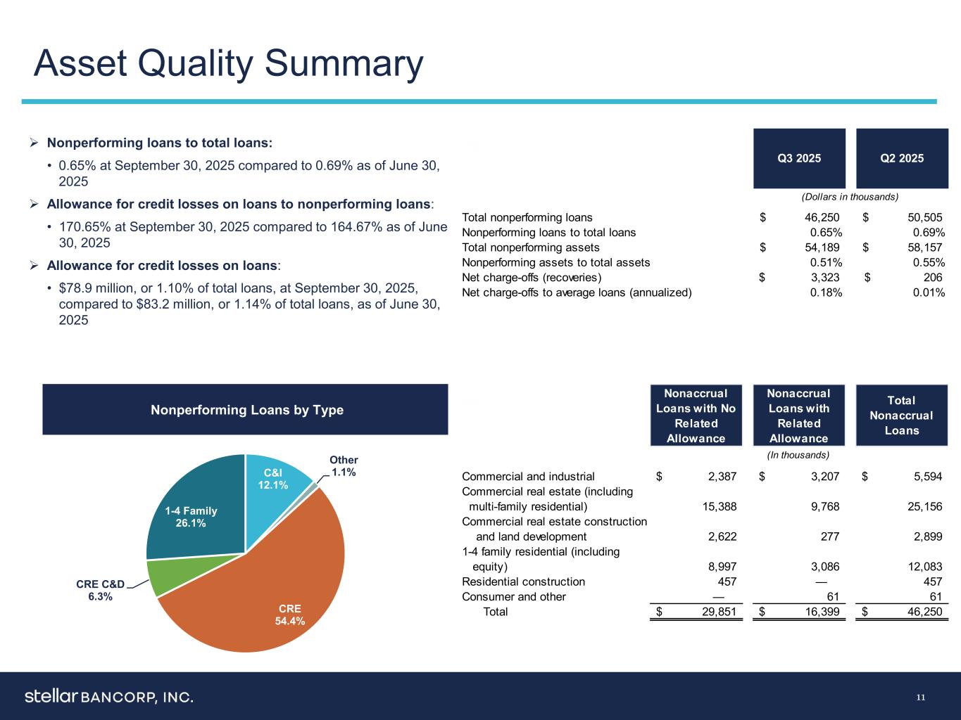 CRE Construction and Development: Q3 2025 10 (1) (1) • Total committed exposure for CRE construction loans was $1.23 billion at September 30, 2025 and $1.24 billion at June 30, 2025. • The largest category of CRE construction loans was Land – Commercial at $276.1 million outstanding, or 36.6%, of CRE construction loans at September 30, 2025. • Owner-occupied CRE construction loans were 16.8% of CRE construction loans at September 30, 2025. (1) Includes loans that are secured by commercial properties that are in some stage of construction, land with improvements but valued as and only with intent to remove and construct new structures in the future and raw land. (2) Multi-family community development loans (“Multi-family - CD”). CRE Construction Lending Highlights Number Balance Number Balance Land - Commercial(1) 366 276,051$ 754$ 391 280,812$ 718$ Multi-family - CD(2) 14 134,217 9,587 15 137,320 9,155 Other 87 93,700 1,077 87 92,540 1,064 Multi-family - Market Rate 8 64,948 8,119 9 62,518 6,946 Warehouse 28 63,877 2,281 30 71,448 2,382 Land - Residential Lot 210 63,182 301 215 47,969 223 Retail 15 31,601 2,107 13 37,384 2,876 Commercial Development 7 7,704 1,101 6 12,134 2,022 Residential Subdivision 8 18,101 2,263 9 20,786 2,310 Total 743 753,381$ 1,014 775 762,911$ 984 (Dollars in thousands) (Dollars in thousands) Loan Type Q3 2025 Q2 2025 Average Loan Size Average Loan Size Land - Commercial 36.6% Warehouse 8.5%Multi-family - CD 17.8% Multi-family - Market Rate 8.6% Residential Subdivision 2.4% Land - Residential Lot 8.4% Commercial Development 1.0% Retail 4.2% Other 12.5%