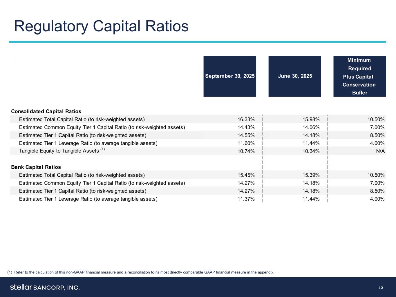 Asset Quality Summary 11 Nonperforming Loans by Type (1) Combined represents the simple addition of legacy balances for 2022; estimated.  Nonperforming loans to total loans: • 0.65% at September 30, 2025 compared to 0.69% as of June 30, 2025  Allowance for credit losses on loans to nonperforming loans: • 170.65% at September 30, 2025 compared to 164.67% as of June 30, 2025  Allowance for credit losses on loans: • $78.9 million, or 1.10% of total loans, at September 30, 2025, compared to $83.2 million, or 1.14% of total loans, as of June 30, 2025 Q3 2025 Q2 2025 Total nonperforming loans 46,250$ 50,505$ Nonperforming loans to total loans 0.65% 0.69% Total nonperforming assets 54,189$ 58,157$ 0.51% 0.55% Net charge-offs (recoveries) 3,323$ 206$ 0.18% 0.01% (Dollars in thousands) Nonperforming assets to total assets Net charge-offs to average loans (annualized) Nonaccrual Loans with No Related Allowance Nonaccrual Loans with Related Allowance Total Nonaccrual Loans Commercial and industrial 2,387$ 3,207$ 5,594$ Commercial real estate (including multi-family residential) 15,388 9,768 25,156 Commercial real estate construction and land development 2,622 277 2,899 1-4 family residential (including equity) 8,997 3,086 12,083 Residential construction 457 — 457 Consumer and other — 61 61 Total 29,851$ 16,399$ 46,250$ (In thousands) C&I 12.1% Other 1.1% CRE 54.4% CRE C&D 6.3% 1-4 Family 26.1%