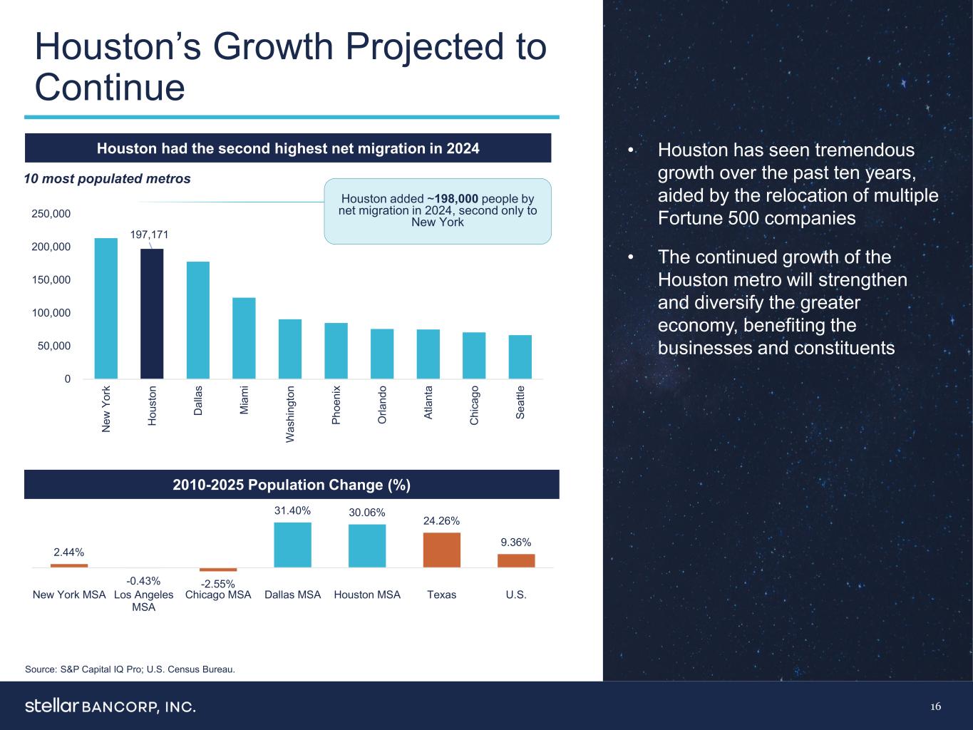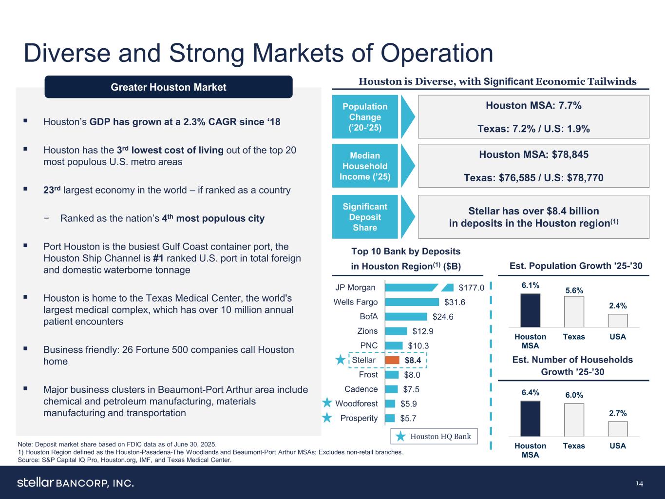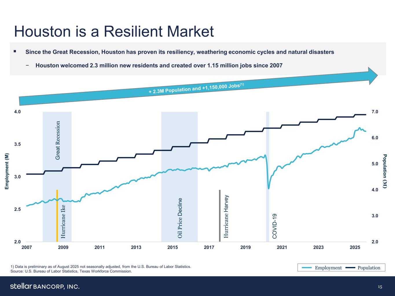 $5.7 $5.9 $7.5 $8.0 $8.4 $10.3 $12.9 $24.6 $31.6 $177.0 Prosperity Woodforest Cadence Frost Stellar PNC Zions BofA Wells Fargo JP Morgan 6.1% 5.6% 2.4% Houston MSA Texas USA 6.4% 6.0% 2.7% Houston MSA Texas USA Diverse and Strong Markets of Operation 14 Houston is Diverse, with Significant Economic TailwindsGreater Houston Market  Houston’s GDP has grown at a 2.3% CAGR since ‘18  Houston has the 3rd lowest cost of living out of the top 20 most populous U.S. metro areas  23rd largest economy in the world – if ranked as a country − Ranked as the nation’s 4th most populous city  Port Houston is the busiest Gulf Coast container port, the Houston Ship Channel is #1 ranked U.S. port in total foreign and domestic waterborne tonnage  Houston is home to the Texas Medical Center, the world's largest medical complex, which has over 10 million annual patient encounters  Business friendly: 26 Fortune 500 companies call Houston home  Major business clusters in Beaumont-Port Arthur area include chemical and petroleum manufacturing, materials manufacturing and transportation Top 10 Bank by Deposits in Houston Region(1) ($B) Note: Deposit market share based on FDIC data as of June 30, 2025. 1) Houston Region defined as the Houston-Pasadena-The Woodlands and Beaumont-Port Arthur MSAs; Excludes non-retail branches. Source: S&P Capital IQ Pro, Houston.org, IMF, and Texas Medical Center. Est. Population Growth ’25-’30 Est. Number of Households Growth ’25-’30 Population Change (’20-’25) Median Household Income (’25) Significant Deposit Share Houston MSA: 7.7% Texas: 7.2% / U.S: 1.9% Houston MSA: $78,845 Texas: $76,585 / U.S: $78,770 Stellar has over $8.4 billion in deposits in the Houston region(1) Houston HQ Bank