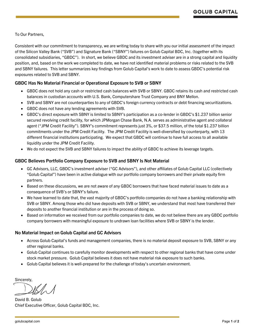 golubcapital.com Page 1 of 2 To Our Partners, Consistent with our commitment to transparency, we are writing today to share with you our initial assessment of the impact of the Silicon Valley Bank (“SVB”) and Signature Bank (“SBNY”) failures on Golub Capital BDC, Inc. (together with its consolidated subsidiaries, “GBDC”). In short, we believe GBDC and its investment adviser are in a strong capital and liquidity position, and, based on the work we completed to date, we have not identified material problems or risks related to the SVB and SBNY failures. This letter summarizes key findings from Golub Capital’s work to date to assess GBDC’s potential risk exposures related to SVB and SBNY. GBDC Has No Material Financial or Operational Exposure to SVB or SBNY • GBDC does not hold any cash or restricted cash balances with SVB or SBNY. GBDC retains its cash and restricted cash balances in custodian accounts with U.S. Bank, Computershare Trust Company and BNY Mellon. • SVB and SBNY are not counterparties to any of GBDC’s foreign currency contracts or debt financing securitizations. • GBDC does not have any lending agreements with SVB. • GBDC’s direct exposure with SBNY is limited to SBNY’s participation as a co-lender in GBDC’s $1.237 billion senior secured revolving credit facility, for which JPMorgan Chase Bank, N.A. serves as administrative agent and collateral agent (“JPM Credit Facility”). SBNY’s commitment represents just 3%, or $37.5 million, of the total $1.237 billion commitments under the JPM Credit Facility. The JPM Credit Facility is well-diversified by counterparty, with 13 different financial institutions participating. We expect that GBDC will continue to have full access to all available liquidity under the JPM Credit Facility. • We do not expect the SVB and SBNY failures to impact the ability of GBDC to achieve its leverage targets. GBDC Believes Portfolio Company Exposure to SVB and SBNY Is Not Material • GC Advisors, LLC, GBDC’s investment adviser (“GC Advisors”), and other affiliates of Golub Capital LLC (collectively “Golub Capital”) have been in active dialogue with our portfolio company borrowers and their private equity firm partners. • Based on these discussions, we are not aware of any GBDC borrowers that have faced material issues to date as a consequence of SVB’s or SBNY’s failure. • We have learned to date that, the vast majority of GBDC's portfolio companies do not have a banking relationship with SVB or SBNY. Among those who did have deposits with SVB or SBNY, we understand that most have transferred their deposits to another financial institution or are in the process of doing so. • Based on information we received from our portfolio companies to date, we do not believe there are any GBDC portfolio company borrowers with meaningful exposure to undrawn loan facilities where SVB or SBNY is the lender. No Material Impact on Golub Capital and GC Advisors • Across Golub Capital’s funds and management companies, there is no material deposit exposure to SVB, SBNY or any other regional banks. • Golub Capital continues to carefully monitor developments with respect to other regional banks that have come under stock market pressure. Golub Capital believes it does not have material risk exposure to such banks. • Golub Capital believes it is well-prepared for the challenge of today’s uncertain environment. Sincerely, David B. Golub Chief Executive Officer, Golub Capital BDC, Inc.
