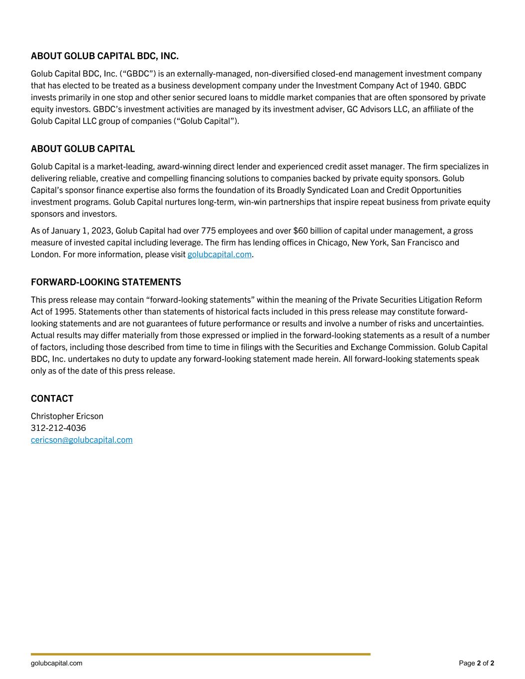 golubcapital.com Page 2 of 2 ABOUT GOLUB CAPITAL BDC, INC. Golub Capital BDC, Inc. (“GBDC”) is an externally-managed, non-diversified closed-end management investment company that has elected to be treated as a business development company under the Investment Company Act of 1940. GBDC invests primarily in one stop and other senior secured loans to middle market companies that are often sponsored by private equity investors. GBDC’s investment activities are managed by its investment adviser, GC Advisors LLC, an affiliate of the Golub Capital LLC group of companies (“Golub Capital”). ABOUT GOLUB CAPITAL Golub Capital is a market-leading, award-winning direct lender and experienced credit asset manager. The firm specializes in delivering reliable, creative and compelling financing solutions to companies backed by private equity sponsors. Golub Capital’s sponsor finance expertise also forms the foundation of its Broadly Syndicated Loan and Credit Opportunities investment programs. Golub Capital nurtures long-term, win-win partnerships that inspire repeat business from private equity sponsors and investors. As of January 1, 2023, Golub Capital had over 775 employees and over $60 billion of capital under management, a gross measure of invested capital including leverage. The firm has lending offices in Chicago, New York, San Francisco and London. For more information, please visit golubcapital.com. FORWARD-LOOKING STATEMENTS This press release may contain “forward-looking statements” within the meaning of the Private Securities Litigation Reform Act of 1995. Statements other than statements of historical facts included in this press release may constitute forward- looking statements and are not guarantees of future performance or results and involve a number of risks and uncertainties. Actual results may differ materially from those expressed or implied in the forward-looking statements as a result of a number of factors, including those described from time to time in filings with the Securities and Exchange Commission. Golub Capital BDC, Inc. undertakes no duty to update any forward-looking statement made herein. All forward-looking statements speak only as of the date of this press release. CONTACT Christopher Ericson 312-212-4036 cericson@golubcapital.com