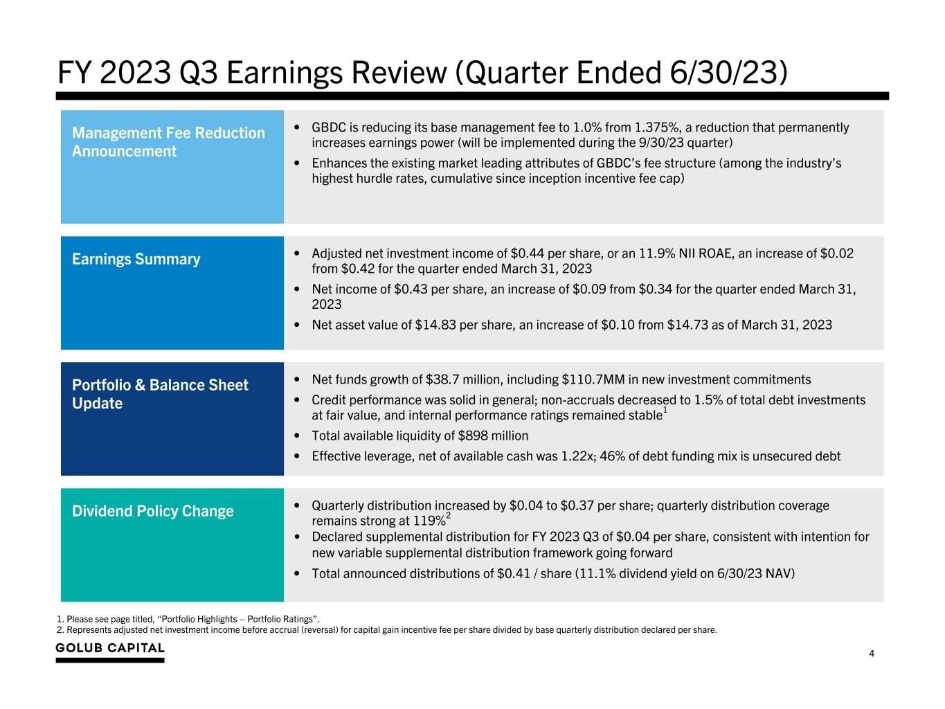 FY 2023 Q3 Earnings Review (Quarter Ended 6/30/23) • GBDC is reducing its base management fee to 1.0% from 1.375%, a reduction that permanently increases earnings power (will be implemented during the 9/30/23 quarter) • Enhances the existing market leading attributes of GBDC’s fee structure (among the industry’s highest hurdle rates, cumulative since inception incentive fee cap) Management Fee Reduction Announcement • Adjusted net investment income of $0.44 per share, or an 11.9% NII ROAE, an increase of $0.02 from $0.42 for the quarter ended March 31, 2023 • Net income of $0.43 per share, an increase of $0.09 from $0.34 for the quarter ended March 31, 2023 • Net asset value of $14.83 per share, an increase of $0.10 from $14.73 as of March 31, 2023 Earnings Summary • Net funds growth of $38.7 million, including $110.7MM in new investment commitments • Credit performance was solid in general; non-accruals decreased to 1.5% of total debt investments at fair value, and internal performance ratings remained stable1 • Total available liquidity of $898 million • Effective leverage, net of available cash was 1.22x; 46% of debt funding mix is unsecured debt Portfolio & Balance Sheet Update • Quarterly distribution increased by $0.04 to $0.37 per share; quarterly distribution coverage remains strong at 119%2 • Declared supplemental distribution for FY 2023 Q3 of $0.04 per share, consistent with intention for new variable supplemental distribution framework going forward • Total announced distributions of $0.41 / share (11.1% dividend yield on 6/30/23 NAV) Dividend Policy Change 1. Please see page titled, “Portfolio Highlights – Portfolio Ratings”. 2. Represents adjusted net investment income before accrual (reversal) for capital gain incentive fee per share divided by base quarterly distribution declared per share. 4