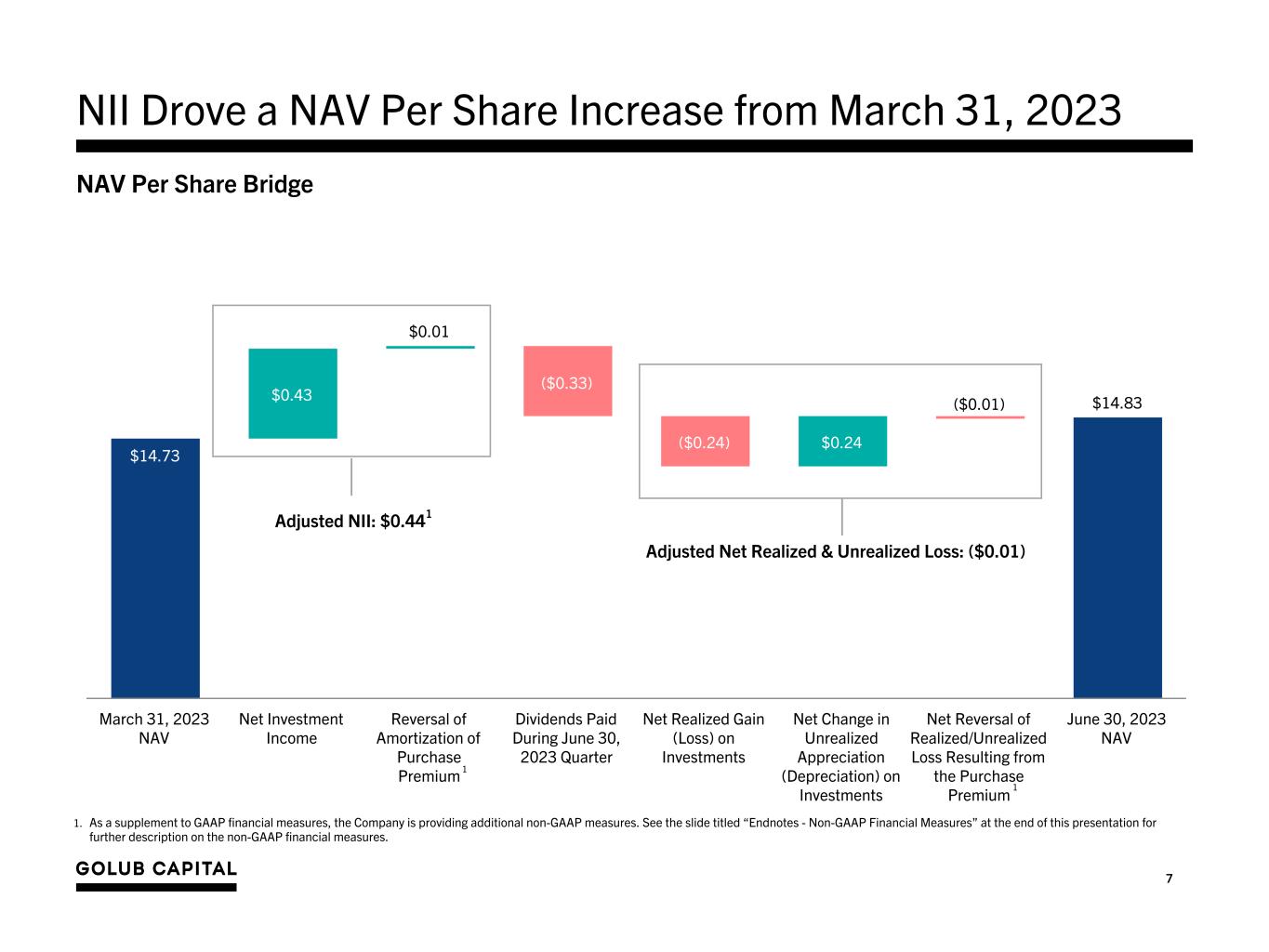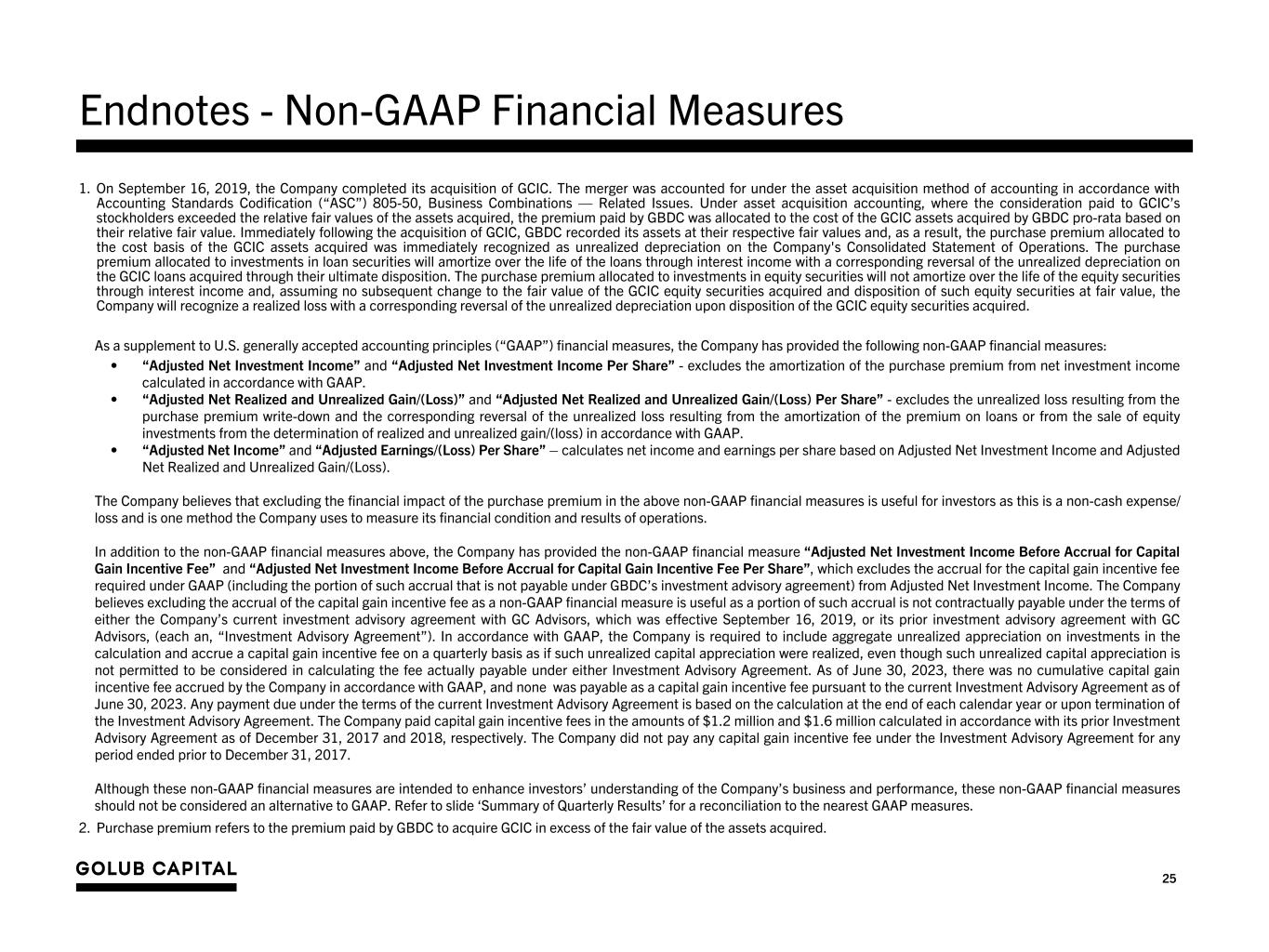 25 Endnotes - Non-GAAP Financial Measures 1. On September 16, 2019, the Company completed its acquisition of GCIC. The merger was accounted for under the asset acquisition method of accounting in accordance with Accounting Standards Codification (“ASC”) 805-50, Business Combinations — Related Issues. Under asset acquisition accounting, where the consideration paid to GCIC’s stockholders exceeded the relative fair values of the assets acquired, the premium paid by GBDC was allocated to the cost of the GCIC assets acquired by GBDC pro-rata based on their relative fair value. Immediately following the acquisition of GCIC, GBDC recorded its assets at their respective fair values and, as a result, the purchase premium allocated to the cost basis of the GCIC assets acquired was immediately recognized as unrealized depreciation on the Company's Consolidated Statement of Operations. The purchase premium allocated to investments in loan securities will amortize over the life of the loans through interest income with a corresponding reversal of the unrealized depreciation on the GCIC loans acquired through their ultimate disposition. The purchase premium allocated to investments in equity securities will not amortize over the life of the equity securities through interest income and, assuming no subsequent change to the fair value of the GCIC equity securities acquired and disposition of such equity securities at fair value, the Company will recognize a realized loss with a corresponding reversal of the unrealized depreciation upon disposition of the GCIC equity securities acquired. As a supplement to U.S. generally accepted accounting principles (“GAAP”) financial measures, the Company has provided the following non-GAAP financial measures: • “Adjusted Net Investment Income” and “Adjusted Net Investment Income Per Share” - excludes the amortization of the purchase premium from net investment income calculated in accordance with GAAP. • “Adjusted Net Realized and Unrealized Gain/(Loss)” and “Adjusted Net Realized and Unrealized Gain/(Loss) Per Share” - excludes the unrealized loss resulting from the purchase premium write-down and the corresponding reversal of the unrealized loss resulting from the amortization of the premium on loans or from the sale of equity investments from the determination of realized and unrealized gain/(loss) in accordance with GAAP. • “Adjusted Net Income” and “Adjusted Earnings/(Loss) Per Share” – calculates net income and earnings per share based on Adjusted Net Investment Income and Adjusted Net Realized and Unrealized Gain/(Loss). The Company believes that excluding the financial impact of the purchase premium in the above non-GAAP financial measures is useful for investors as this is a non-cash expense/ loss and is one method the Company uses to measure its financial condition and results of operations. In addition to the non-GAAP financial measures above, the Company has provided the non-GAAP financial measure “Adjusted Net Investment Income Before Accrual for Capital Gain Incentive Fee” and “Adjusted Net Investment Income Before Accrual for Capital Gain Incentive Fee Per Share”, which excludes the accrual for the capital gain incentive fee required under GAAP (including the portion of such accrual that is not payable under GBDC’s investment advisory agreement) from Adjusted Net Investment Income. The Company believes excluding the accrual of the capital gain incentive fee as a non-GAAP financial measure is useful as a portion of such accrual is not contractually payable under the terms of either the Company’s current investment advisory agreement with GC Advisors, which was effective September 16, 2019, or its prior investment advisory agreement with GC Advisors, (each an, “Investment Advisory Agreement”). In accordance with GAAP, the Company is required to include aggregate unrealized appreciation on investments in the calculation and accrue a capital gain incentive fee on a quarterly basis as if such unrealized capital appreciation were realized, even though such unrealized capital appreciation is not permitted to be considered in calculating the fee actually payable under either Investment Advisory Agreement. As of June 30, 2023, there was no cumulative capital gain incentive fee accrued by the Company in accordance with GAAP, and none was payable as a capital gain incentive fee pursuant to the current Investment Advisory Agreement as of June 30, 2023. Any payment due under the terms of the current Investment Advisory Agreement is based on the calculation at the end of each calendar year or upon termination of the Investment Advisory Agreement. The Company paid capital gain incentive fees in the amounts of $1.2 million and $1.6 million calculated in accordance with its prior Investment Advisory Agreement as of December 31, 2017 and 2018, respectively. The Company did not pay any capital gain incentive fee under the Investment Advisory Agreement for any period ended prior to December 31, 2017. Although these non-GAAP financial measures are intended to enhance investors’ understanding of the Company’s business and performance, these non-GAAP financial measures should not be considered an alternative to GAAP. Refer to slide ‘Summary of Quarterly Results’ for a reconciliation to the nearest GAAP measures. 2. Purchase premium refers to the premium paid by GBDC to acquire GCIC in excess of the fair value of the assets acquired.