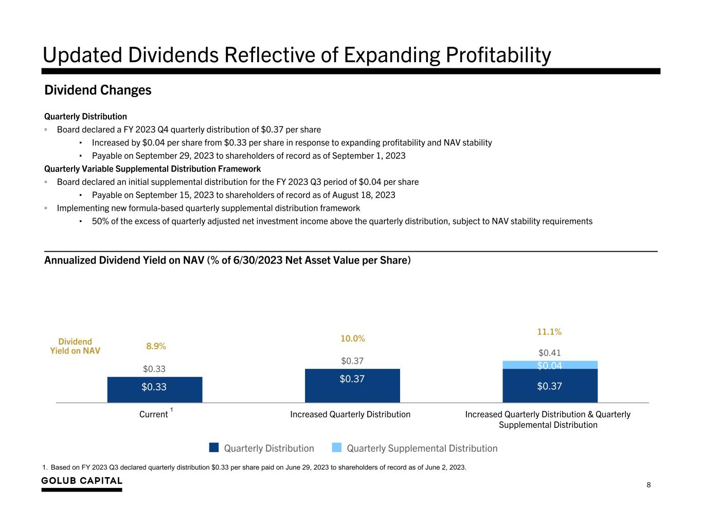 7 $14.73 $0.43 $0.01 ($0.33) ($0.24) $0.24 ($0.01) $14.83 March 31, 2023 NAV Net Investment Income Reversal of Amortization of Purchase Premium Dividends Paid During June 30, 2023 Quarter Net Realized Gain (Loss) on Investments Net Change in Unrealized Appreciation (Depreciation) on Investments Net Reversal of Realized/Unrealized Loss Resulting from the Purchase Premium June 30, 2023 NAV NII Drove a NAV Per Share Increase from March 31, 2023 NAV Per Share Bridge Adjusted Net Realized & Unrealized Loss: ($0.01) 1. As a supplement to GAAP financial measures, the Company is providing additional non-GAAP measures. See the slide titled “Endnotes - Non-GAAP Financial Measures” at the end of this presentation for further description on the non-GAAP financial measures. 1 Adjusted NII: $0.441 1
