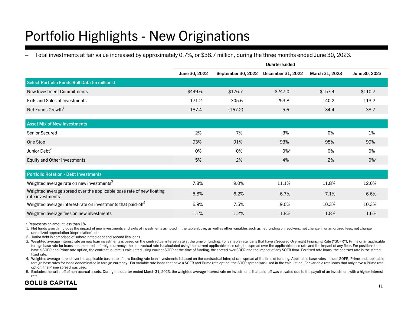 10 Summary of Quarterly Results Quarter Ended June 30, 2022 September 30, 2022 December 31, 2022 March 31, 2023 June 30, 2023 Net Investment Income Per Share Net investment income per share $0.32 $0.32 $0.36 $0.41 $0.43 Amortization of purchase premium per share1 0.02 0.01 0.01 0.01 0.01 Adjusted net investment income per share1 $0.34 $0.33 $0.37 $0.42 $0.44 Accrual (reversal) for capital gain incentive fee per share (0.03) 0.00 0.00 0.00 0.00 Adjusted net investment income before accrual (reversal) for capital gain incentive fee per share1 $0.31 $0.33 $0.37 $0.42 $0.44 Net Realized/Unrealized Gain (Loss) Per Share Net realized/unrealized gain (loss) per share ($0.23) ($0.27) ($0.21) ($0.07) $0.00* Net reversal of realized/unrealized loss resulting from the purchase premium per share1 (0.02) (0.01) (0.01) (0.01) (0.01) Adjusted net realized/unrealized gain (loss) per share1 $(0.25) ($0.28) ($0.22) ($0.08) ($0.01) Earnings (Loss) Per Share Earnings (loss) per share $0.09 $0.05 $0.15 $0.34 $0.43 Adjusted earnings (loss) per share1 $0.09 $0.05 $0.15 $0.34 $0.43 Net Asset Value Per Share $15.14 $14.89 $14.71 $14.73 $14.83 Distributions paid per share $0.30 $0.30 $0.33 $0.33 $0.33 A B A B+ • Represents an amount less than $0.01. 1. As a supplement to GAAP financial measures, the Company is providing additional non-GAAP measures. See the slide titled “Endnotes - Non-GAAP Financial Measures” at the end of this presentation for further description on the non-GAAP financial measures.