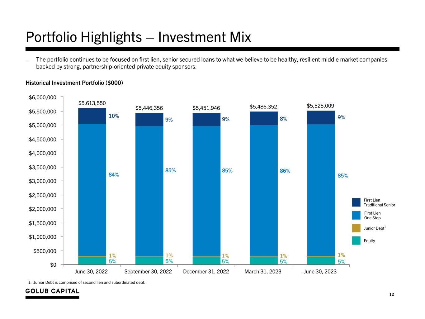 11 Portfolio Highlights - New Originations Quarter Ended June 30, 2022 September 30, 2022 December 31, 2022 March 31, 2023 June 30, 2023 Select Portfolio Funds Roll Data (in millions) New Investment Commitments $449.6 $176.7 $247.0 $157.4 $110.7 Exits and Sales of Investments 171.2 305.6 253.8 140.2 113.2 Net Funds Growth1 187.4 (167.2) 5.6 34.4 38.7 Asset Mix of New Investments Senior Secured 2% 7% 3% 0% 1% One Stop 93% 91% 93% 98% 99% Junior Debt2 0% 0% 0%* 0% 0% Equity and Other Investments 5% 2% 4% 2% 0%* Portfolio Rotation - Debt Investments Weighted average rate on new investments3 7.8% 9.0% 11.1% 11.8% 12.0% Weighted average spread over the applicable base rate of new floating rate investments4 5.8% 6.2% 6.7% 7.1% 6.6% Weighted average interest rate on investments that paid-off5 6.9% 7.5% 9.0% 10.3% 10.3% Weighted average fees on new investments 1.1% 1.2% 1.8% 1.8% 1.6% * Represents an amount less than 1% 1. Net funds growth includes the impact of new investments and exits of investments as noted in the table above, as well as other variables such as net funding on revolvers, net change in unamortized fees, net change in unrealized appreciation (depreciation), etc. 2. Junior debt is comprised of subordinated debt and second lien loans. 3. Weighted average interest rate on new loan investments is based on the contractual interest rate at the time of funding. For variable rate loans that have a Secured Overnight Financing Rate (“SOFR”), Prime or an applicable foreign base rate for loans denominated in foreign currency, the contractual rate is calculated using the current applicable base rate, the spread over the applicable base rate and the impact of any floor. For positions that have a SOFR and Prime rate option, the contractual rate is calculated using current SOFR at the time of funding, the spread over SOFR and the impact of any SOFR floor. For fixed rate loans, the contract rate is the stated fixed rate. 4. Weighted average spread over the applicable base rate of new floating rate loan investments is based on the contractual interest rate spread at the time of funding. Applicable base rates include SOFR, Prime and applicable foreign base rates for loans denominated in foreign currency. For variable rate loans that have a SOFR and Prime rate option, the SOFR spread was used in the calculation. For variable rate loans that only have a Prime rate option, the Prime spread was used. 5. Excludes the write-off of non-accrual assets. During the quarter ended March 31, 2023, the weighted average interest rate on investments that paid-off was elevated due to the payoff of an investment with a higher interest rate. – Total investments at fair value increased by approximately 0.7%, or $38.7 million, during the three months ended June 30, 2023.