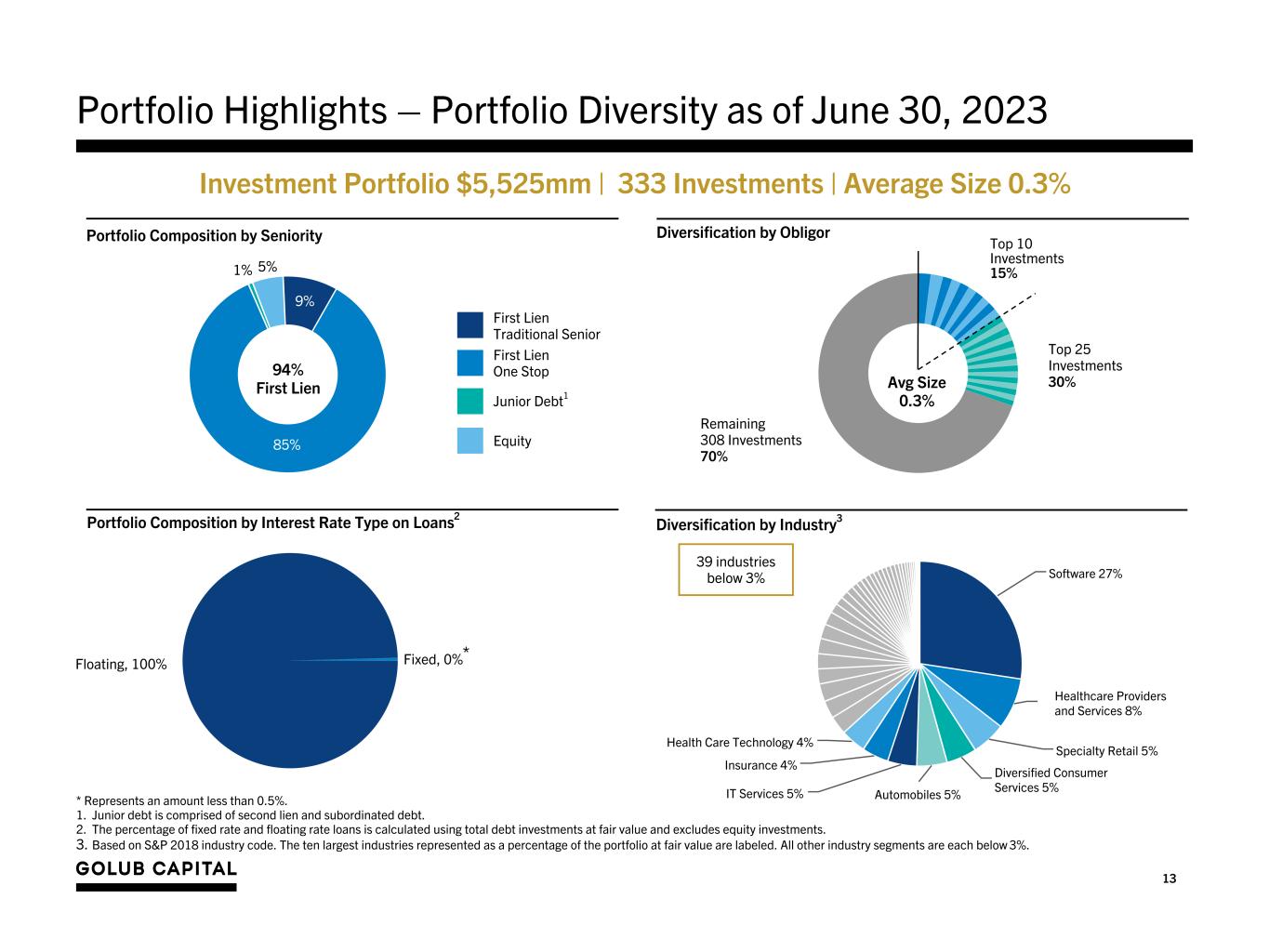 12 $5,613,550 $5,446,356 $5,451,946 $5,486,352 $5,525,009 June 30, 2022 September 30, 2022 December 31, 2022 March 31, 2023 June 30, 2023 $0 $500,000 $1,000,000 $1,500,000 $2,000,000 $2,500,000 $3,000,000 $3,500,000 $4,000,000 $4,500,000 $5,000,000 $5,500,000 $6,000,000 Portfolio Highlights – Investment Mix – The portfolio continues to be focused on first lien, senior secured loans to what we believe to be healthy, resilient middle market companies backed by strong, partnership-oriented private equity sponsors. Historical Investment Portfolio ($000) Equity Junior Debt1 First Lien Traditional Senior 1. Junior Debt is comprised of second lien and subordinated debt. 10% 84% 5% 1% 9% 85% 5% 1% 9% 85% 5% 1% 8% 86% 5% 1% 9% 85% 5% 1% First Lien One Stop