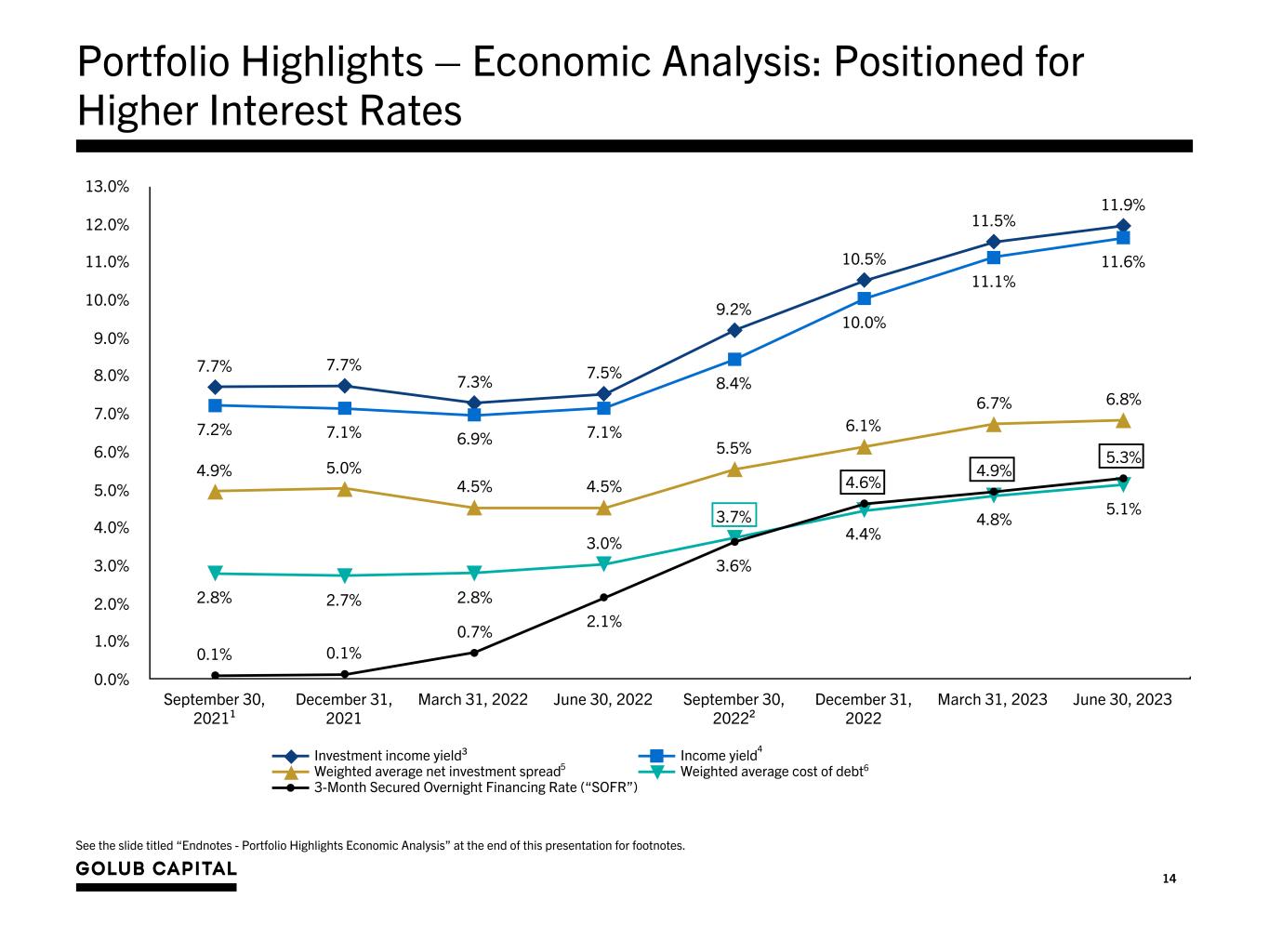14 See the slide titled “Endnotes - Portfolio Highlights Economic Analysis” at the end of this presentation for footnotes. Portfolio Highlights – Economic Analysis: Positioned for Higher Interest Rates 7.7% 7.7% 7.3% 7.5% 9.2% 10.5% 11.5% 11.9% 7.2% 7.1% 6.9% 7.1% 8.4% 10.0% 11.1% 11.6% 4.9% 5.0% 4.5% 4.5% 5.5% 6.1% 6.7% 6.8% 2.8% 2.7% 2.8% 3.0% 3.7% 4.4% 4.8% 5.1% 0.1% 0.1% 0.7% 2.1% 3.6% 4.6% 4.9% 5.3% Investment income yield³ Income yield Weighted average net investment spread Weighted average cost of debt 3-Month Secured Overnight Financing Rate (“SOFR”) September 30, 2021¹ December 31, 2021 March 31, 2022 June 30, 2022 September 30, 2022² December 31, 2022 March 31, 2023 June 30, 2023 0.0% 1.0% 2.0% 3.0% 4.0% 5.0% 6.0% 7.0% 8.0% 9.0% 10.0% 11.0% 12.0% 13.0% 4 65